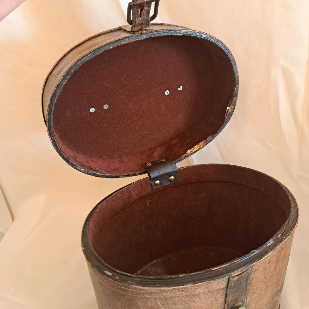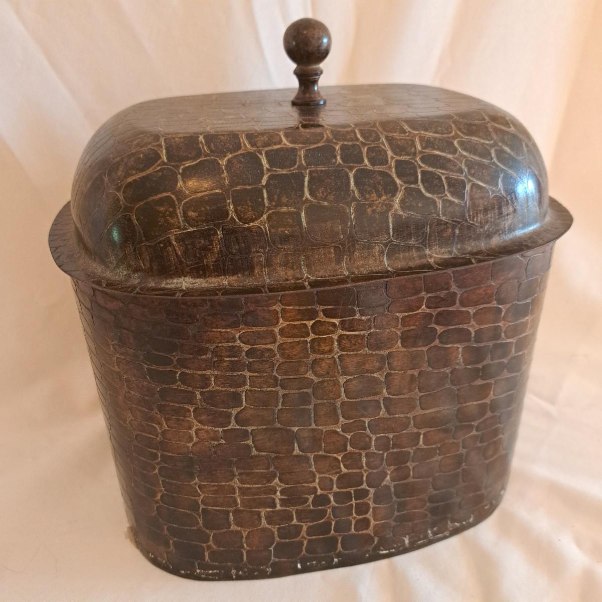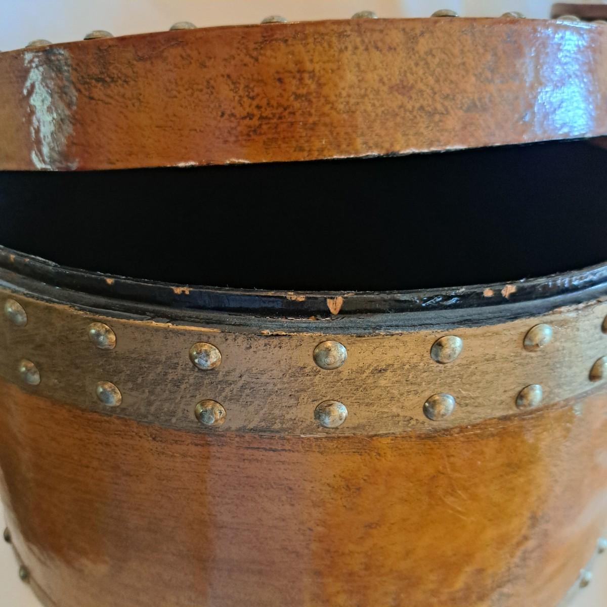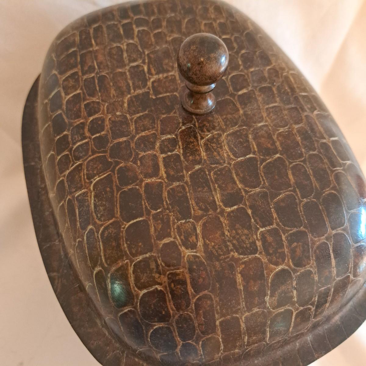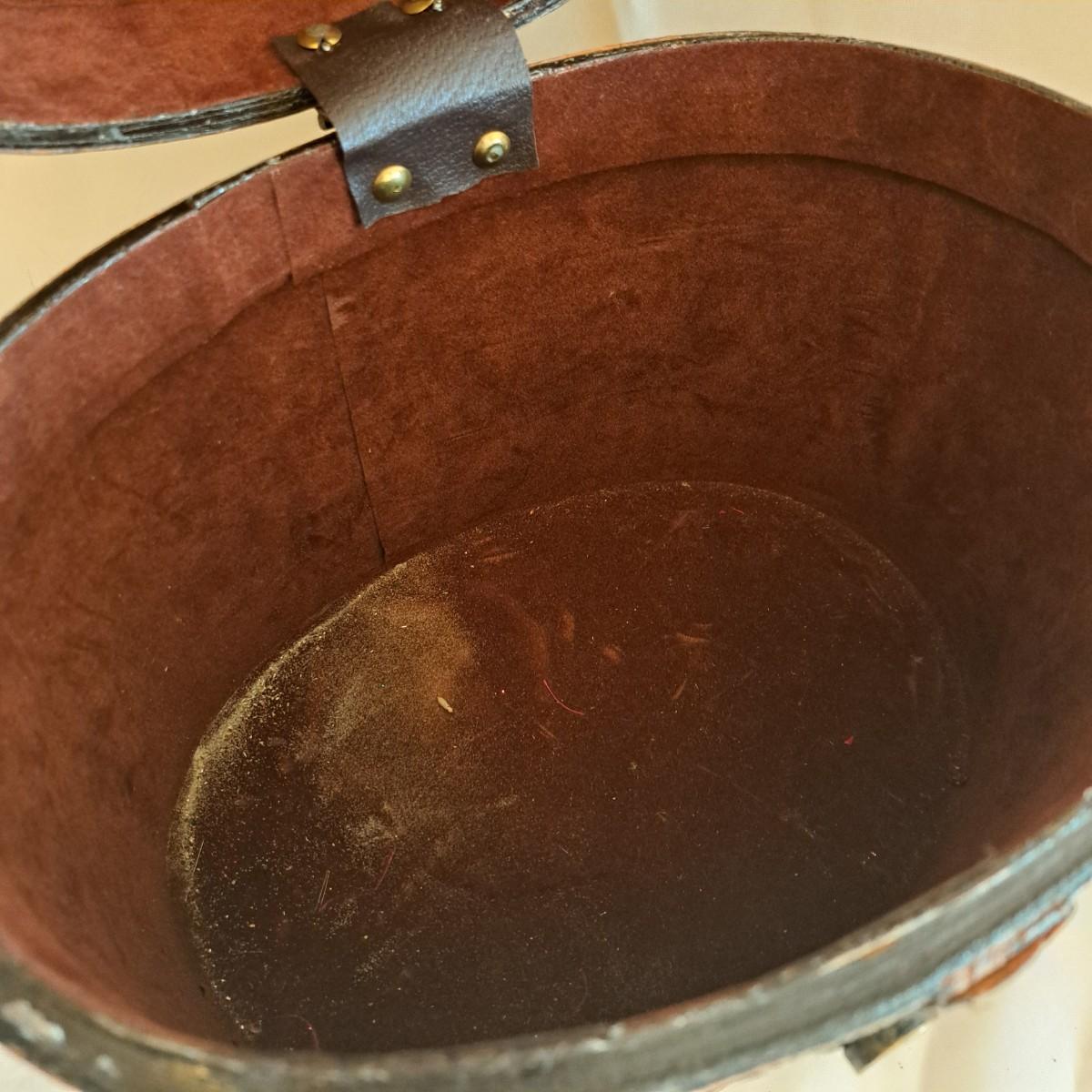 A threesome of somewhat distressed faux leather, wood and metal boxes ranging from 8.5"D x 9.5"H to 14"D x 9"H. Largest wooden round box has brass detail (side strips and studs) and is lined with velvet inside. The middle faux leather box is more like a carrying case with handle and has a strap with buckle - and magnetic snap - that opens to reveal a brown velveteen interior. Of note: the hole holding the buckle is slightly ripped as shown. The third brown and black box with lid has an exterior that mimics alligator scales and has a Made in India sticker at bottom. Shipping available.