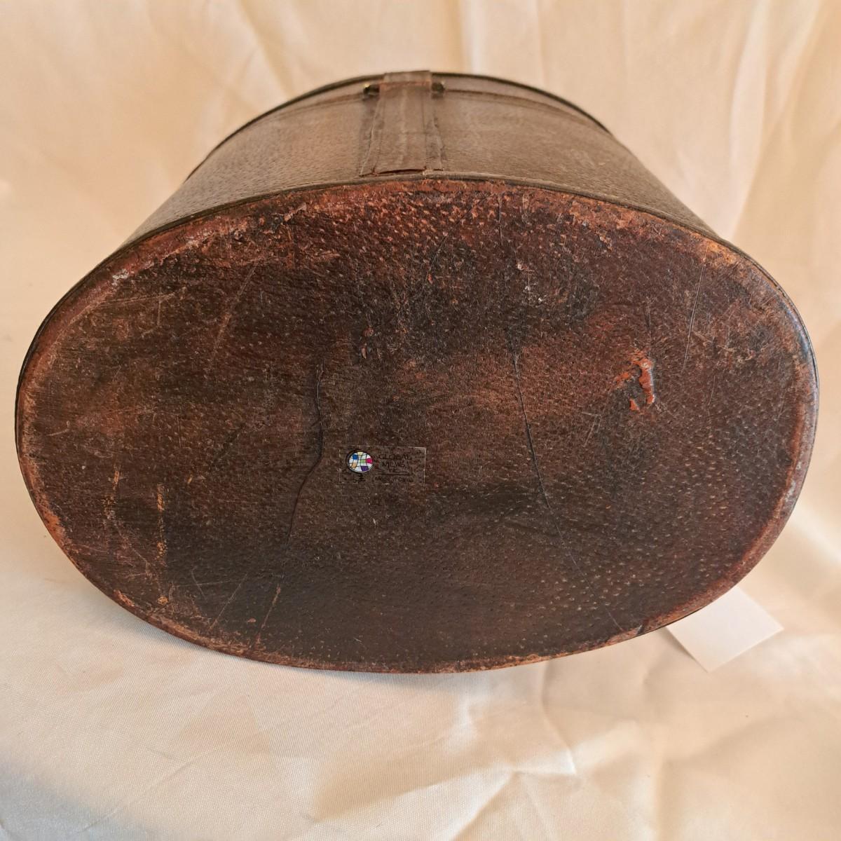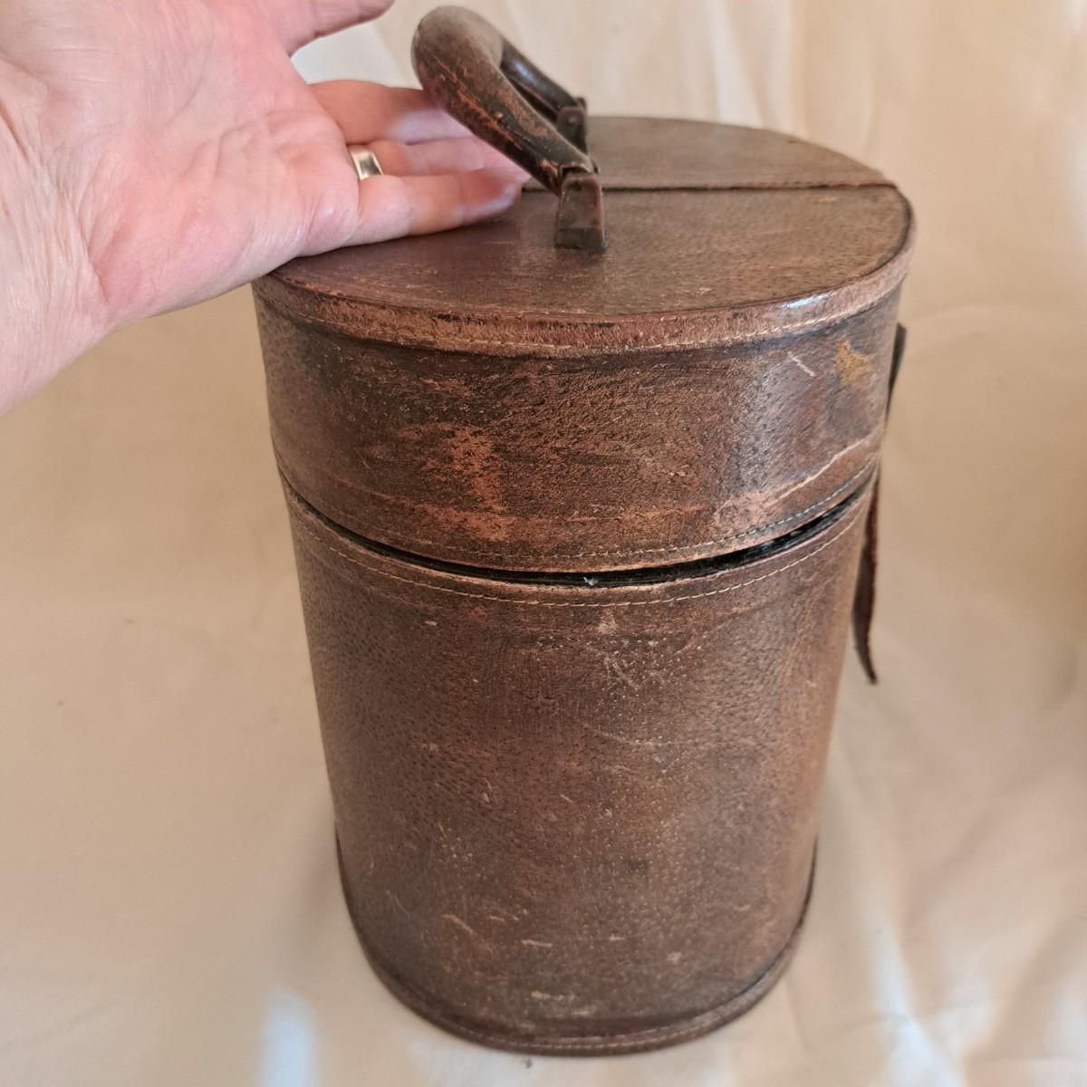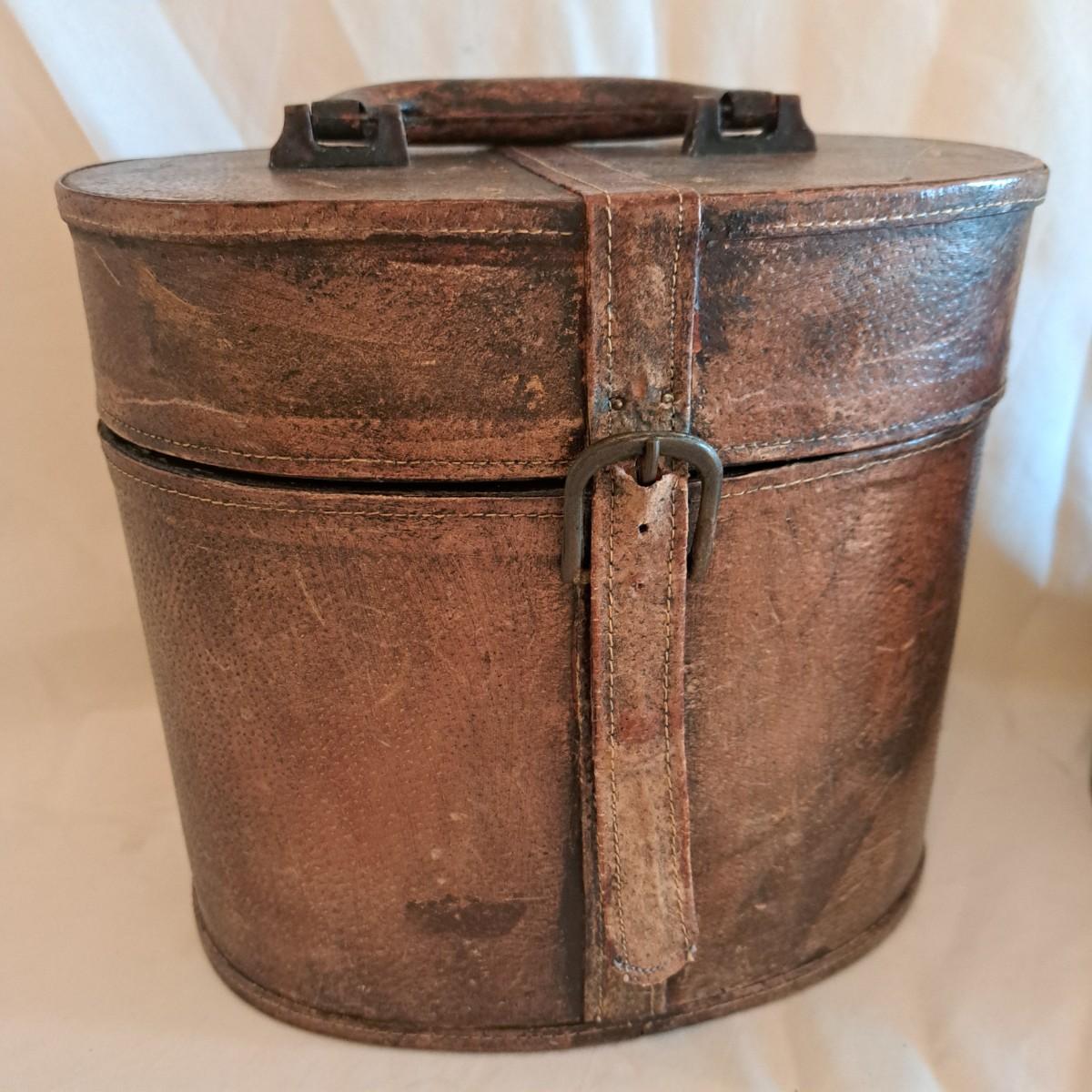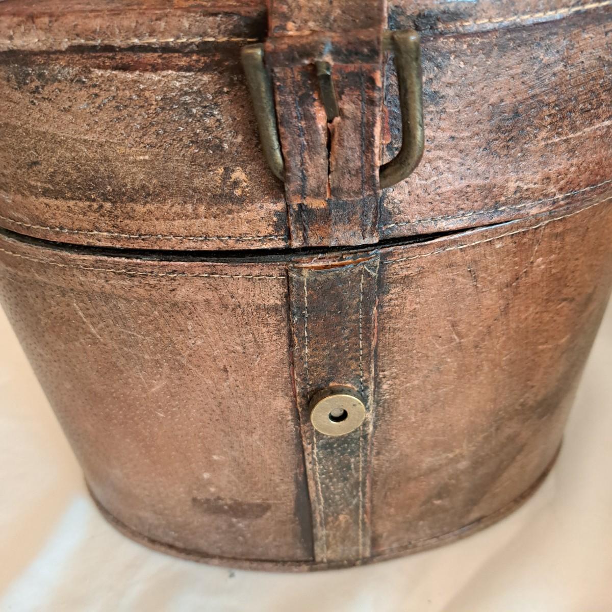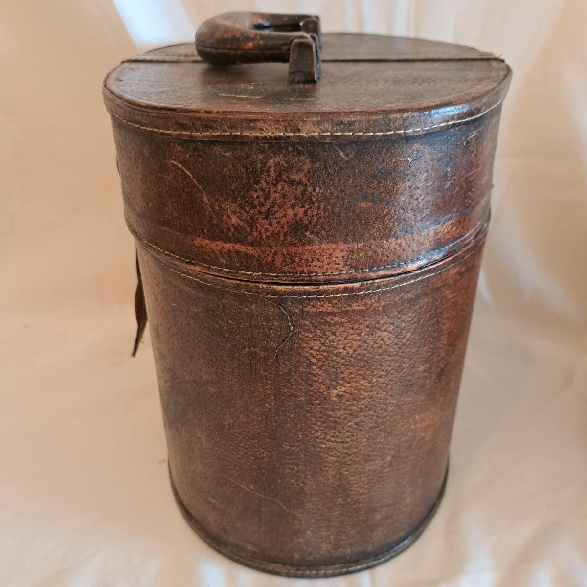 A threesome of somewhat distressed faux leather, wood and metal boxes ranging from 8.5"D x 9.5"H to 14"D x 9"H. Largest wooden round box has brass detail (side strips and studs) and is lined with velvet inside. The middle faux leather box is more like a carrying case with handle and has a strap with buckle - and magnetic snap - that opens to reveal a brown velveteen interior. Of note: the hole holding the buckle is slightly ripped as shown. The third brown and black box with lid has an exterior that mimics alligator scales and has a Made in India sticker at bottom. Shipping available.
