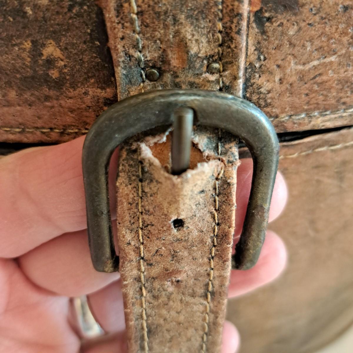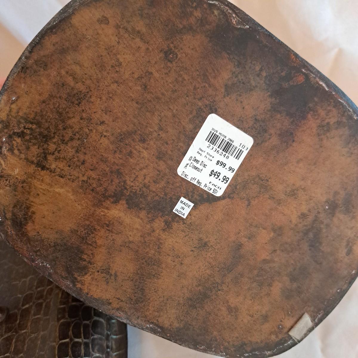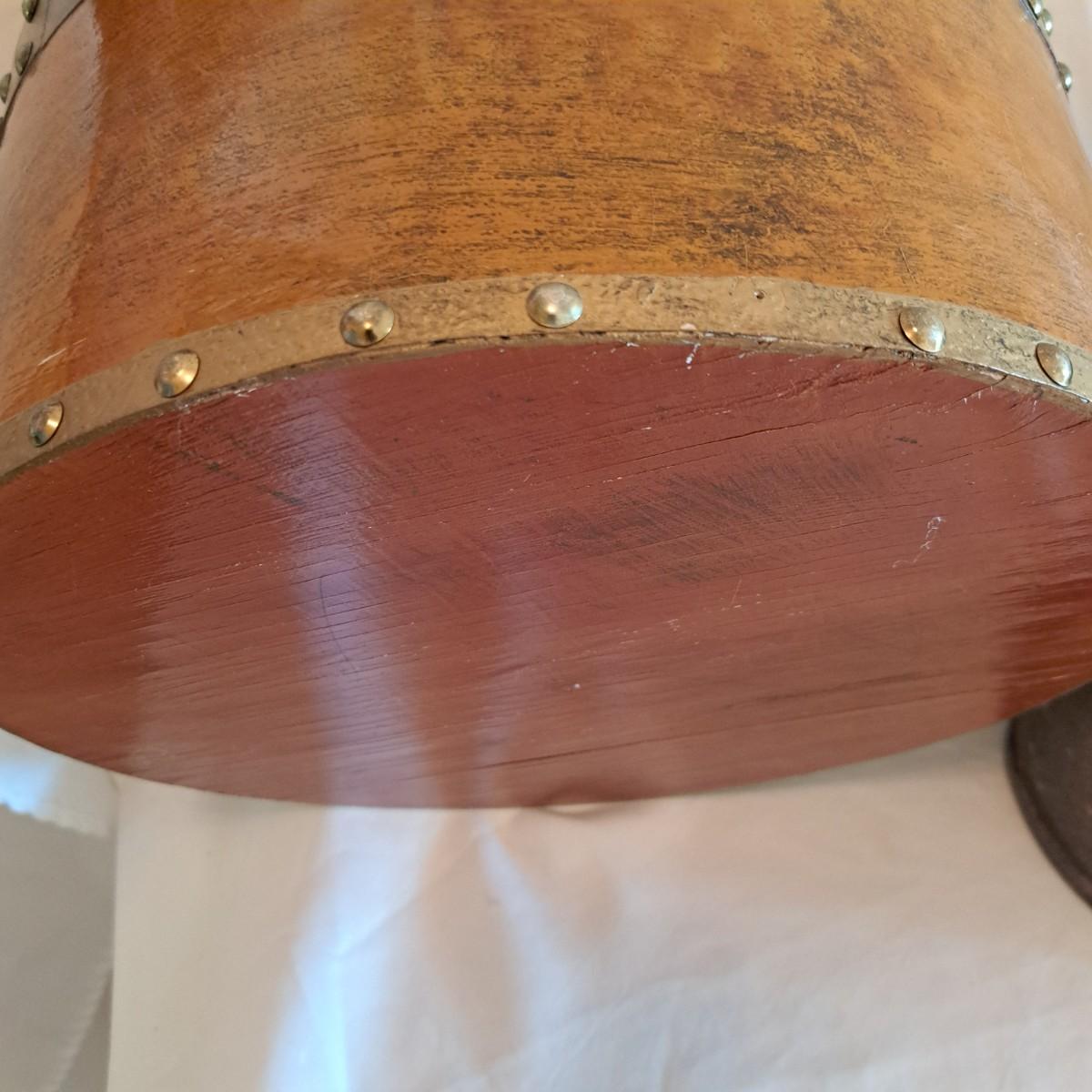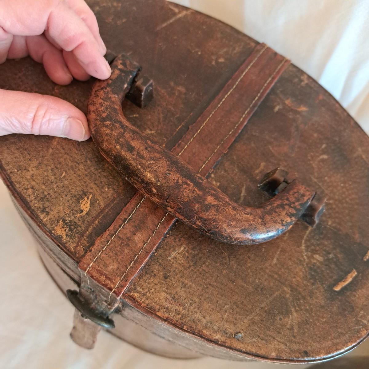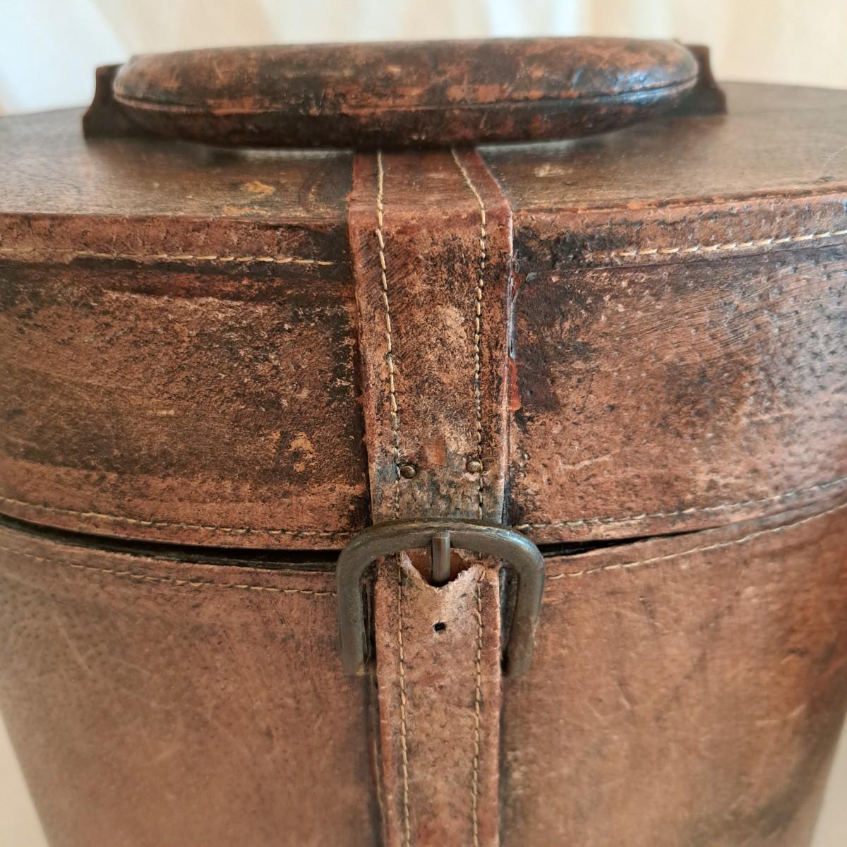 A threesome of somewhat distressed faux leather, wood and metal boxes ranging from 8.5"D x 9.5"H to 14"D x 9"H. Largest wooden round box has brass detail (side strips and studs) and is lined with velvet inside. The middle faux leather box is more like a carrying case with handle and has a strap with buckle - and magnetic snap - that opens to reveal a brown velveteen interior. Of note: the hole holding the buckle is slightly ripped as shown. The third brown and black box with lid has an exterior that mimics alligator scales and has a Made in India sticker at bottom. Shipping available.
