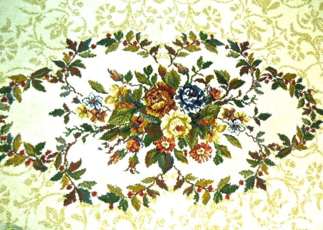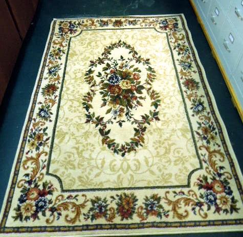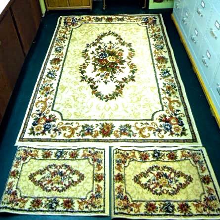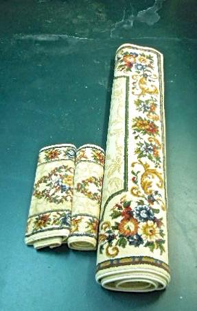 Coordianting rugs on ivory background. Two are 20" x 30" and one is 59" x 84". woven acrylic fiber. Have not been cleaned. No strong odors. some pet hair. Have been stored in basement. Backing is supple and not cracked.