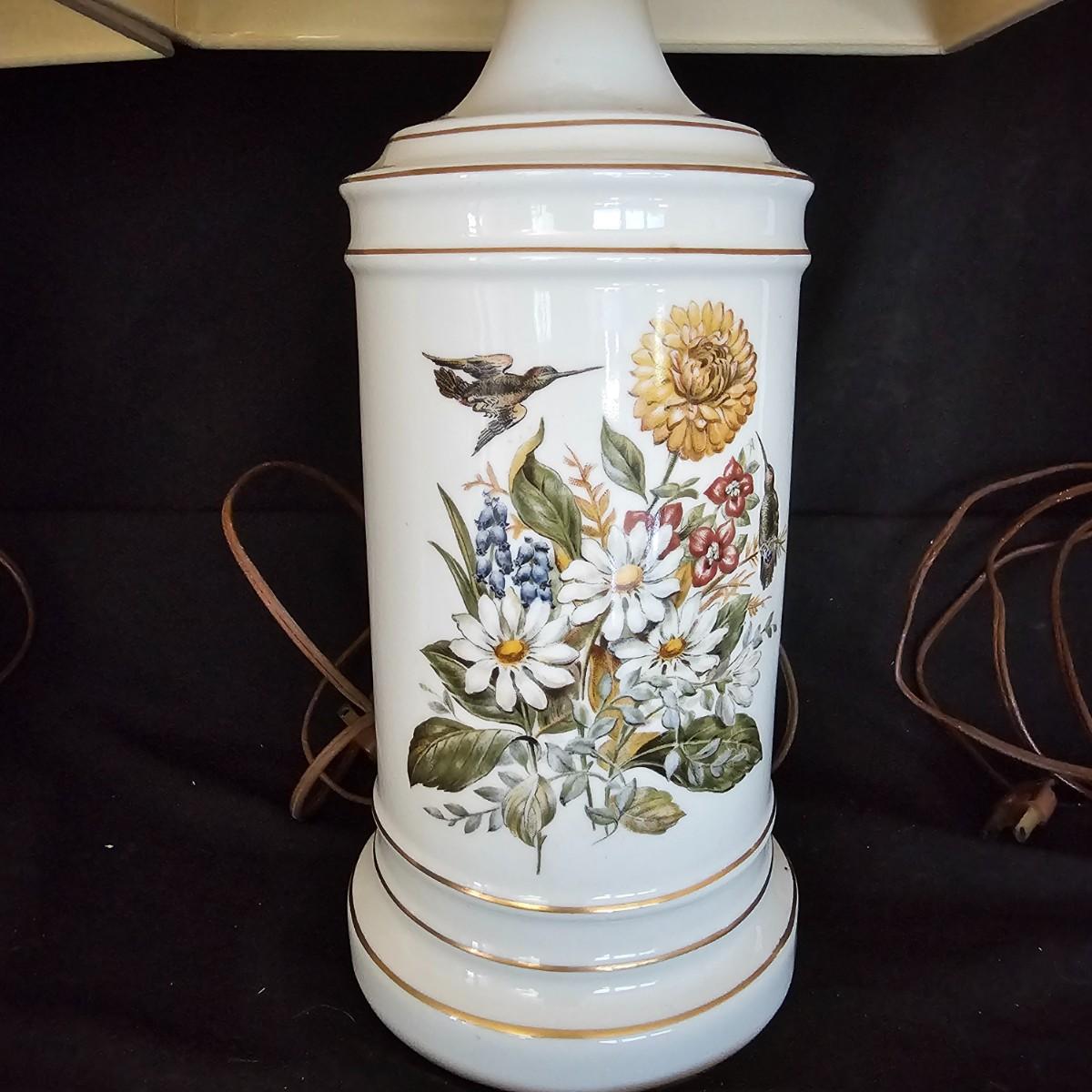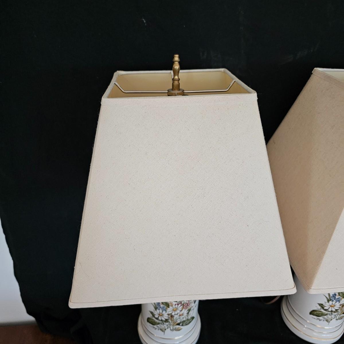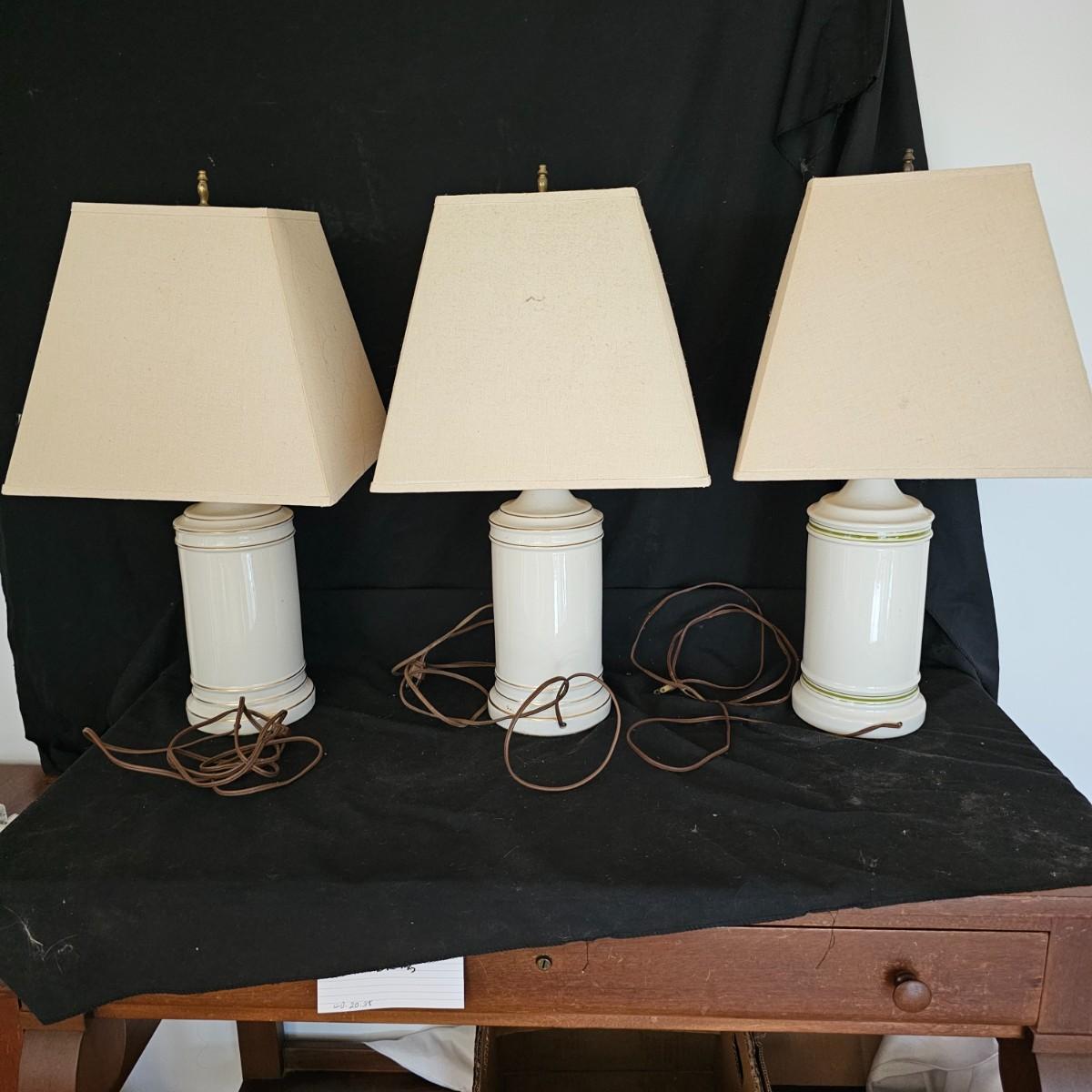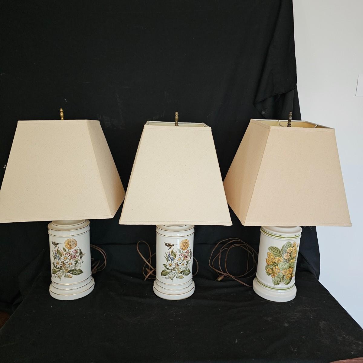 A trio of ceramic base lamps with square shades. Two of the lamps appear to have the same floral images, the third is by itself. Off white background with gold colored decorative bands and taupe shades. All lamps measure 12.5" x 12.5" x 23.5"H. See photos for details. Local pickup only.