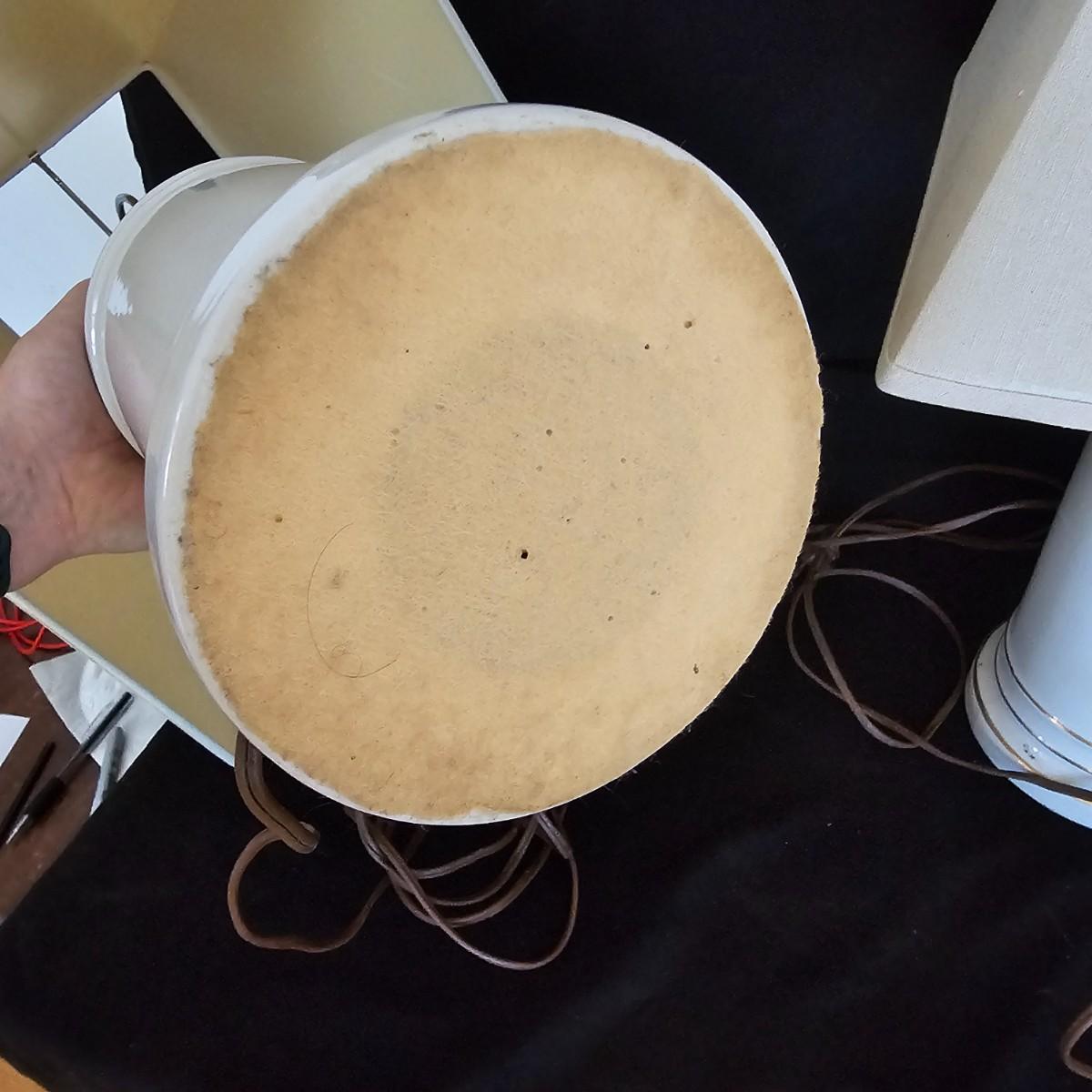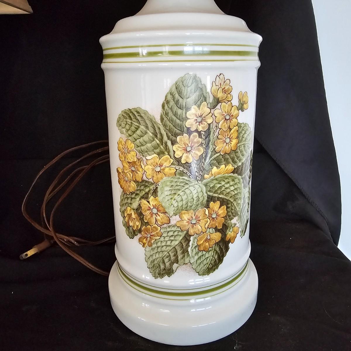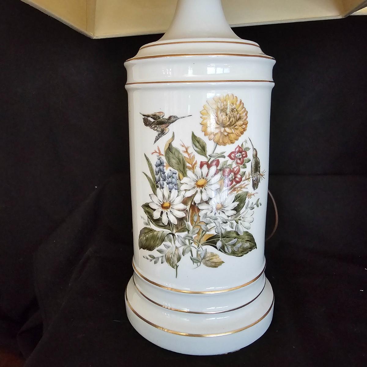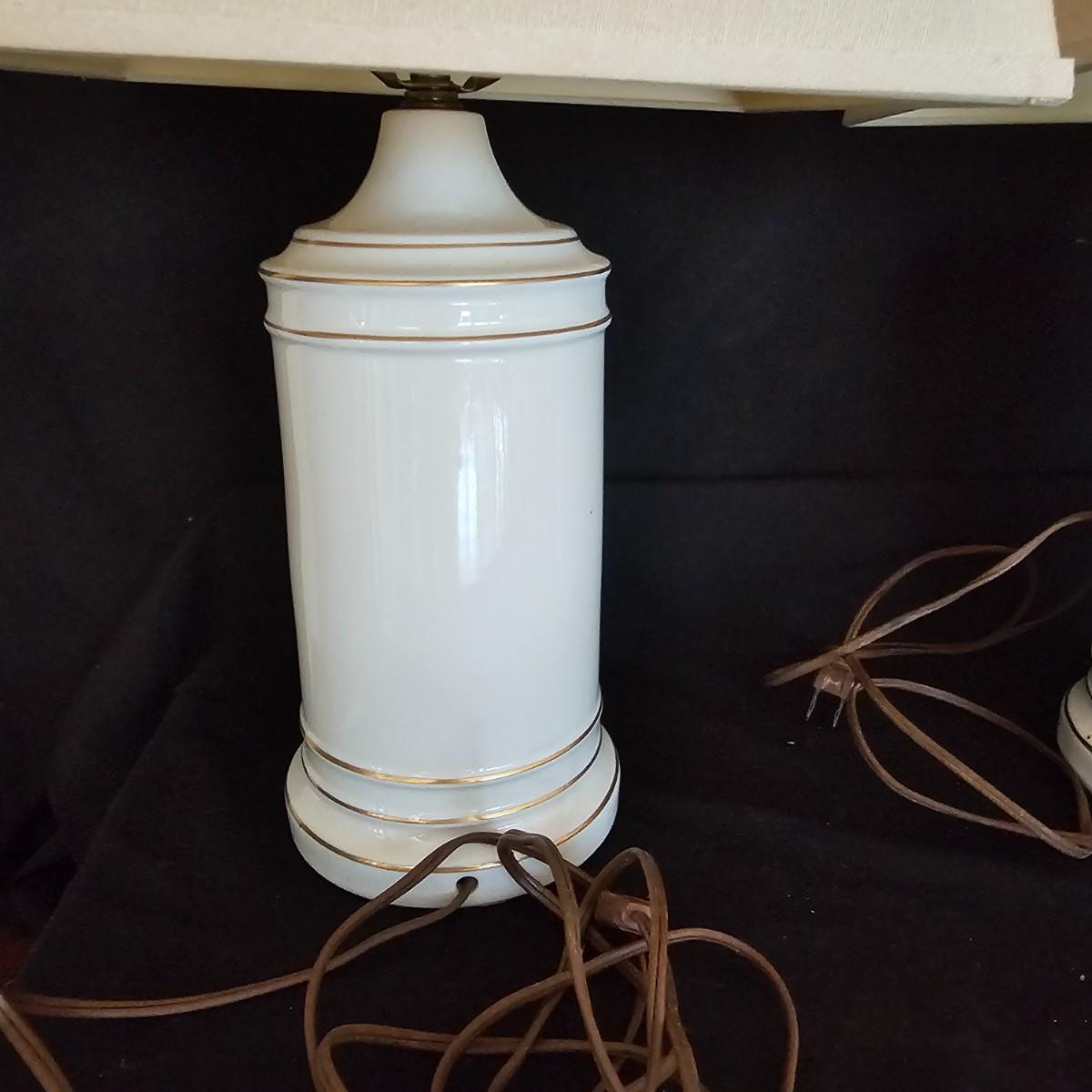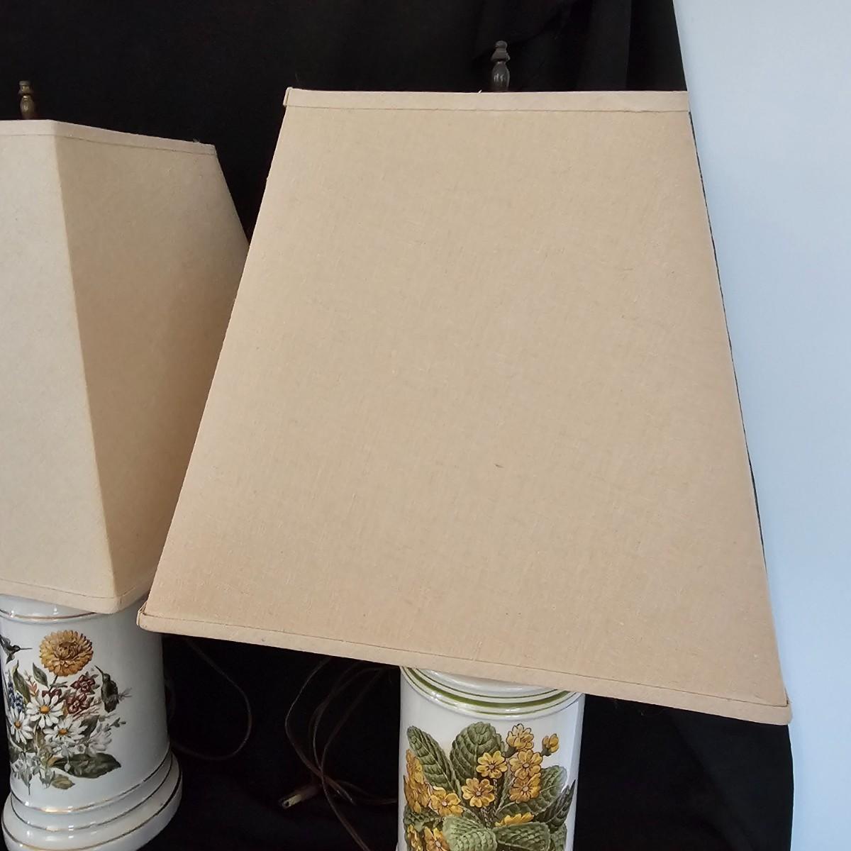 A trio of ceramic base lamps with square shades. Two of the lamps appear to have the same floral images, the third is by itself. Off white background with gold colored decorative bands and taupe shades. All lamps measure 12.5" x 12.5" x 23.5"H. See photos for details. Local pickup only.