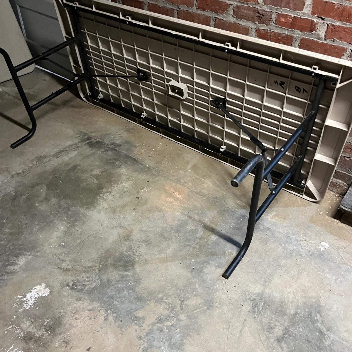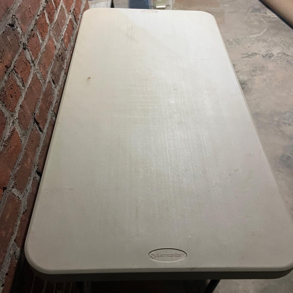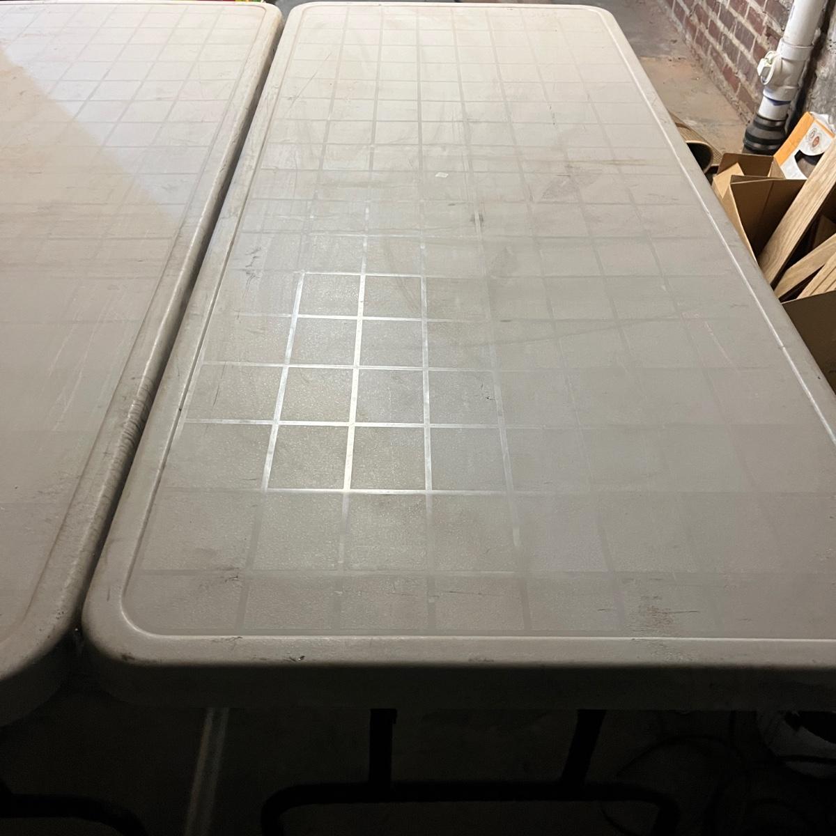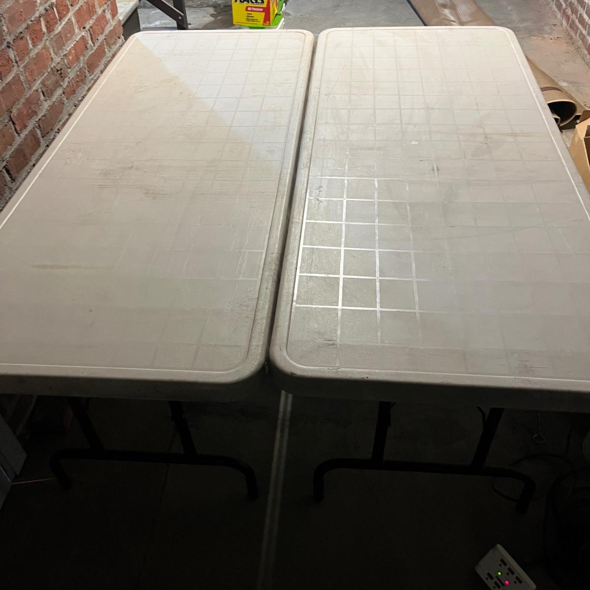 Lot includes two matching plastic folding tables that measure 72” x 30” x 29”H and a Samsonite plastic folding table that measures 48” x 24” x 28”H. All table have marks and stains, see pictures.