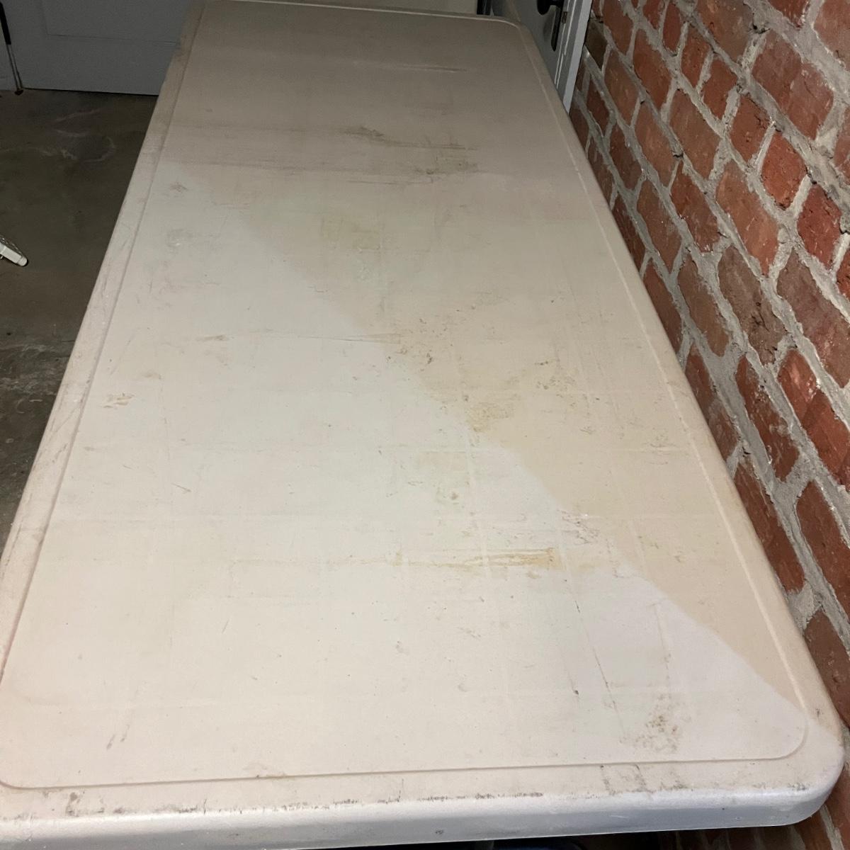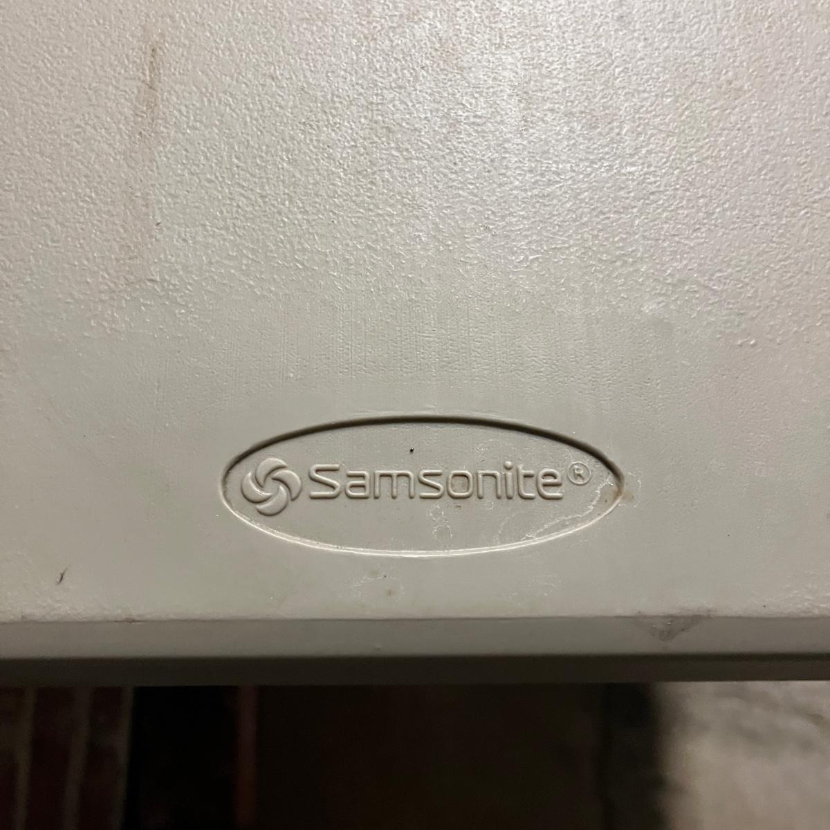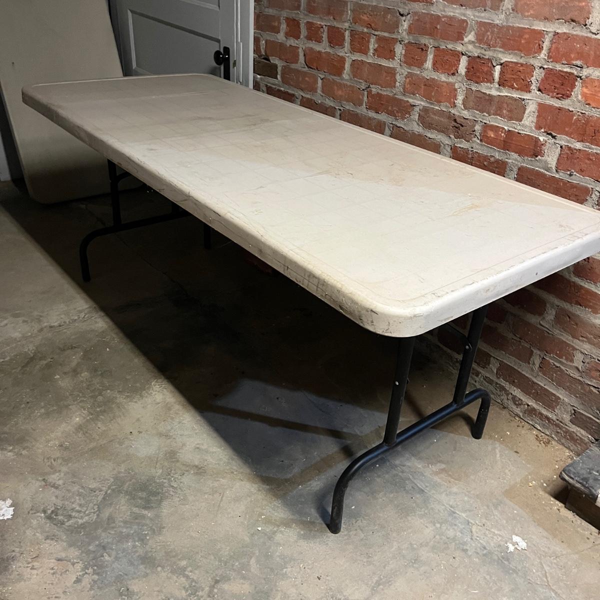 Lot includes two matching plastic folding tables that measure 72” x 30” x 29”H and a Samsonite plastic folding table that measures 48” x 24” x 28”H. All table have marks and stains, see pictures.