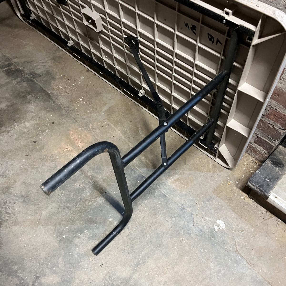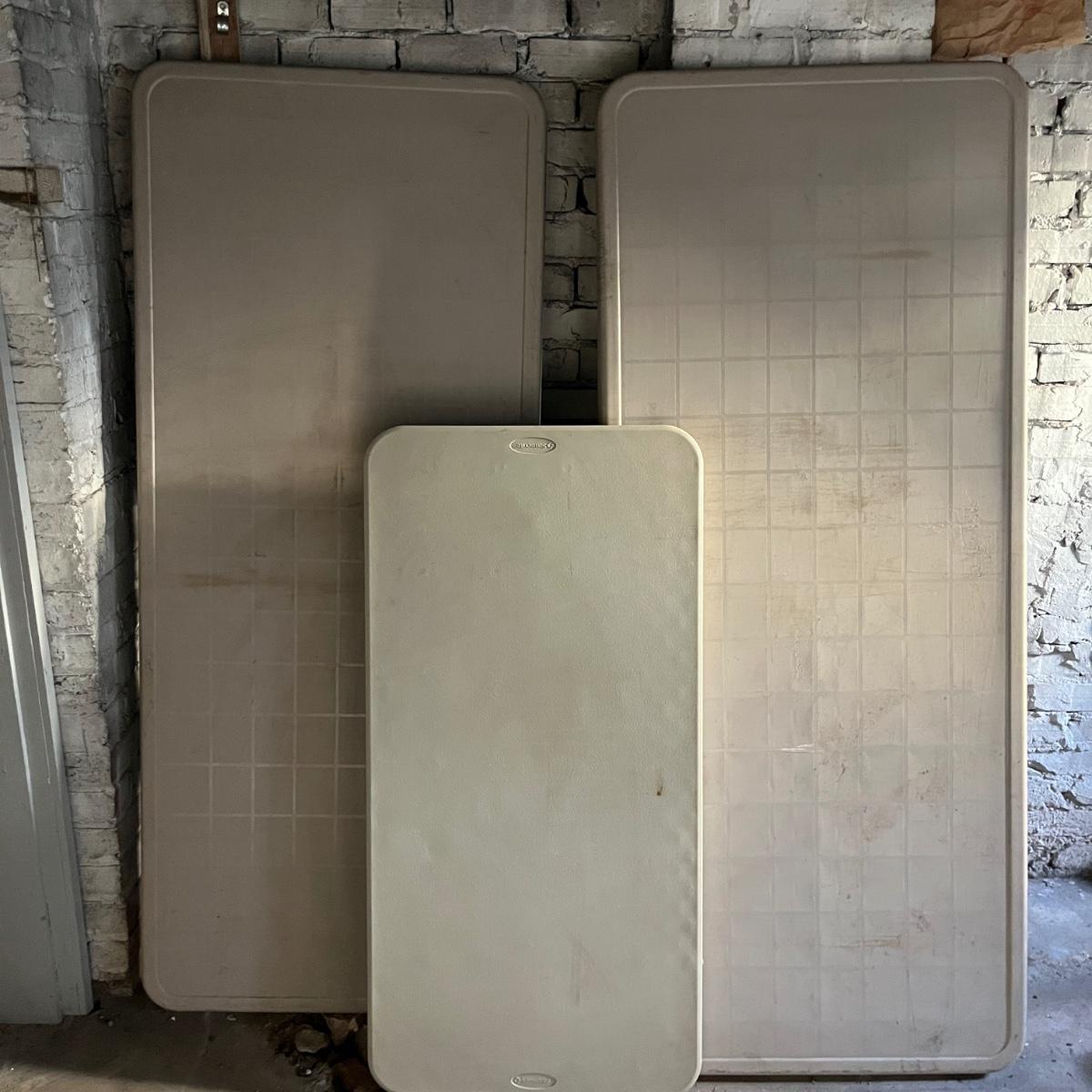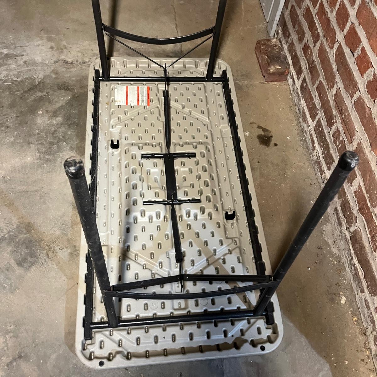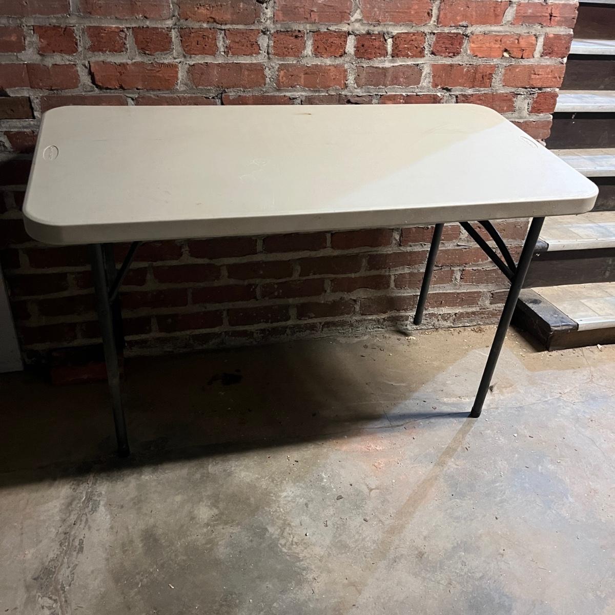 Lot includes two matching plastic folding tables that measure 72” x 30” x 29”H and a Samsonite plastic folding table that measures 48” x 24” x 28”H. All table have marks and stains, see pictures.