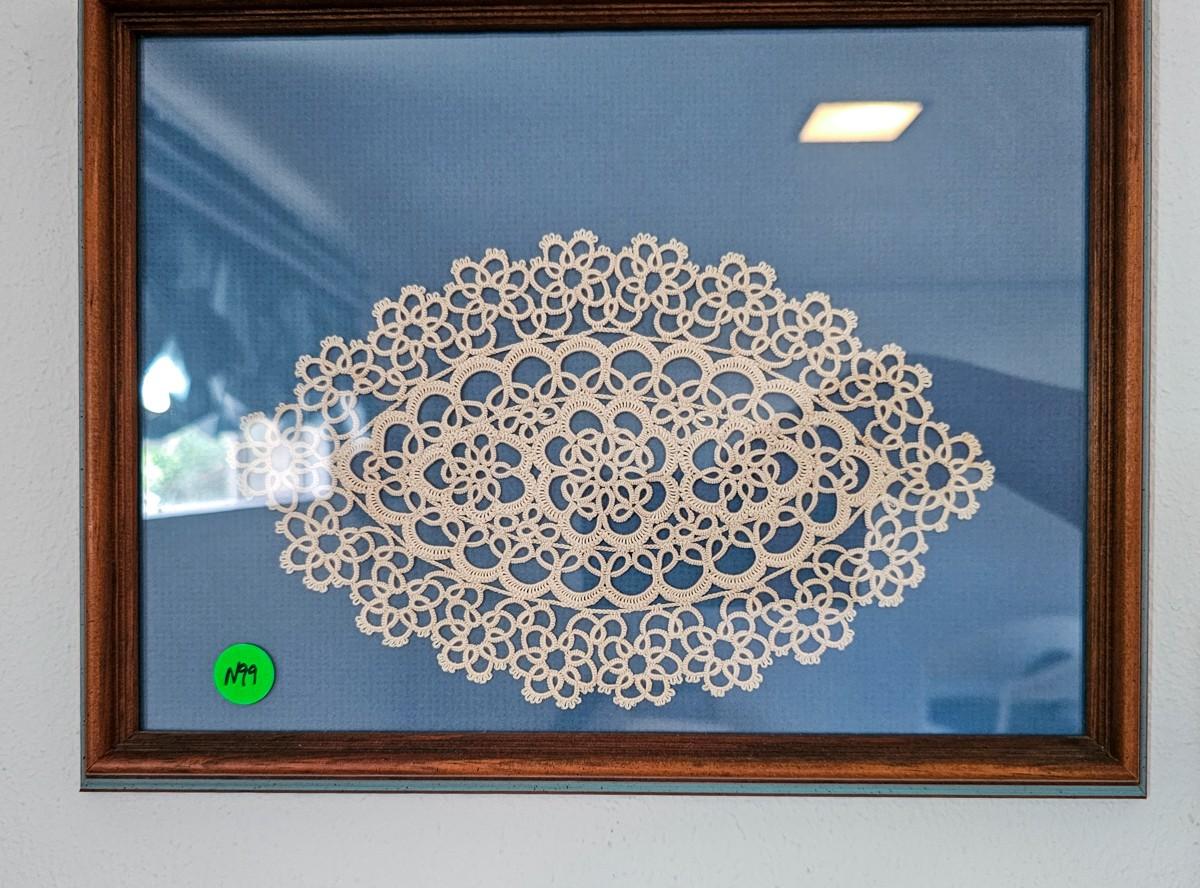 Three vintage or antique handmade doilies in frames. See photos for dimensions