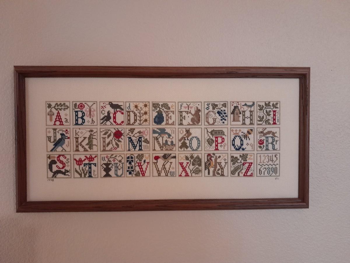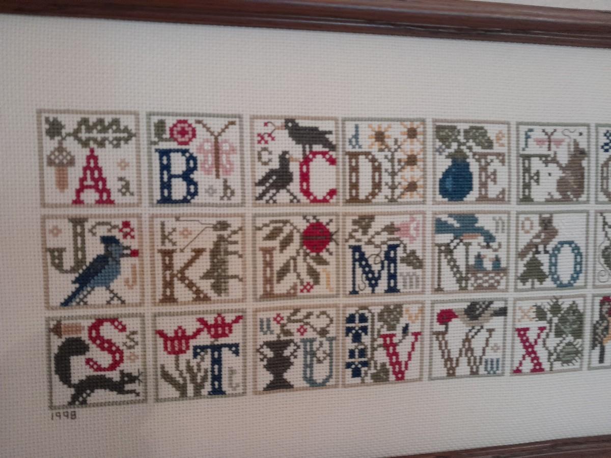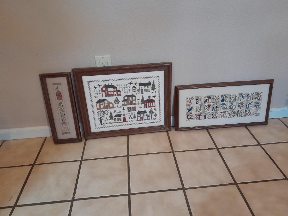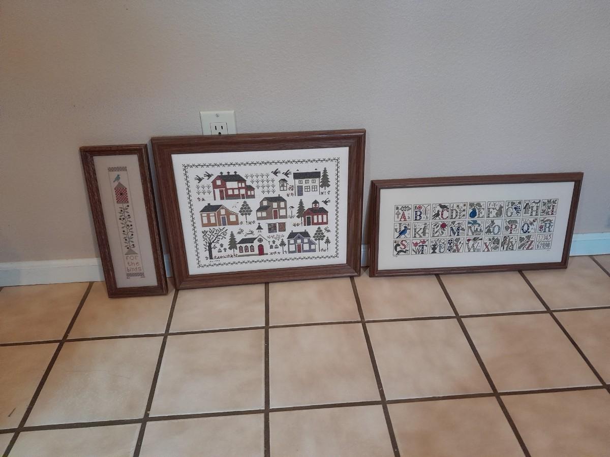 THREE FRAMED CROSS STITCH ARTWORK PIECES, ALPHABET 19" X 10", FOR THE BIRDS 13.5" X 5" AND COUNTRY HOMES 17.5" X 14"