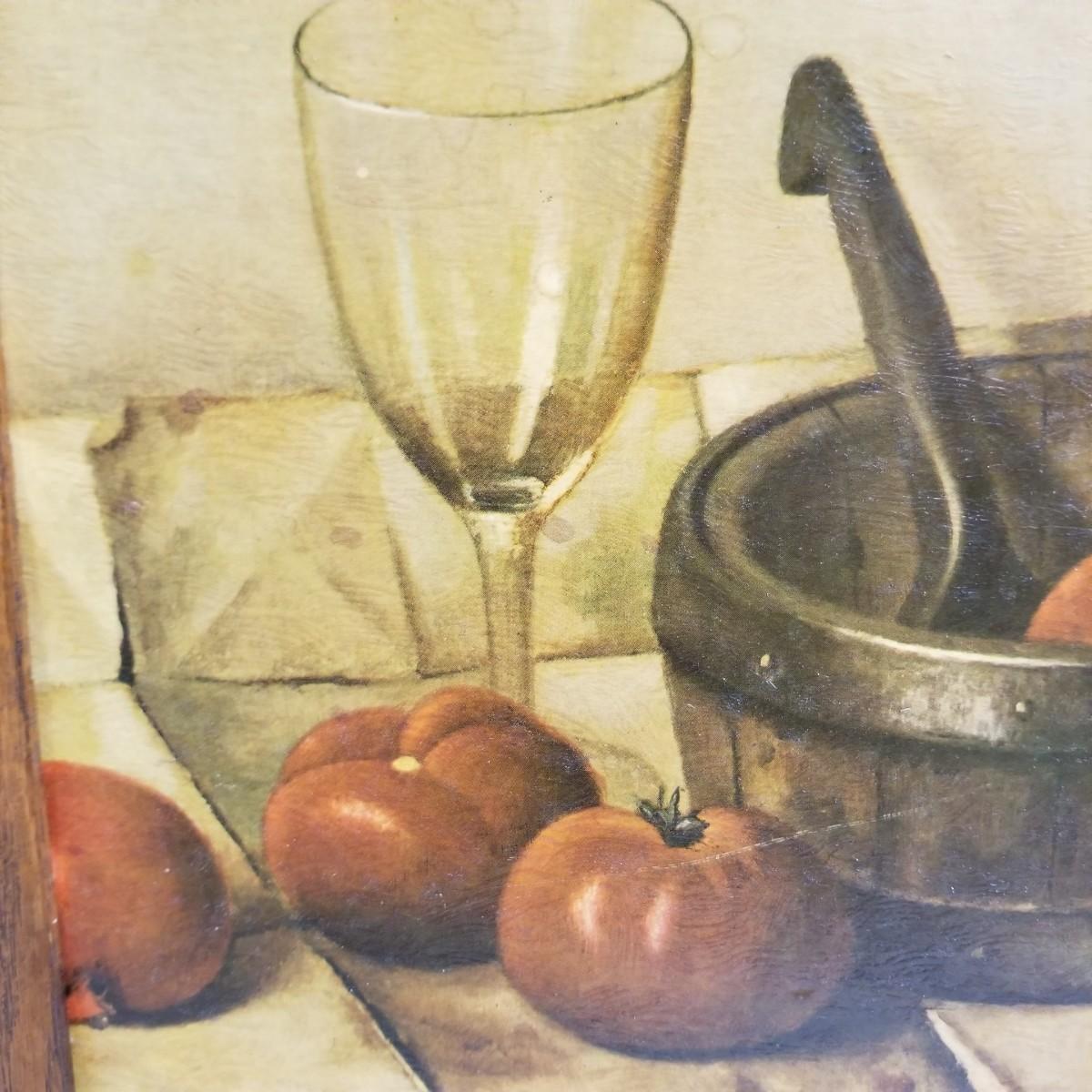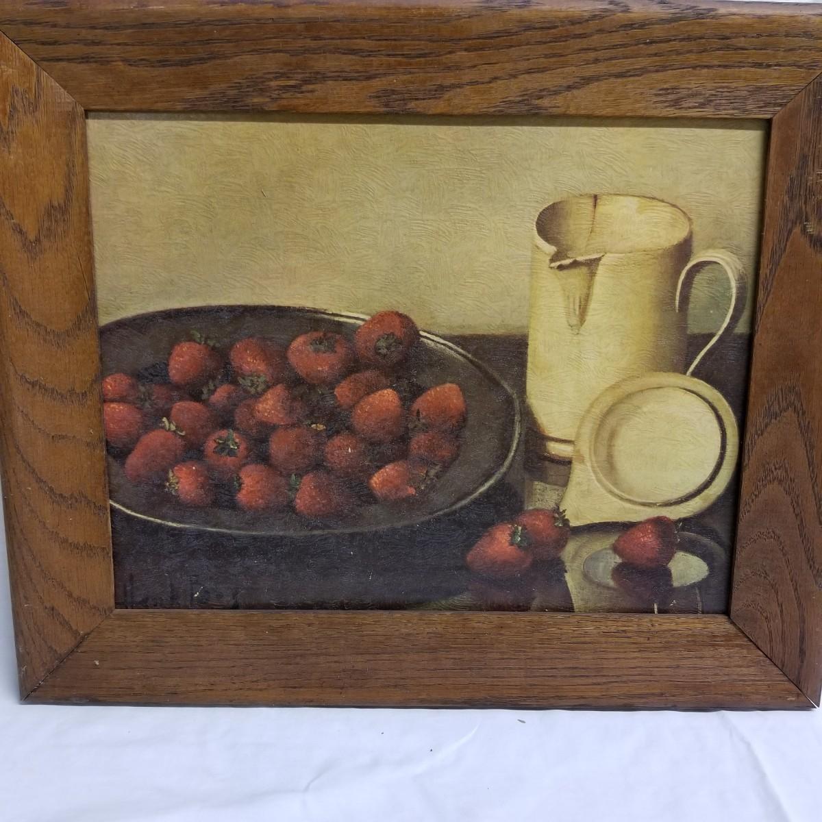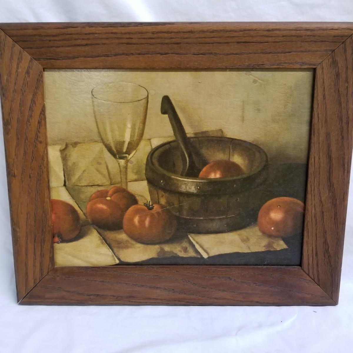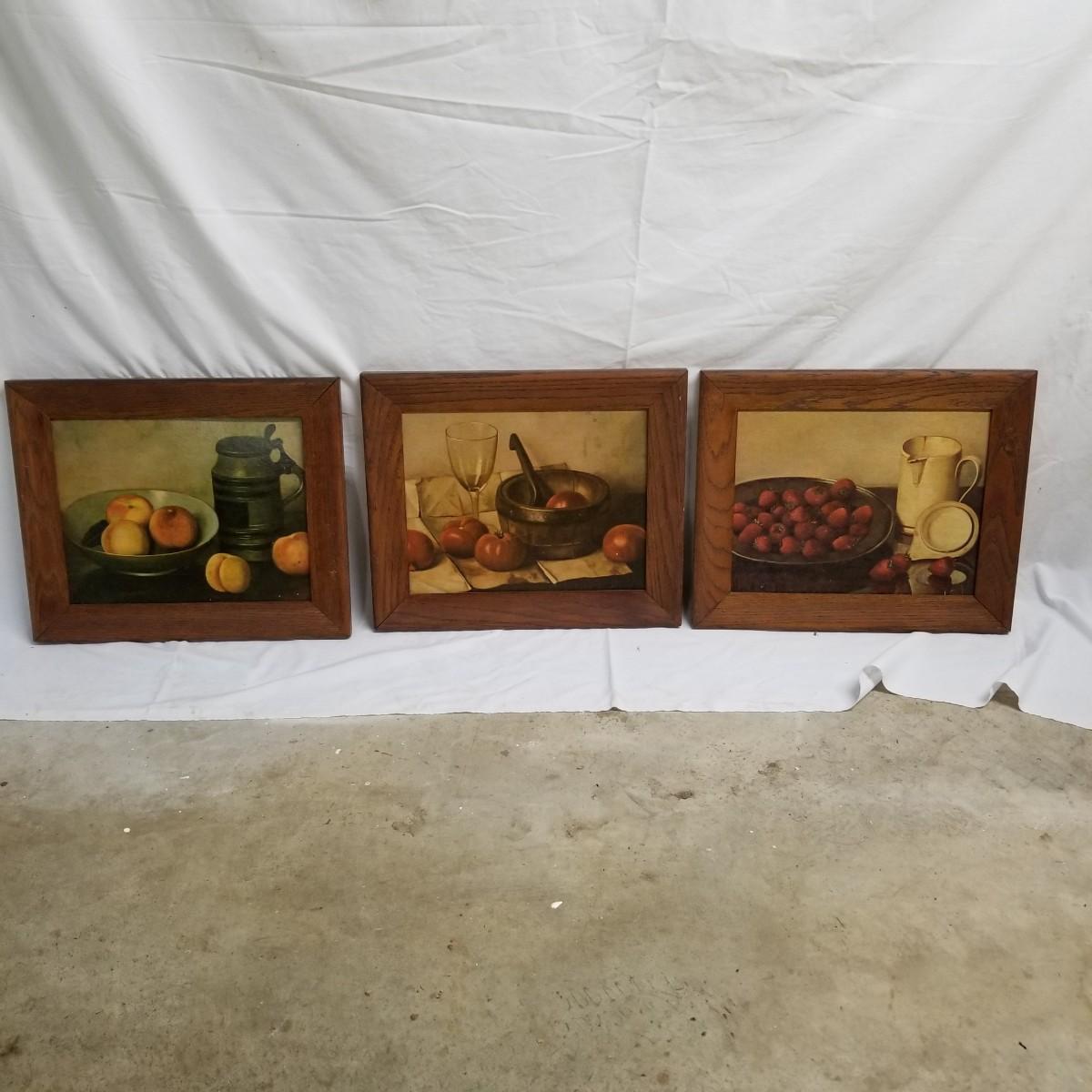 A trio of wood framed art showing still lifes of fruit. Peaches, strawberries and tomatoes are represented here. 17.5"x14.5" each. Prints and frames fair shape.  See photos for detail.  Shipping available.  Shipping Art can be costly please call UPS store at 828-252-6930 for quote.