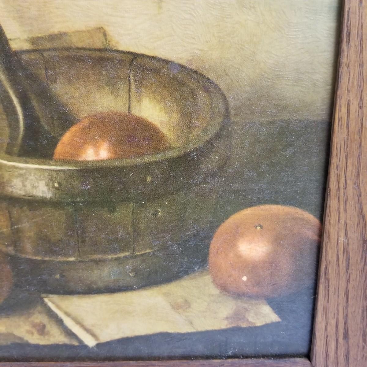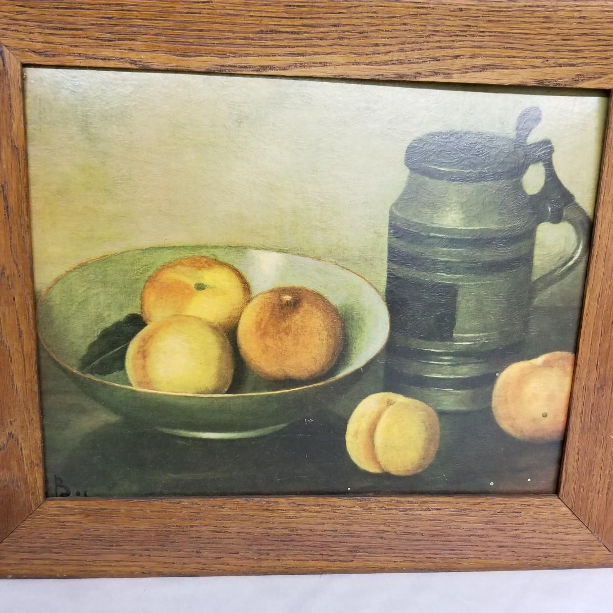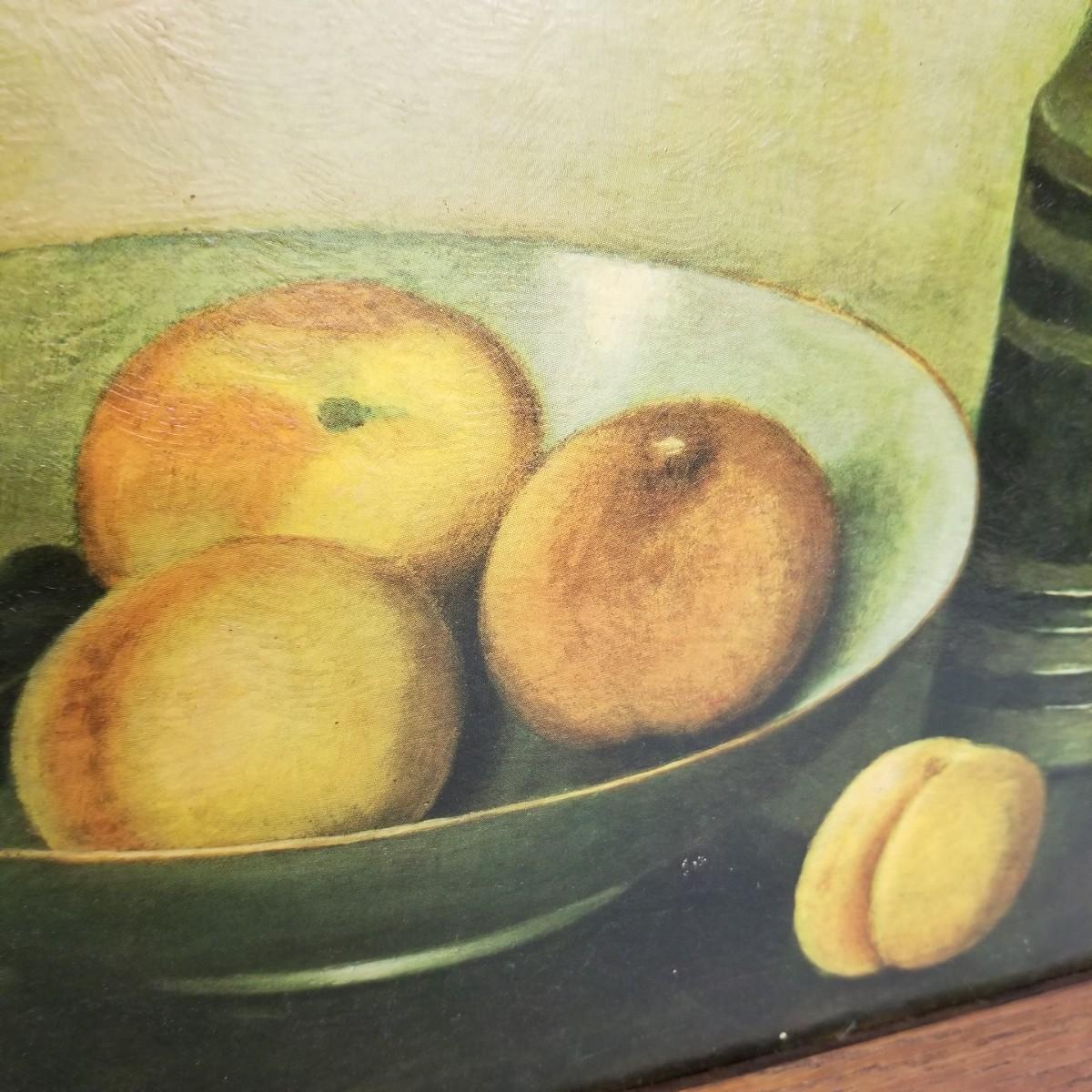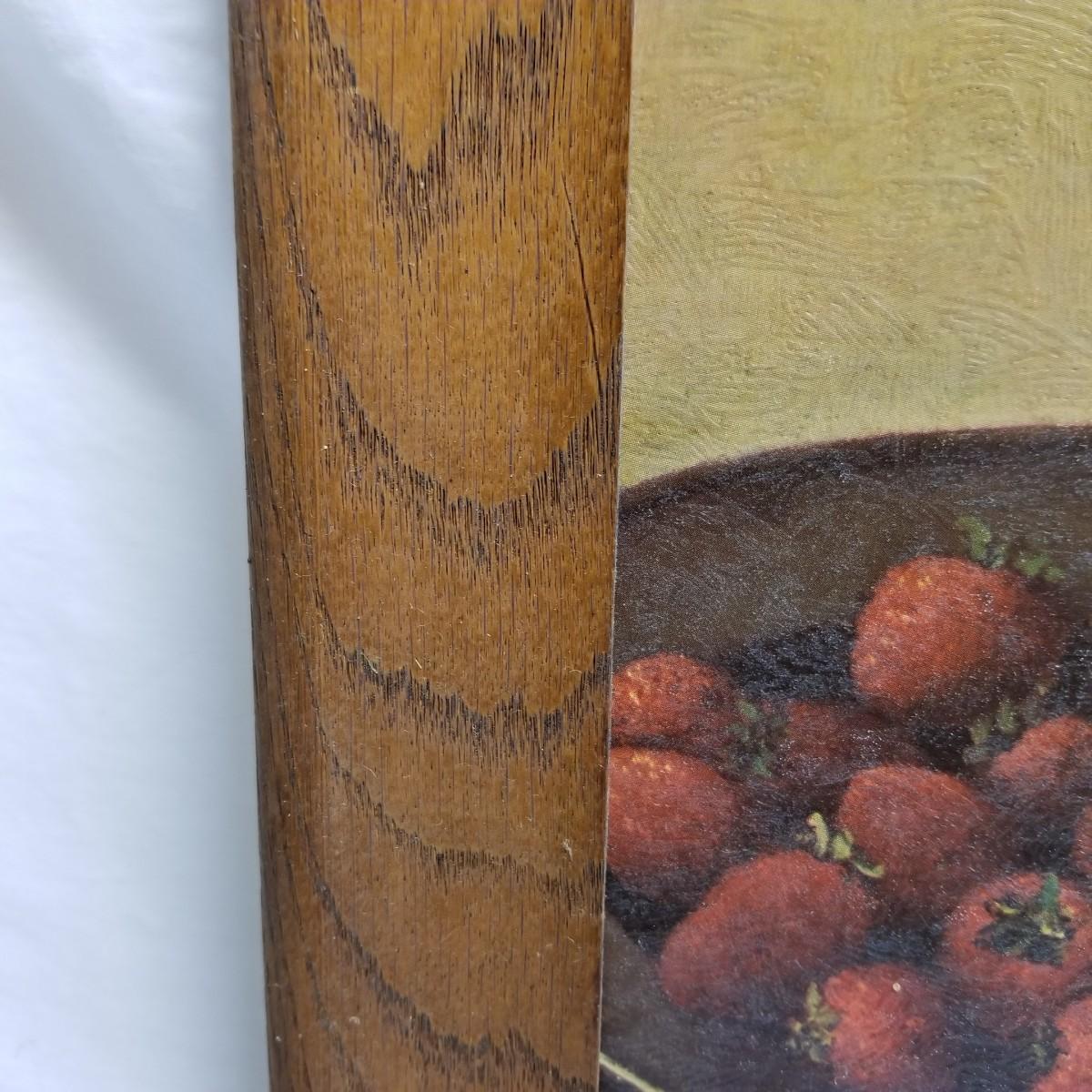 A trio of wood framed art showing still lifes of fruit. Peaches, strawberries and tomatoes are represented here. 17.5"x14.5" each. Prints and frames fair shape.  See photos for detail.  Shipping available.  Shipping Art can be costly please call UPS store at 828-252-6930 for quote.