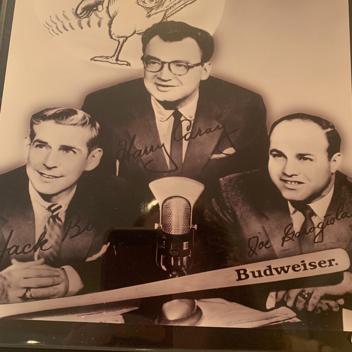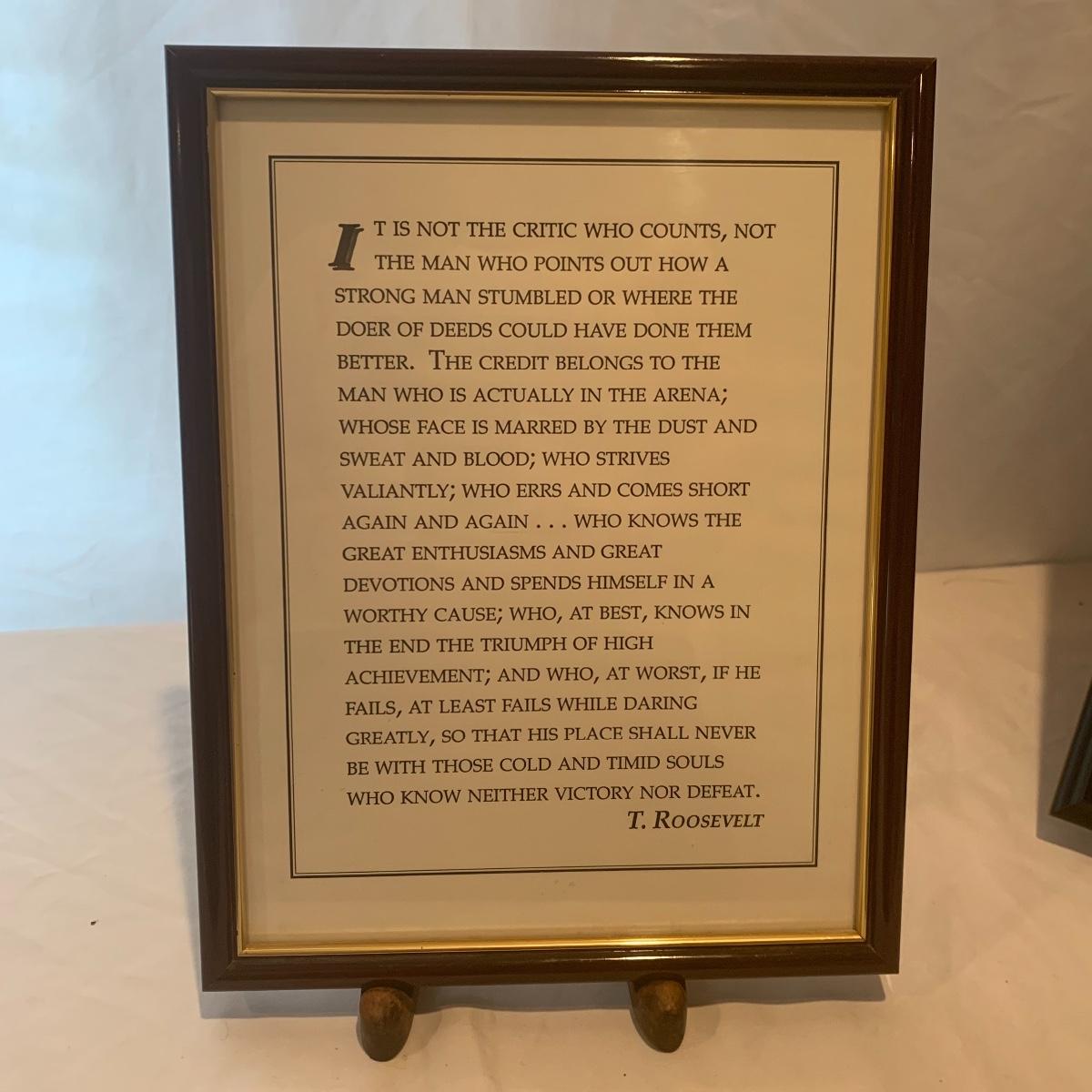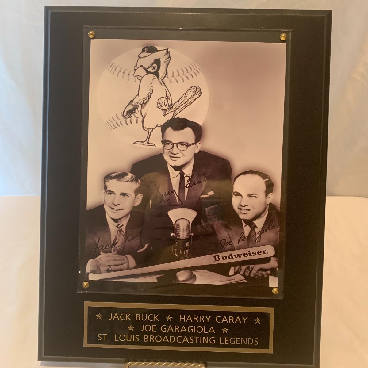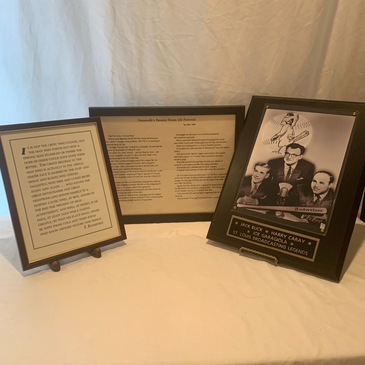 St. Louis Broadcasting Legends; Jack Buck, Harry Caray and Joe Garagiola photograph with signatures on a plaque that measures 12” x16”. Cannot verify the signatures are authentic. The last two framed items are quote from T. Roosevelt and John Held. Shipping available.