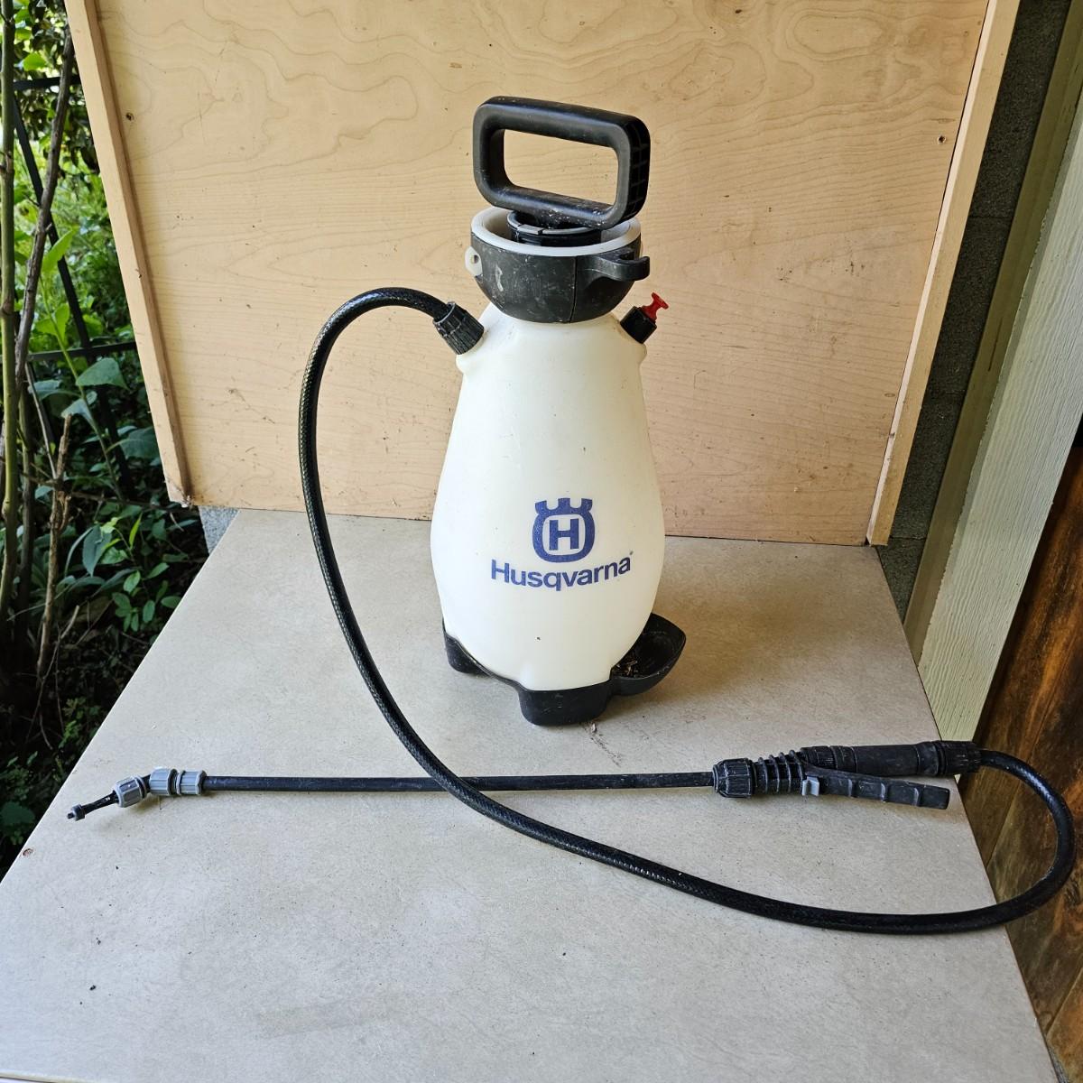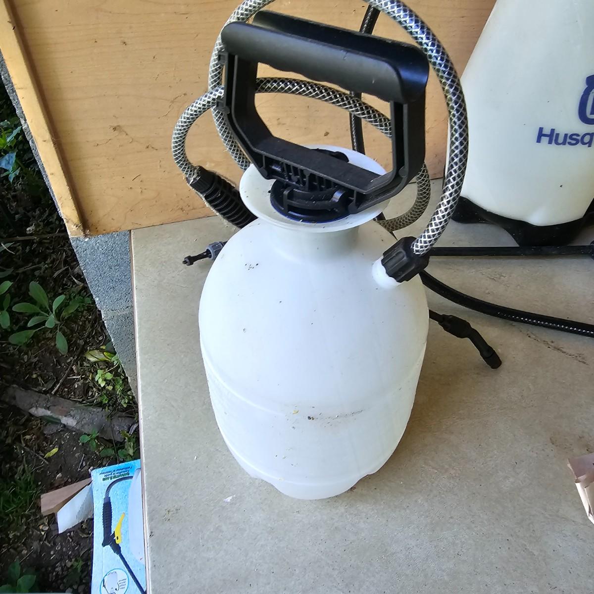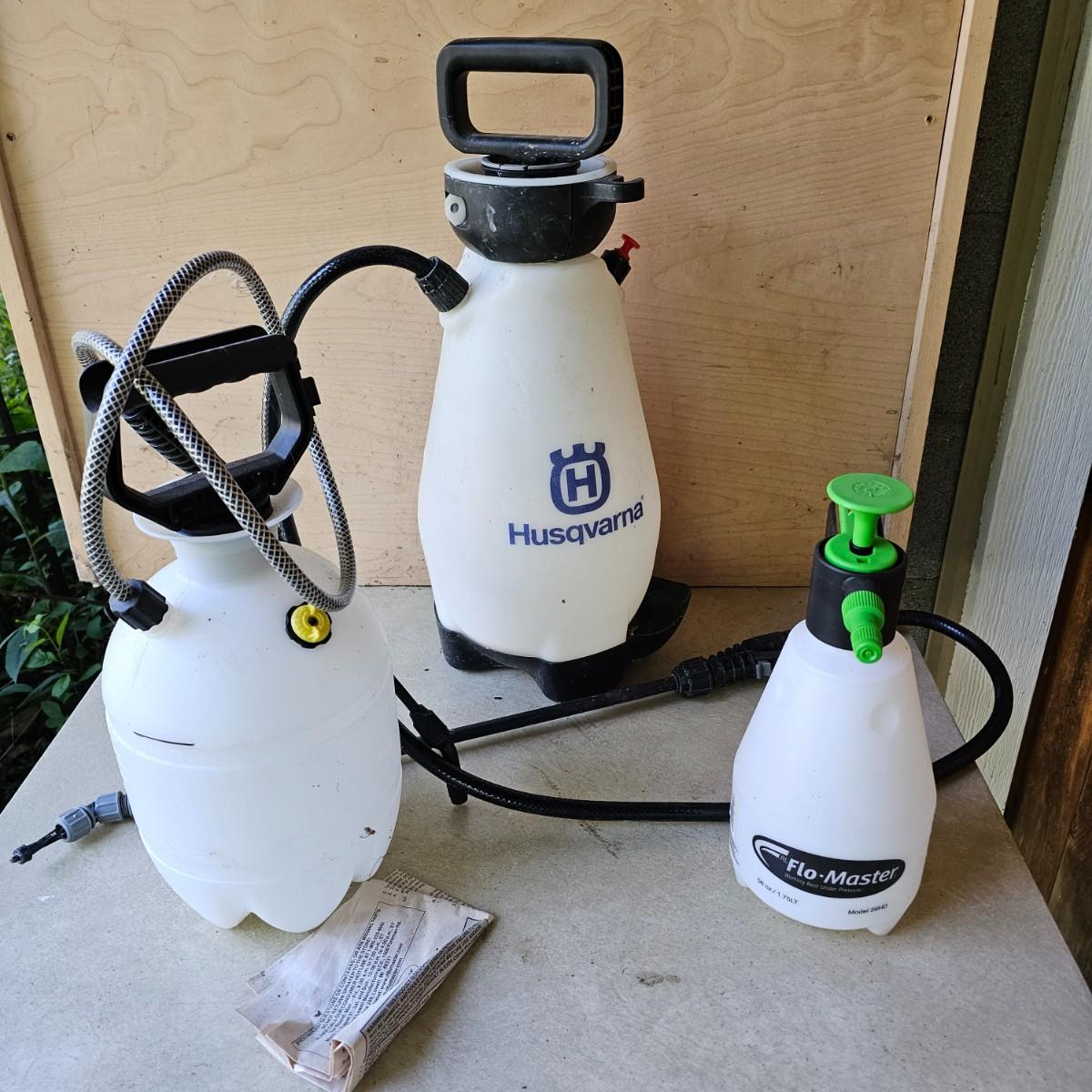 Three pump sprayers for garden use. Flo-Master & Husqvarna brands. Capacity from 1.75 liter to approximately three gallon. Husky sprayer measures 9" x 22"H. See photos for details. Local pickup only.