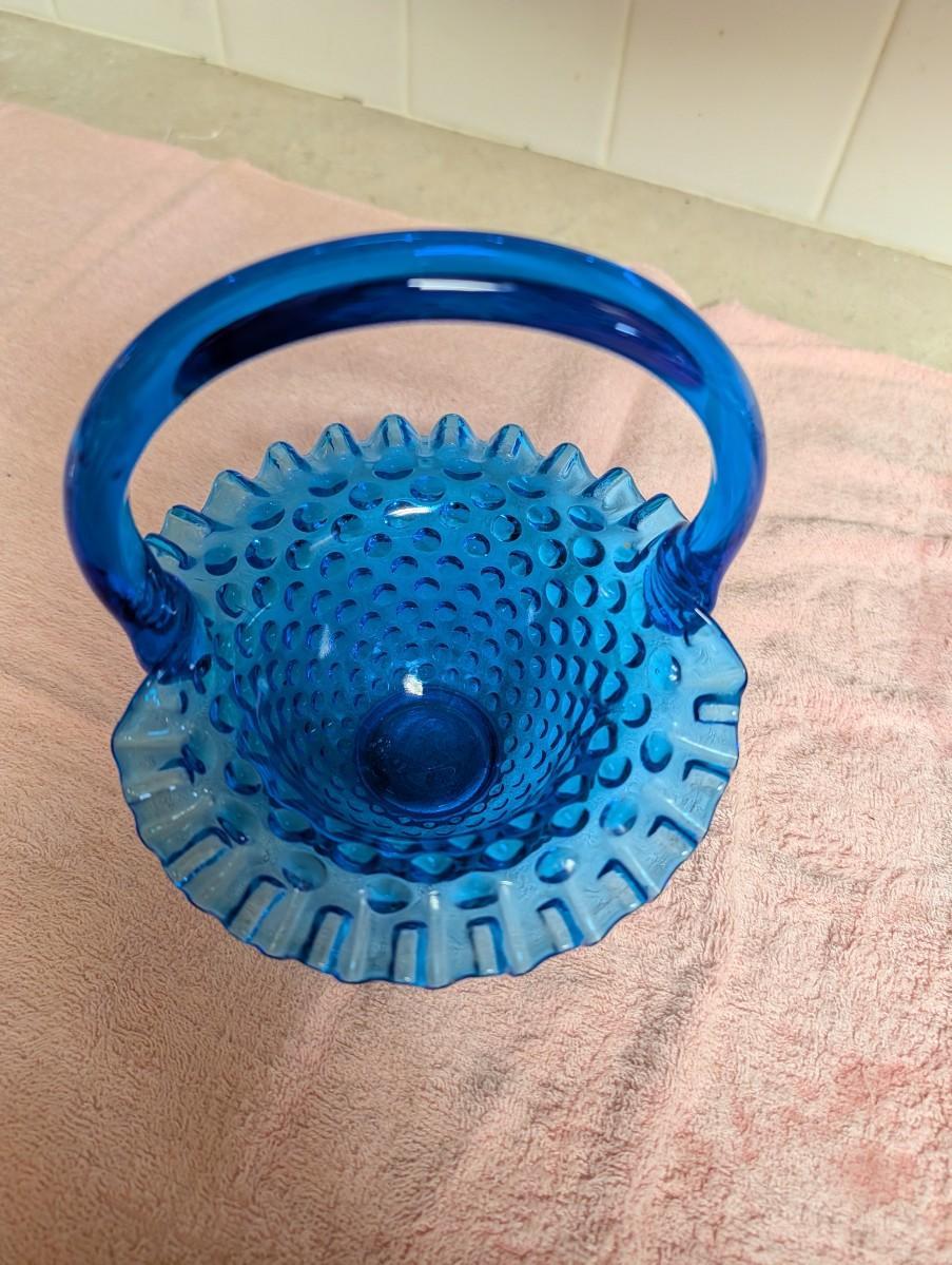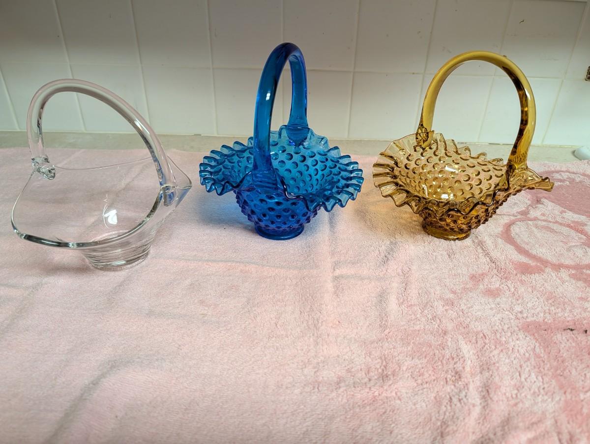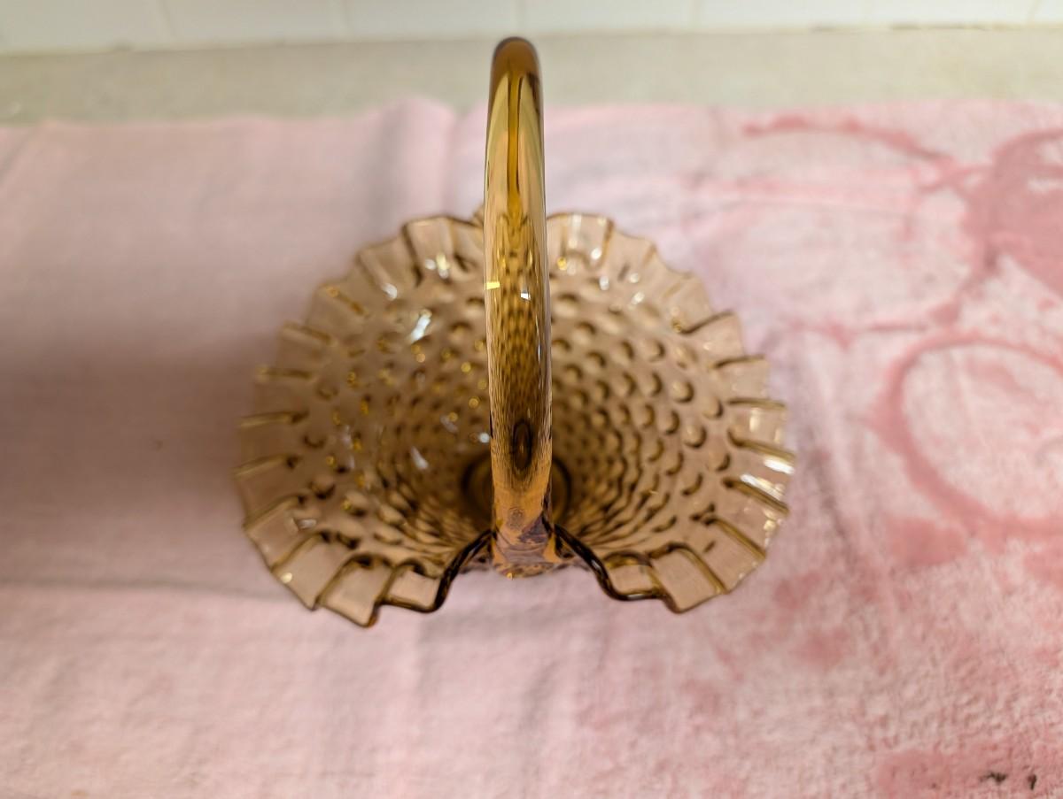 Fenton Amber Brown art glass basket hobnail ruffle edge. Vintage Fenton glass art bridal basket hobnail colonial Blue. Clear art glass basket.