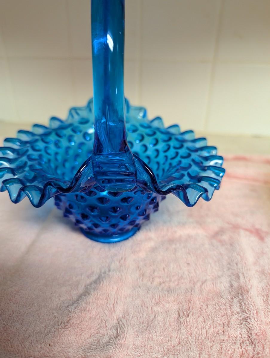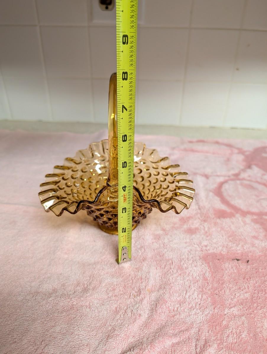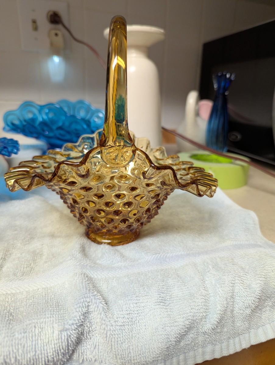 Fenton Amber Brown art glass basket hobnail ruffle edge. Vintage Fenton glass art bridal basket hobnail colonial Blue. Clear art glass basket.
