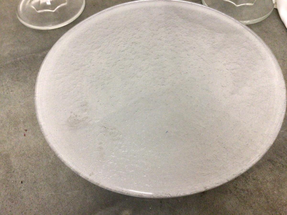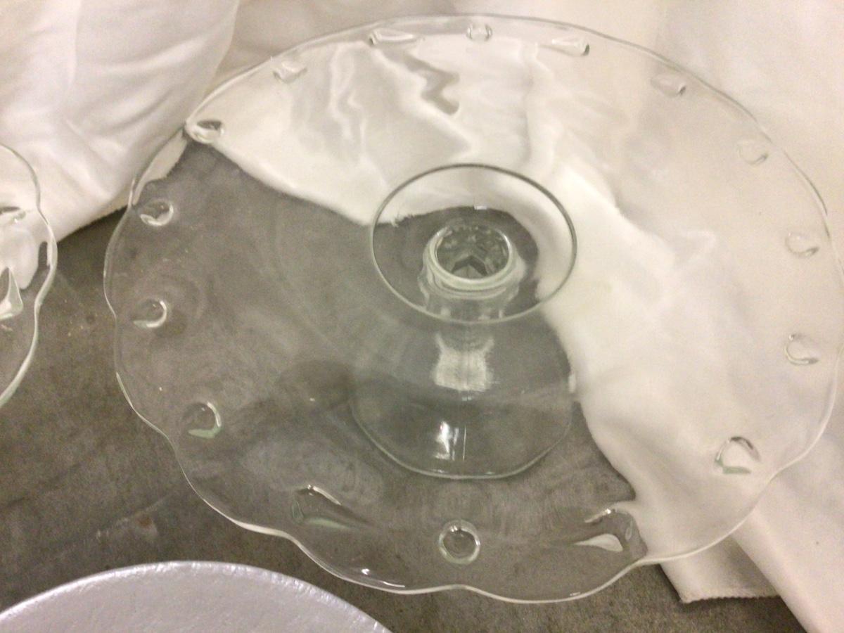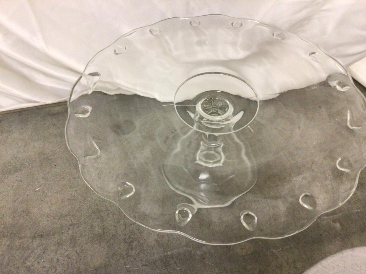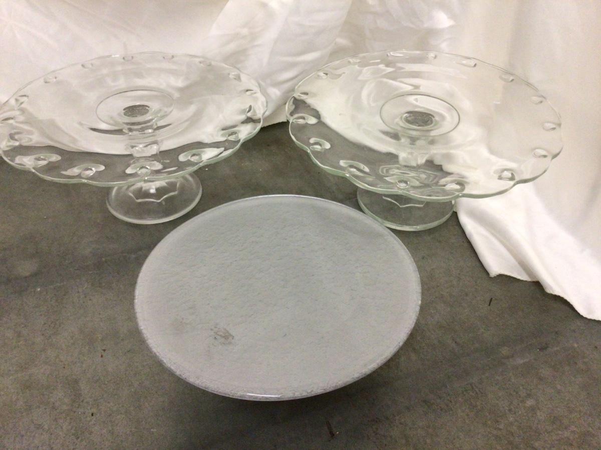 Two matching clear glass pedestal cake plate, and reserved painted gray clear glass pedestal cake plate.