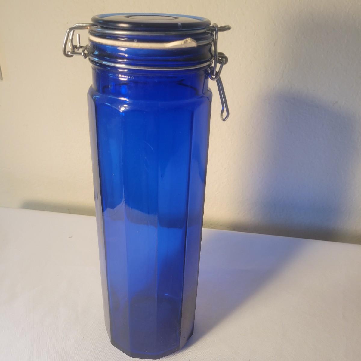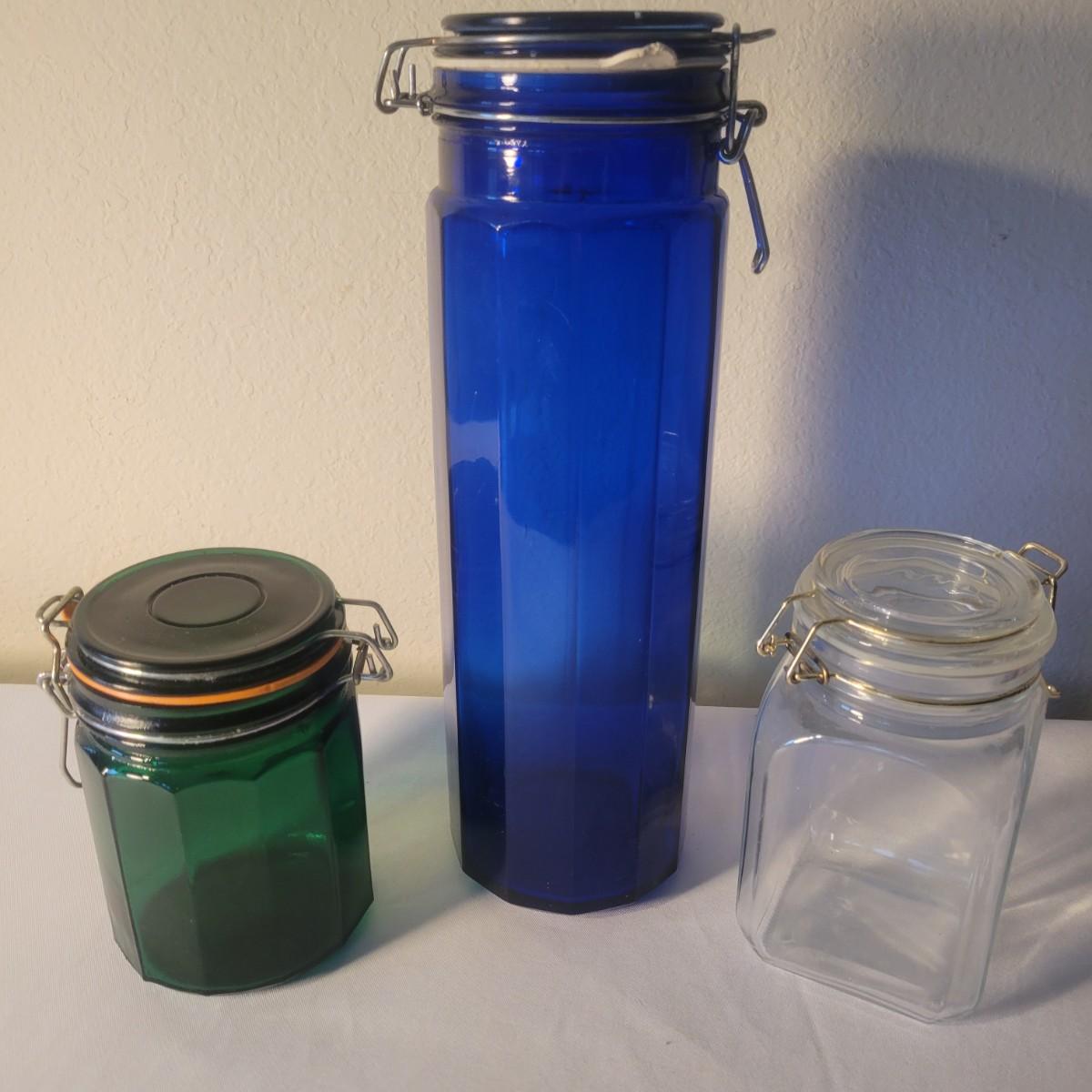An assortment of three glass jars in good condition. Included are three glass jars with clasp lids and rubber seals. The tallest cobalt blue jar measures approximately 4"D x 13"H. Shipping available. Shipping can be costly. We suggest calling our local UPS with dimensions and getting an estimate before bidding: (828) 252-6930
