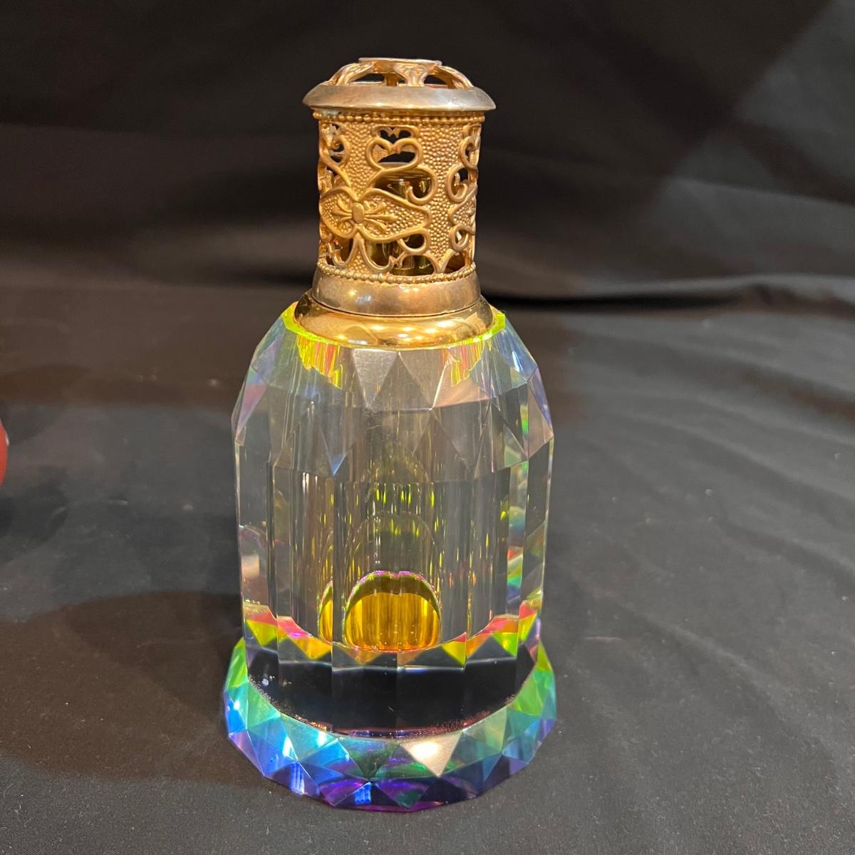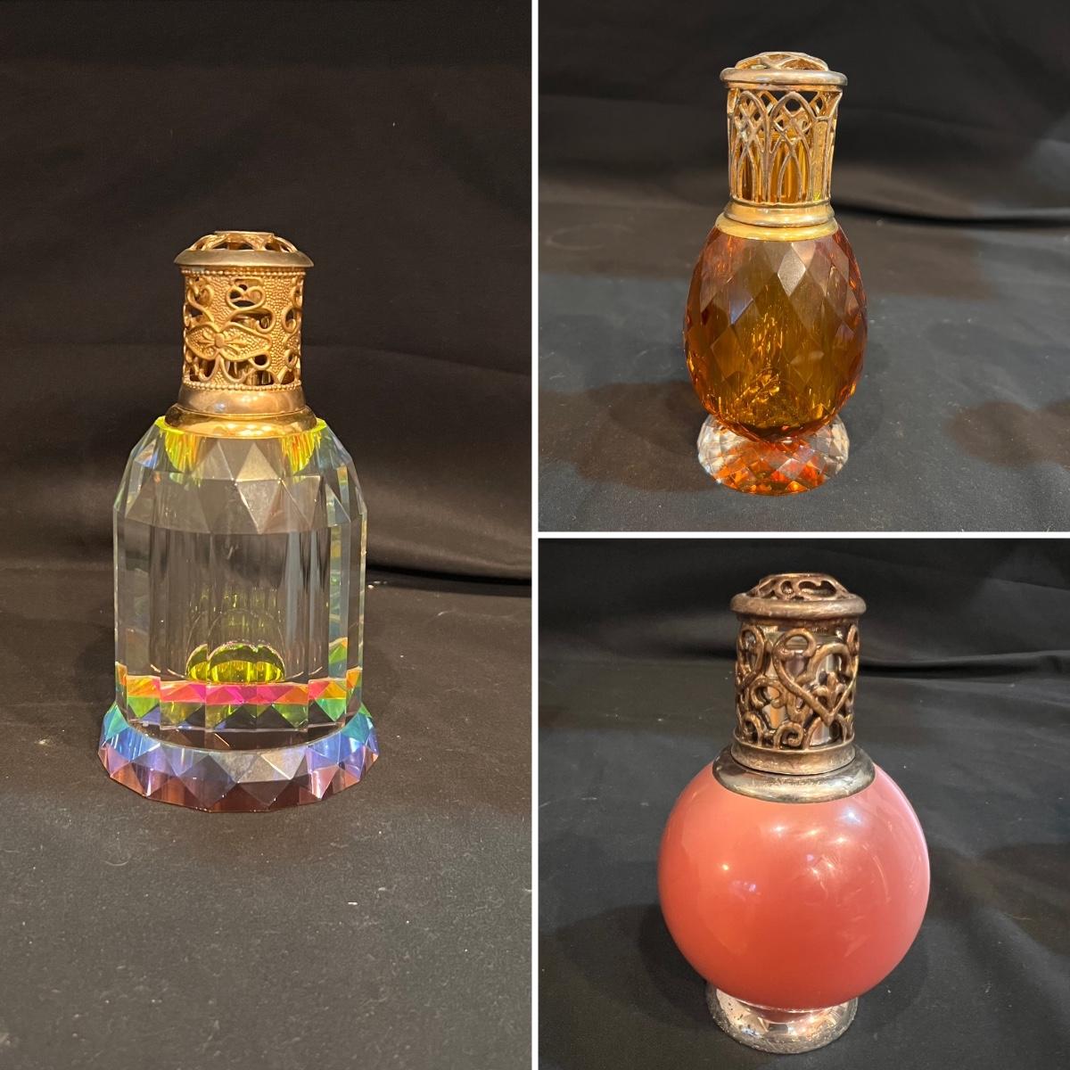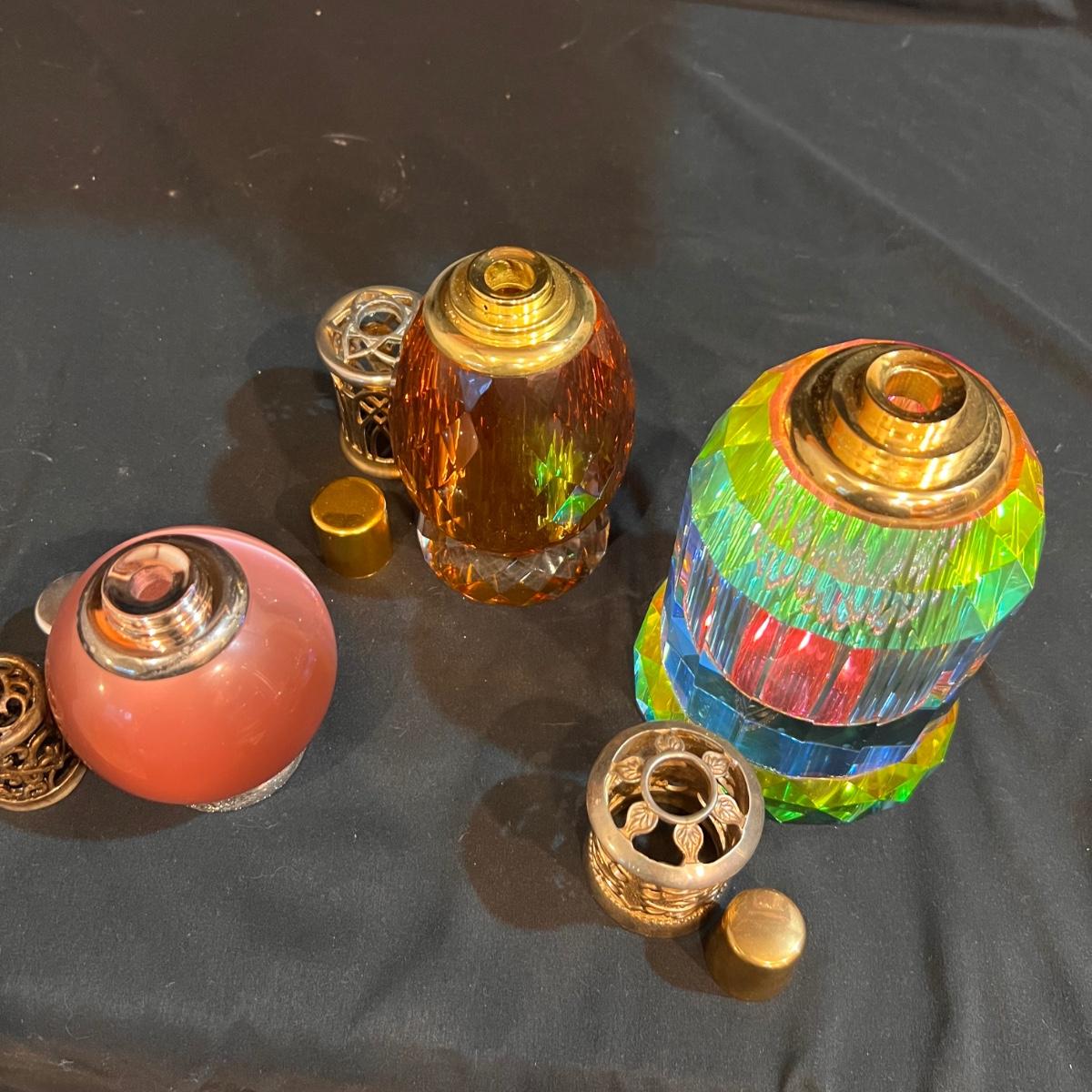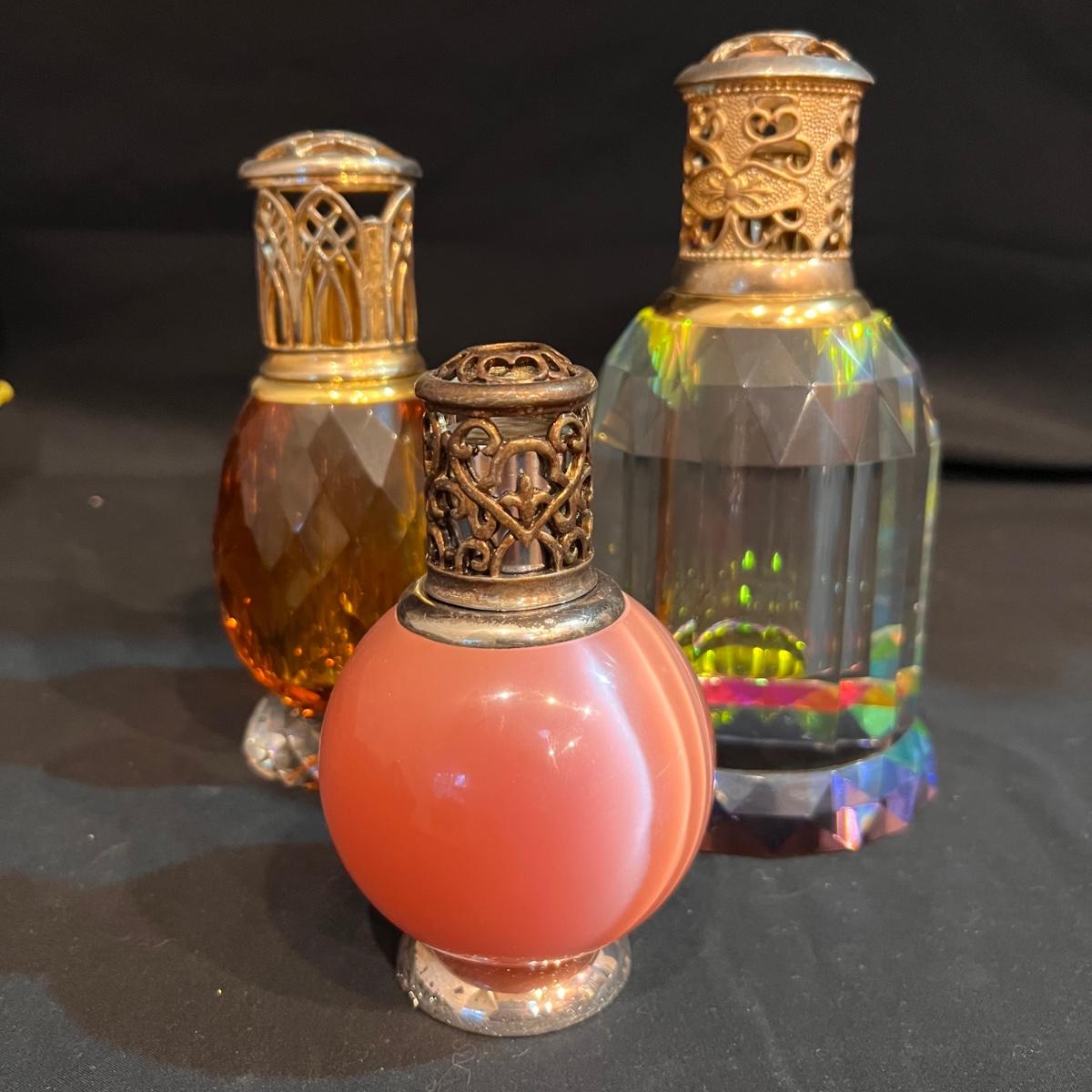 Three very pretty glass fragrance lamps. The largest has a rainbow of colors and is bell shaped. The mid sized lamp is amber and the smallest is an attractive rose colored glass with a pearlescent sheen. None have wicks.
