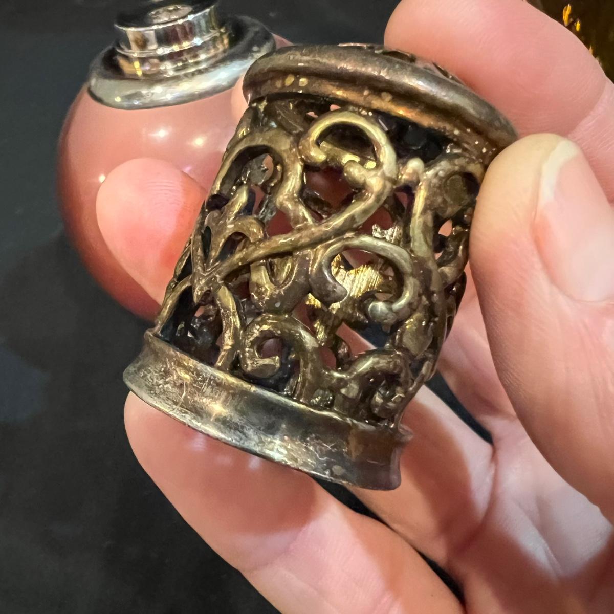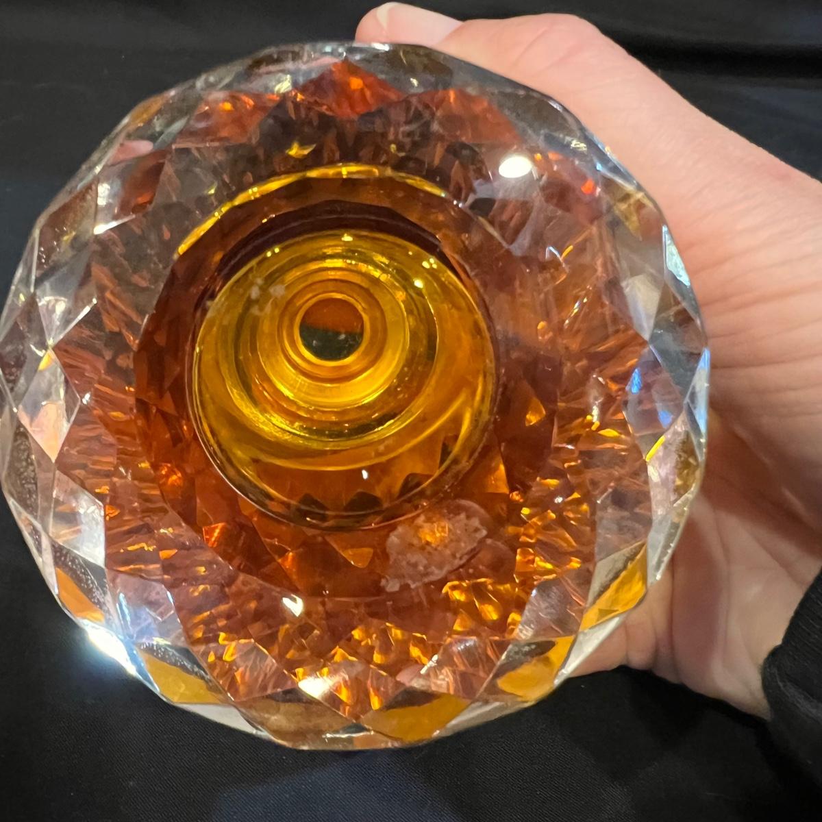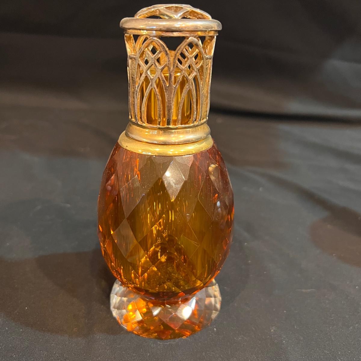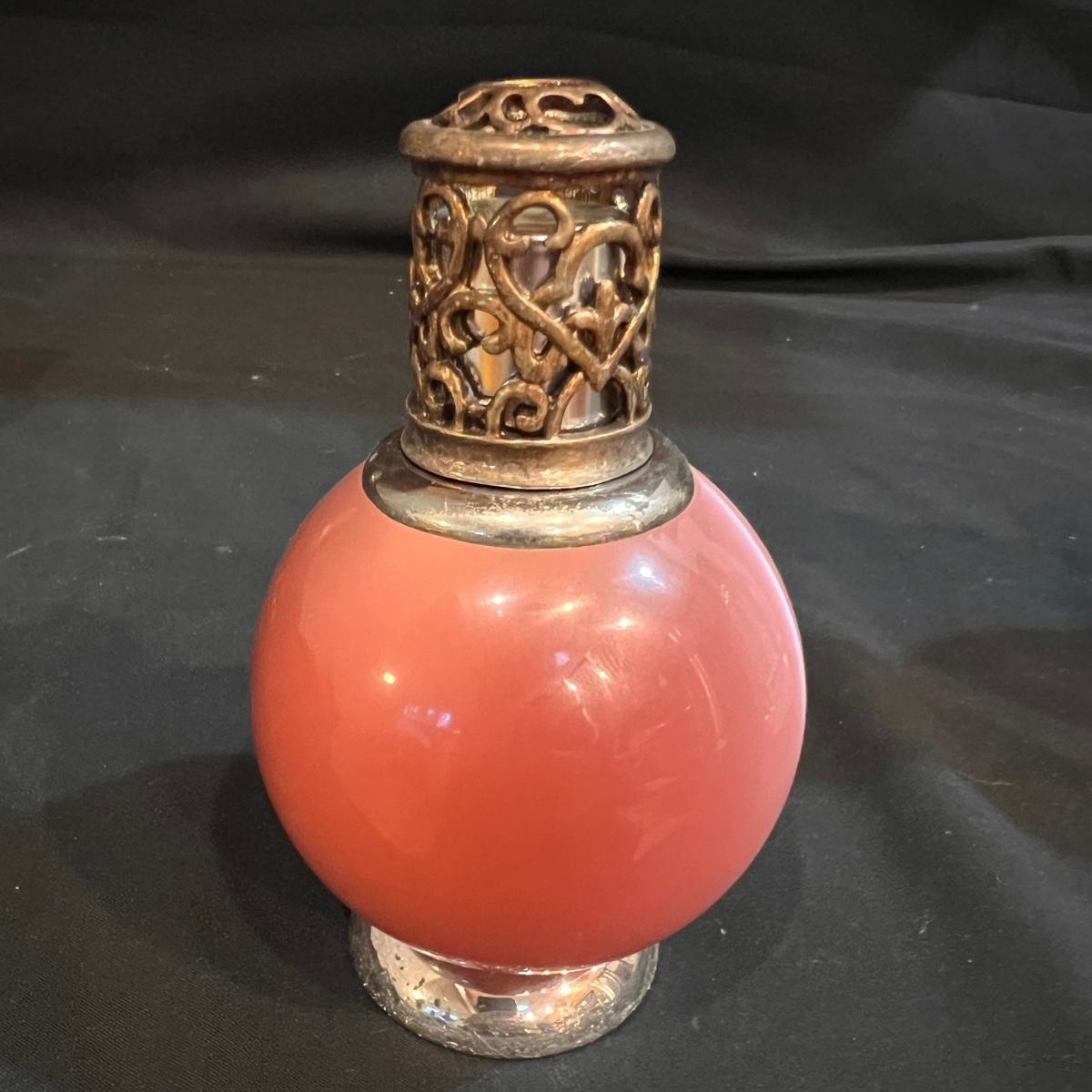 Three very pretty glass fragrance lamps. The largest has a rainbow of colors and is bell shaped. The mid sized lamp is amber and the smallest is an attractive rose colored glass with a pearlescent sheen. None have wicks.