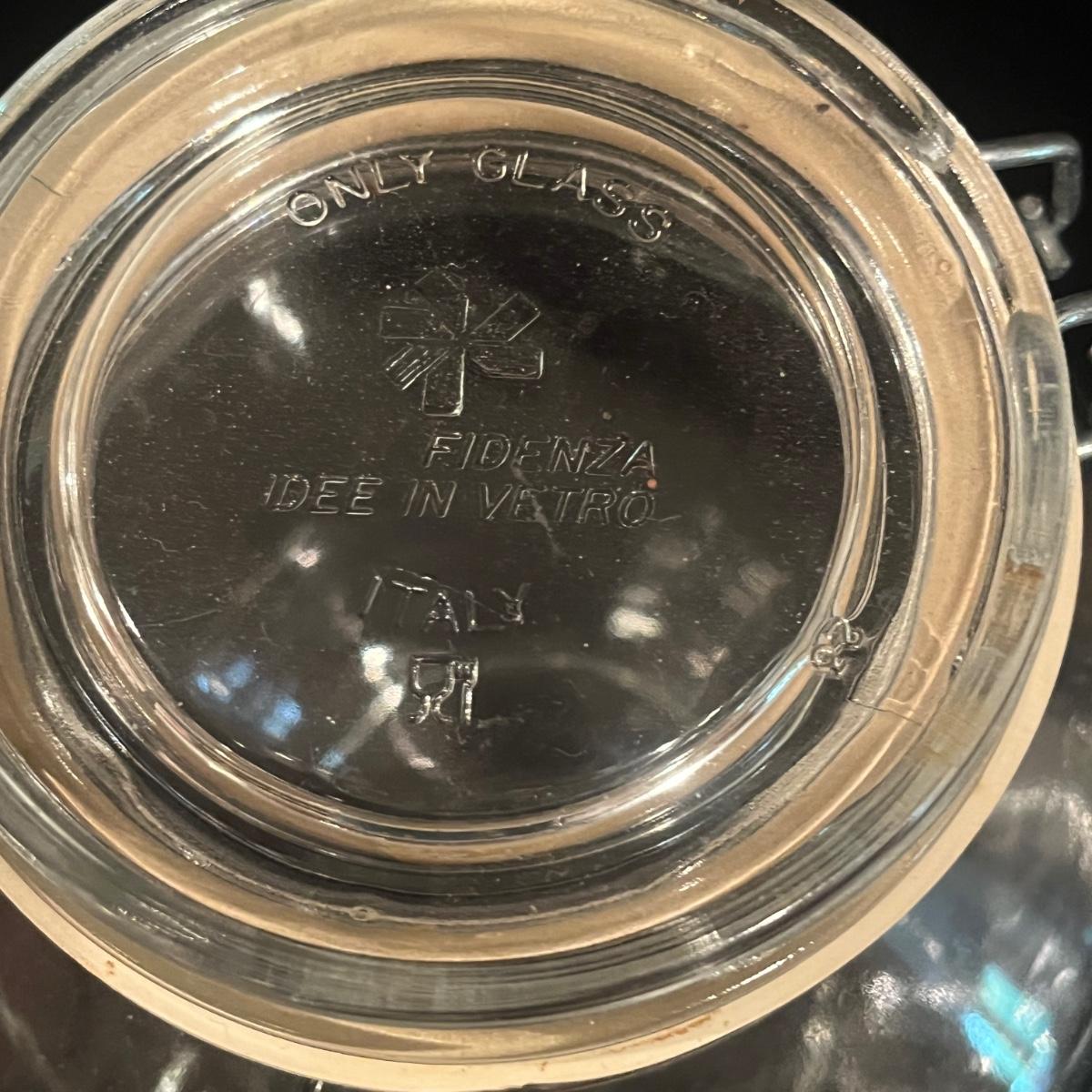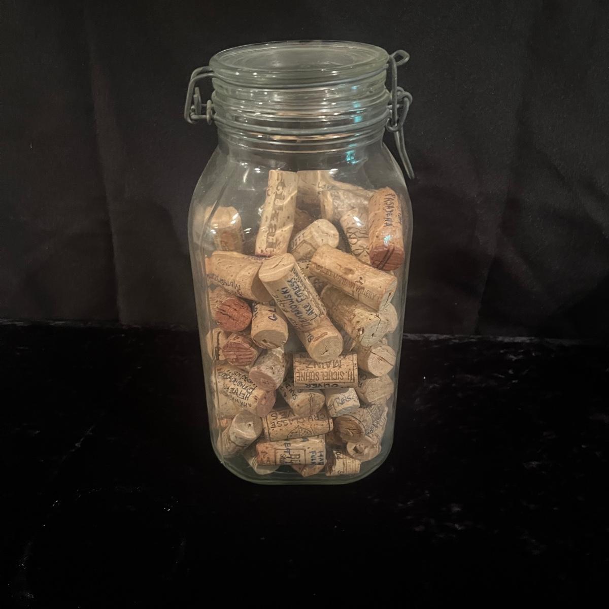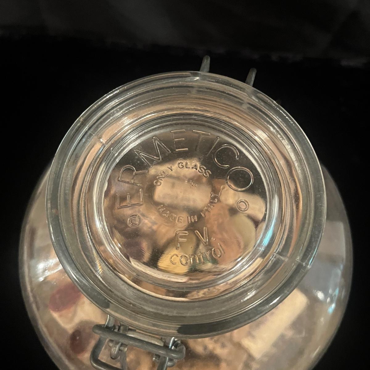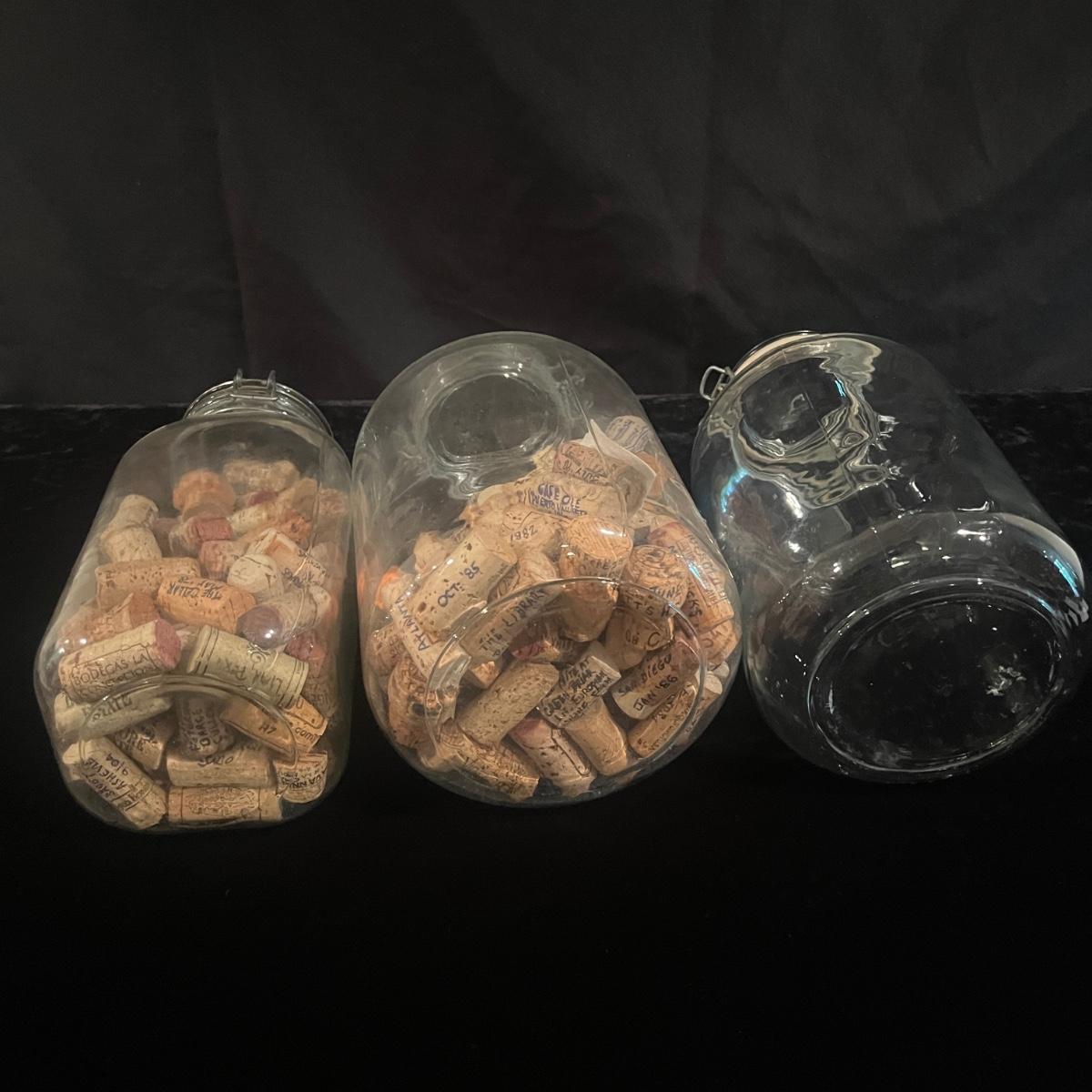 Lot includes two Ermetico glass jars and one Fidenza jar. All three with latching lids. Comes with a collection of wine corks. Largest jar measures 7”D x 11”H.