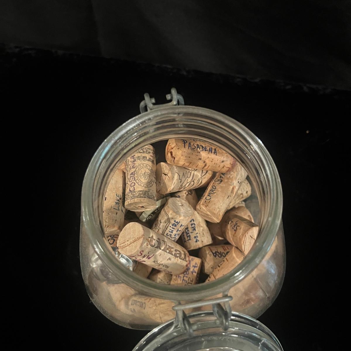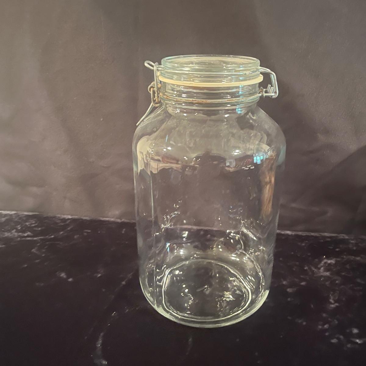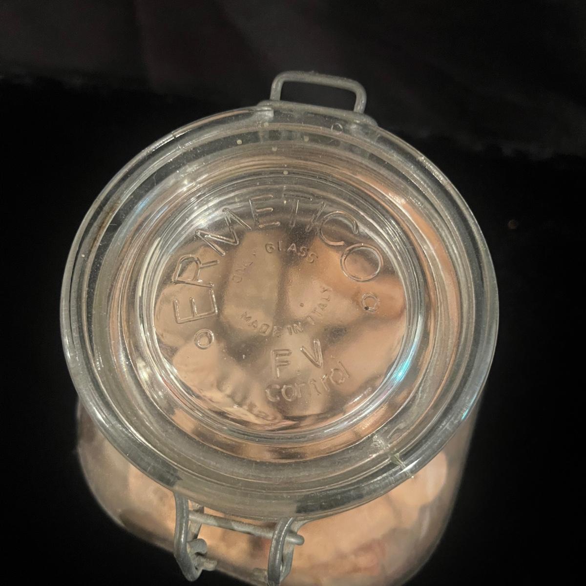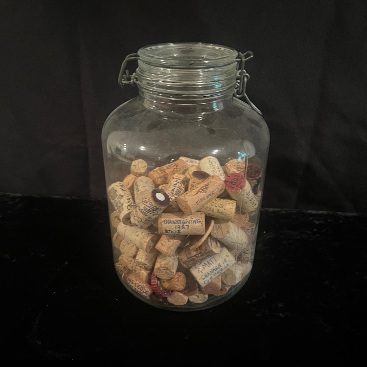 Lot includes two Ermetico glass jars and one Fidenza jar. All three with latching lids. Comes with a collection of wine corks. Largest jar measures 7”D x 11”H.