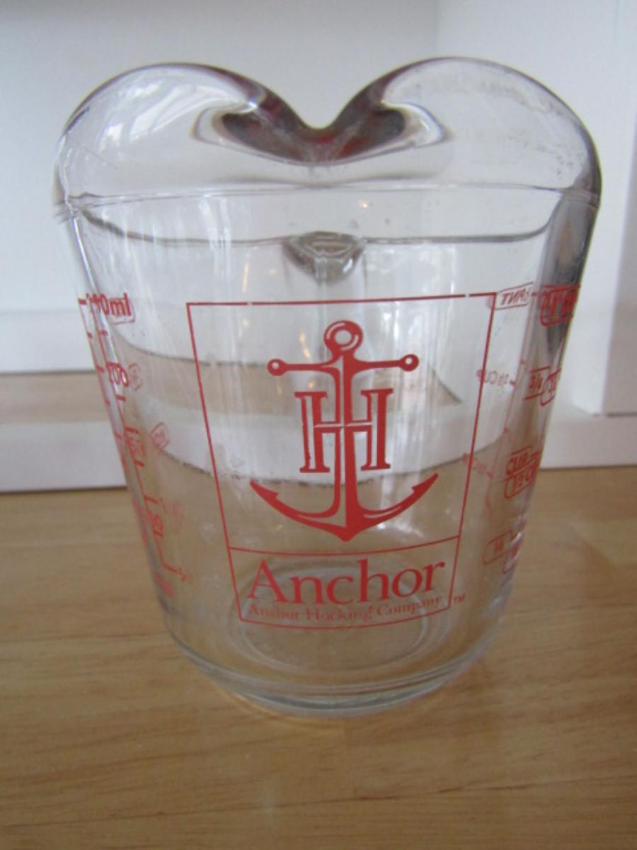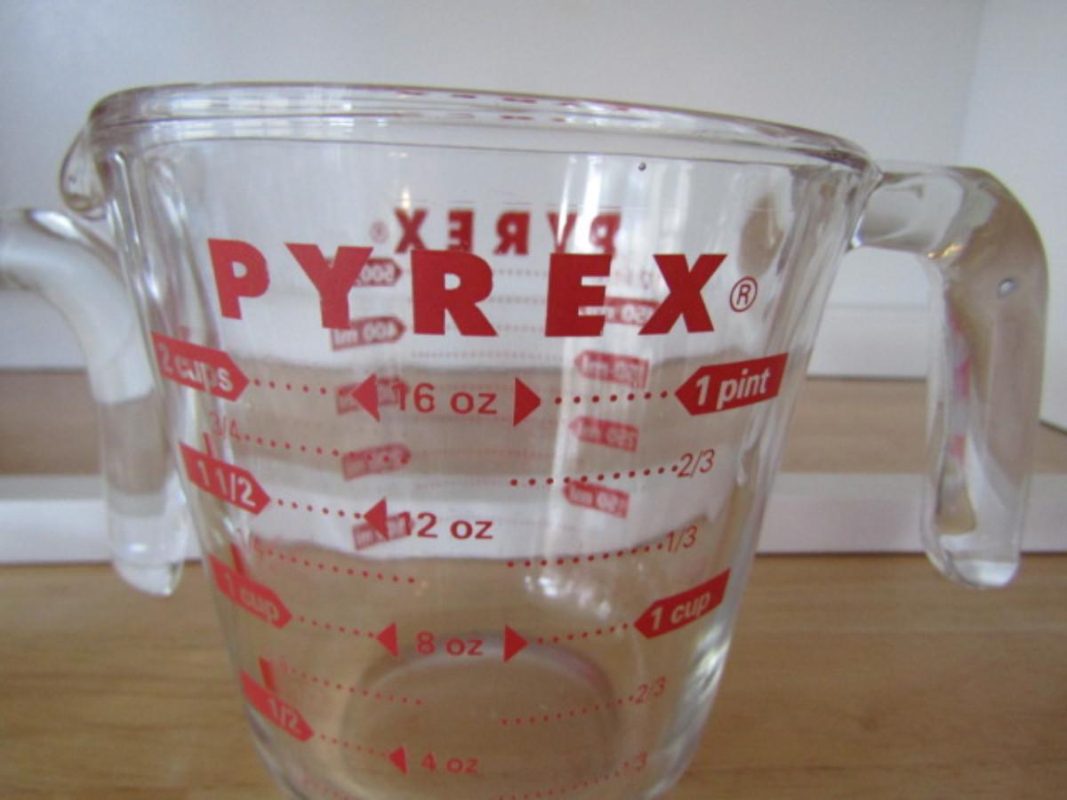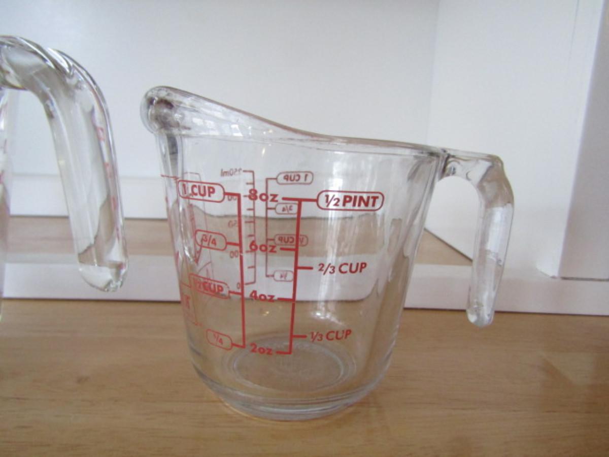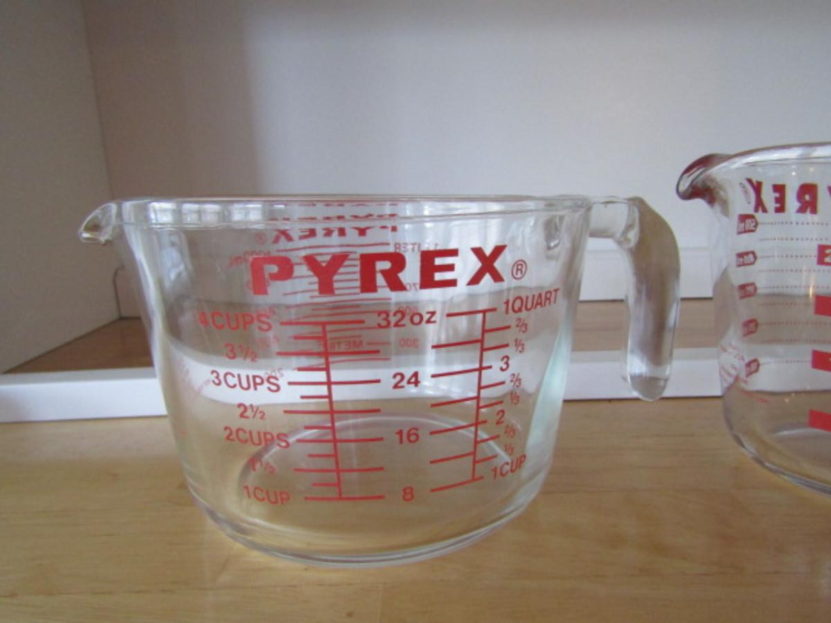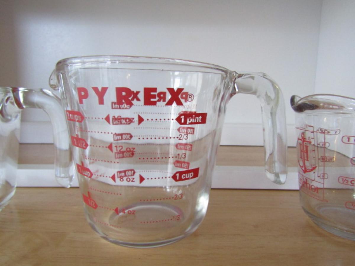Three Glass Measuring Cups- Pyrex: Quart and Pint Sizes. Anchor Hocking: Half Pint Size
