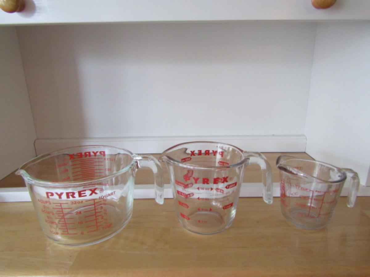 Three Glass Measuring Cups- Pyrex: Quart and Pint Sizes.  Anchor Hocking: Half Pint Size