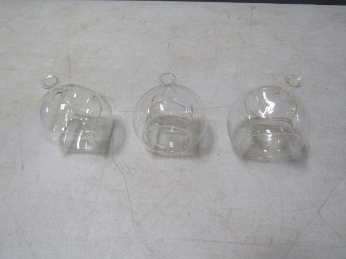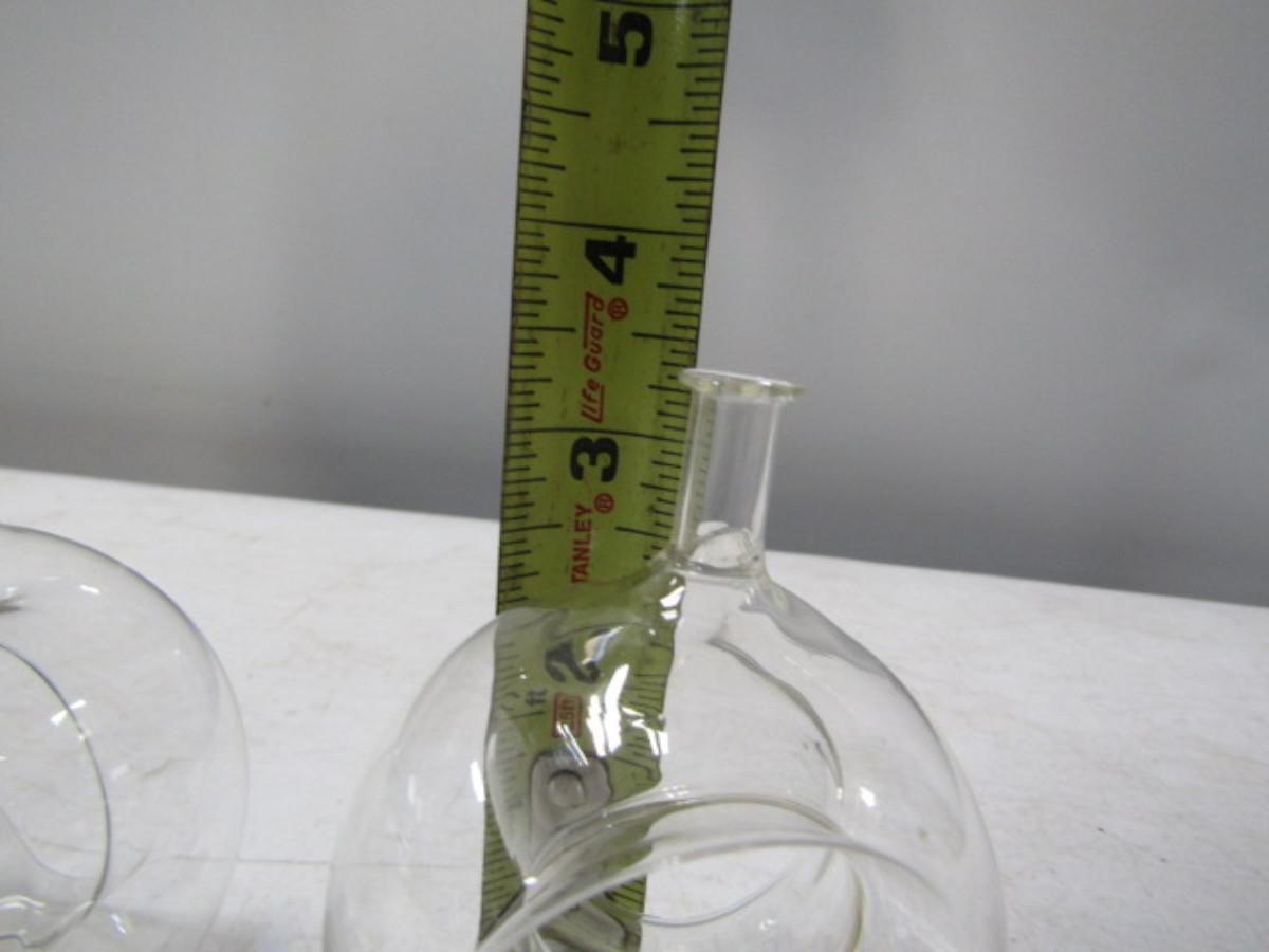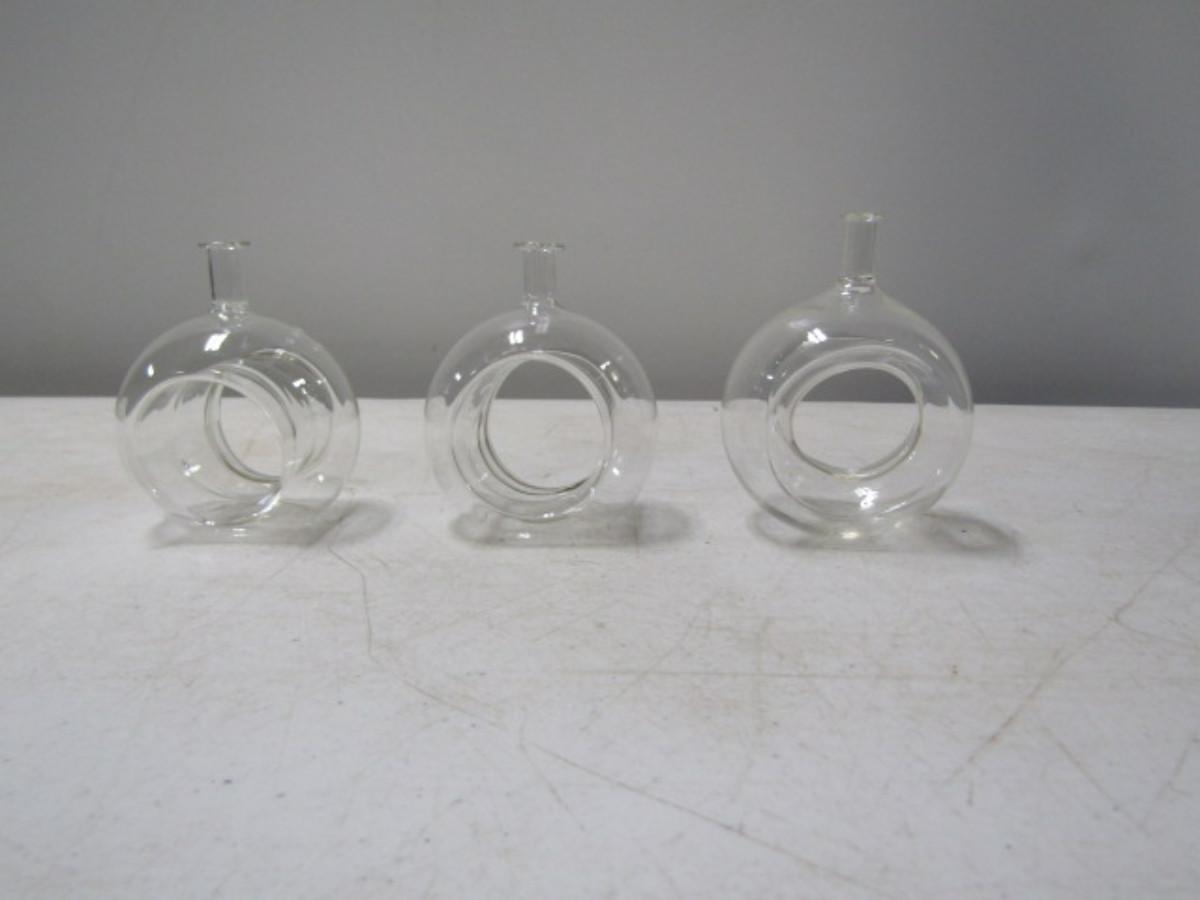 Three Glass O-Shaped Oil Candles: Each Approx 3 1/4" Tall. Would be beautiful when filled with colored lamp oil. Each needs a wick.