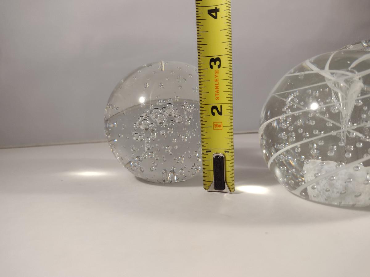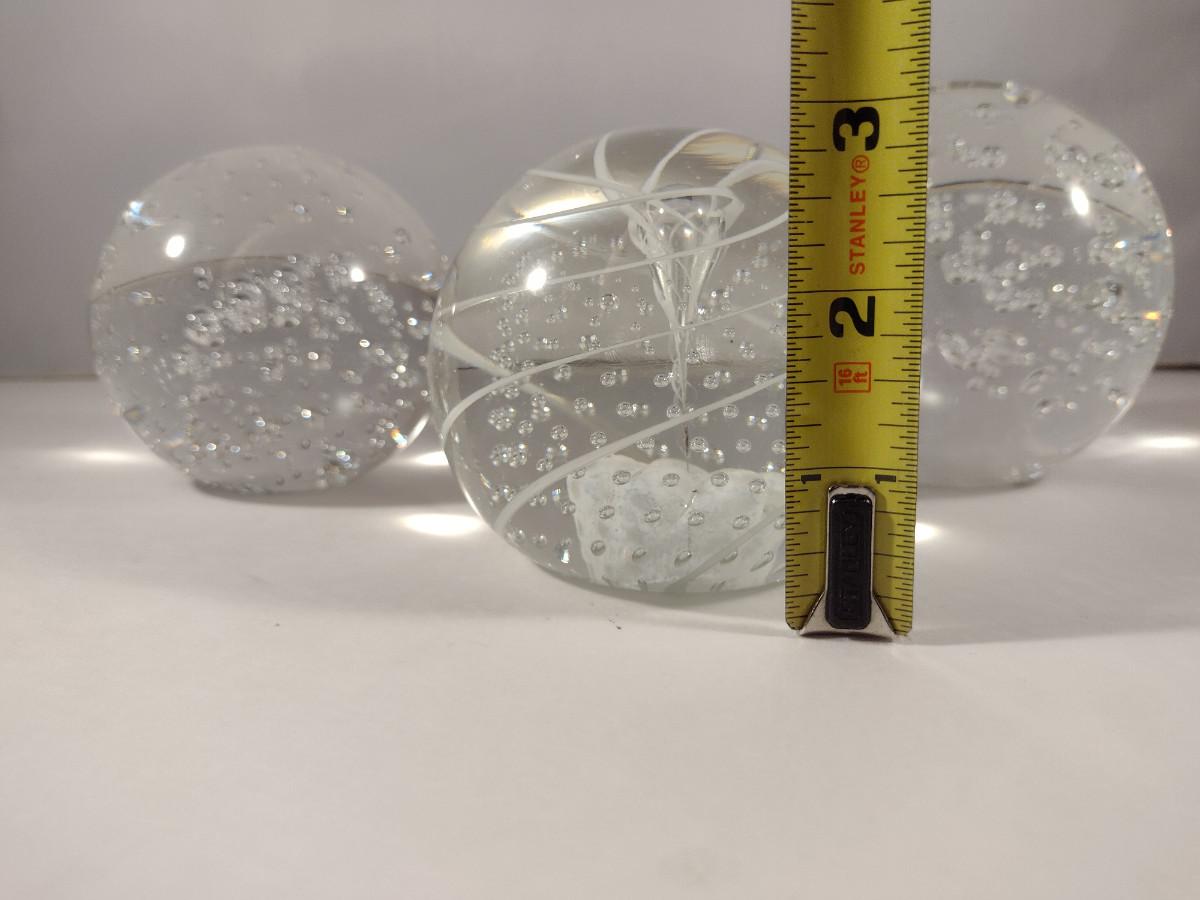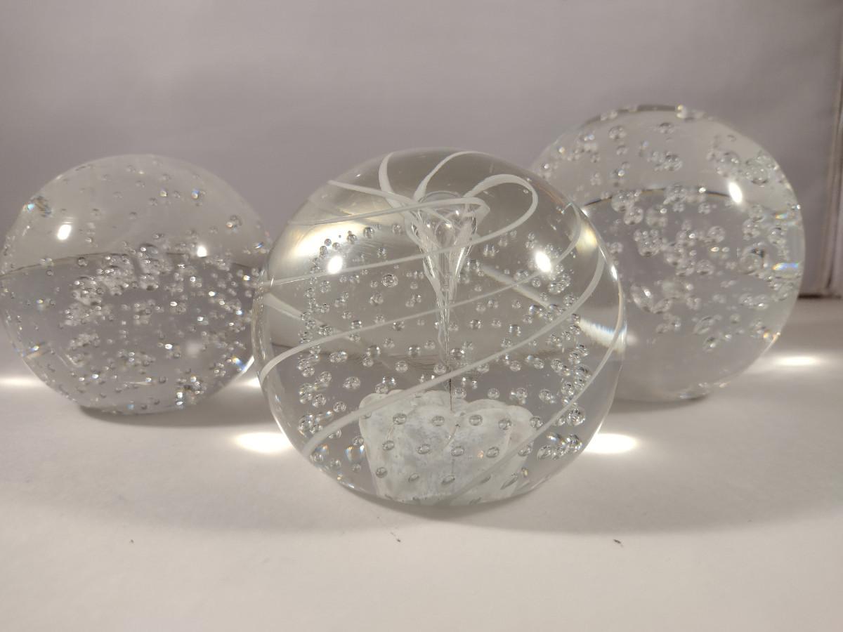 Three Glass Paperweights. Two with bubbles, one with controlled bubbles and swirl is signed.
