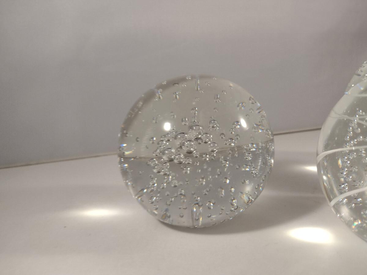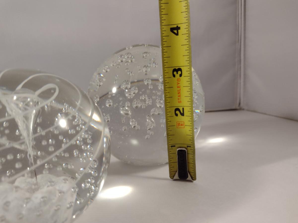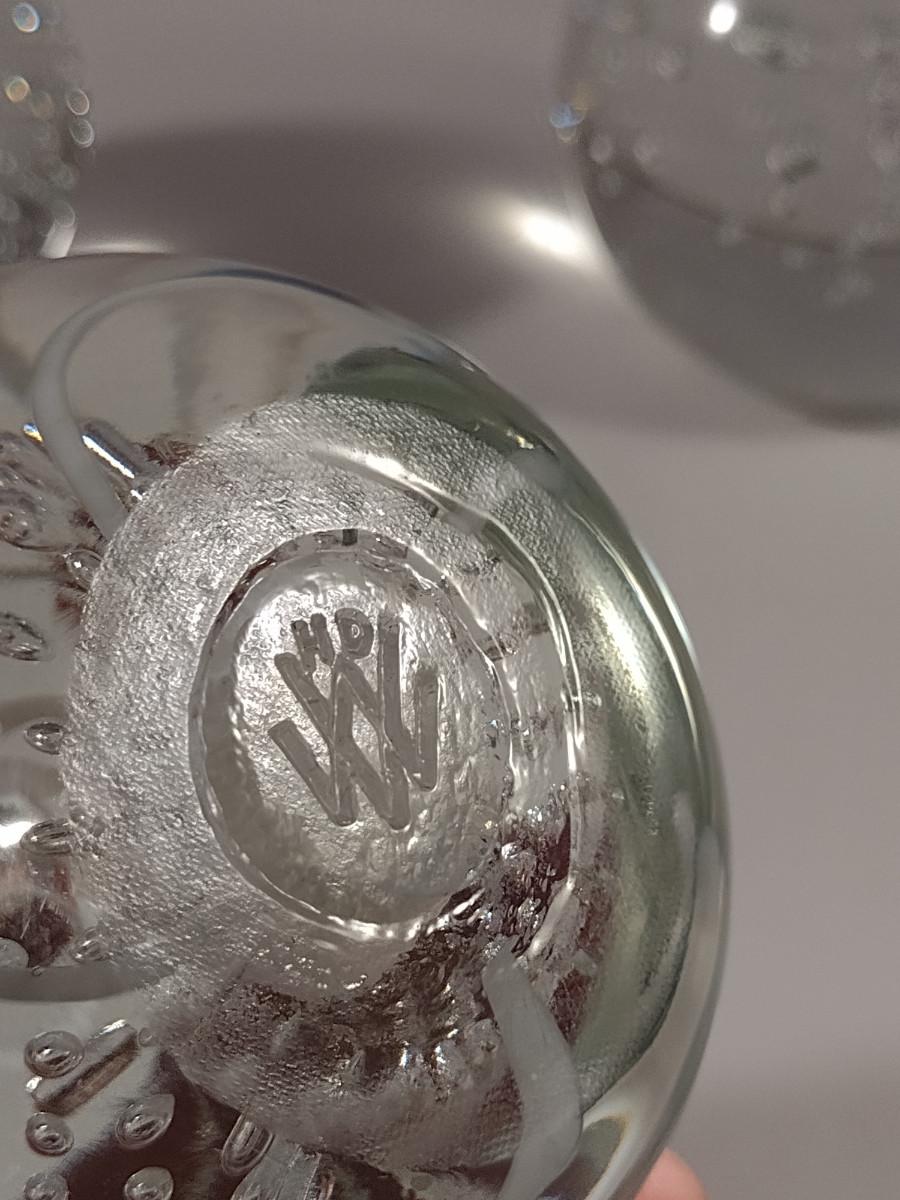 Three Glass Paperweights. Two with bubbles, one with controlled bubbles and swirl is signed.