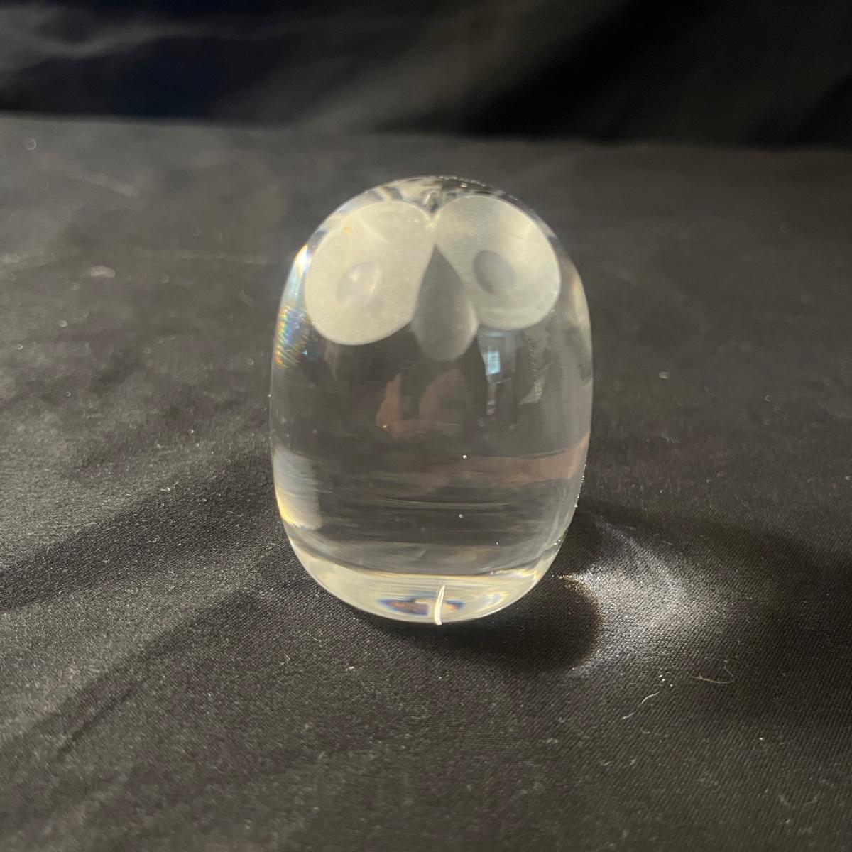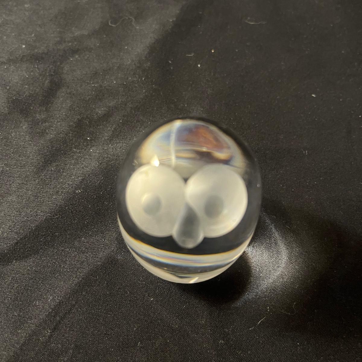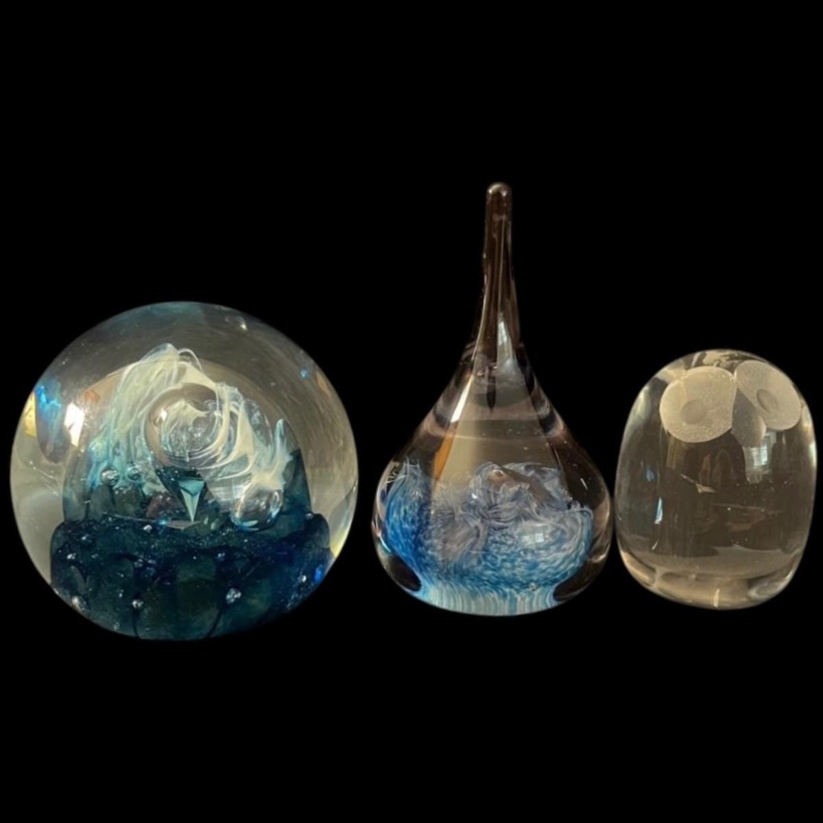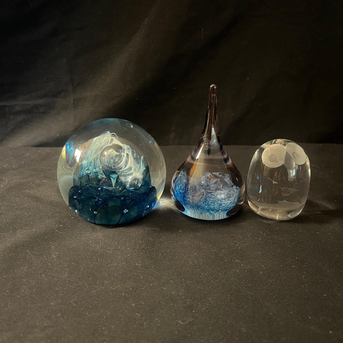 Lot includes three glass paperweights with two having numbers etched on the bottom, see pictures. Largest piece measures 3”D x 2.5”H. One is marked 'Caithness Quicksilver'. Note that the owl has a small blue mark on it shown in pic.