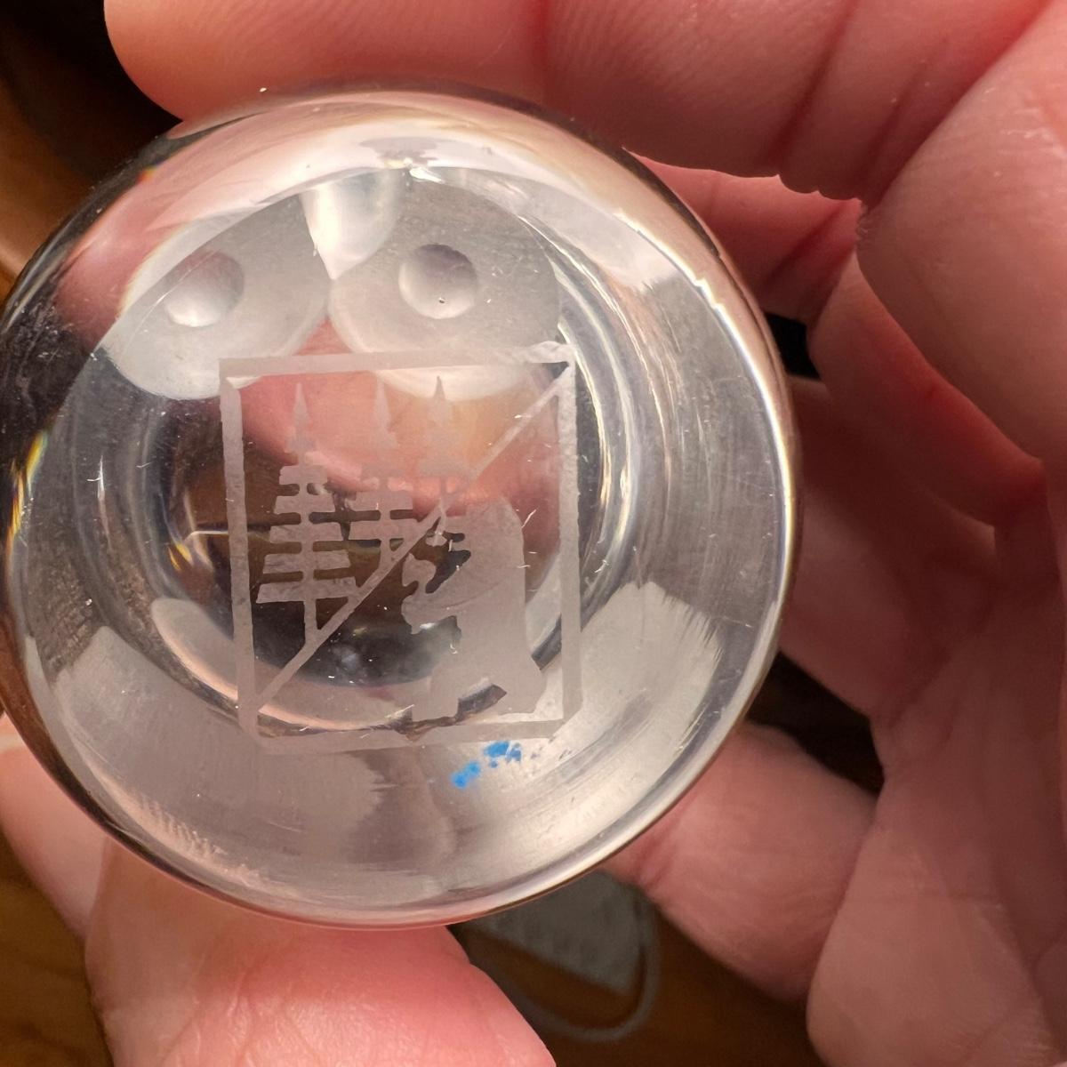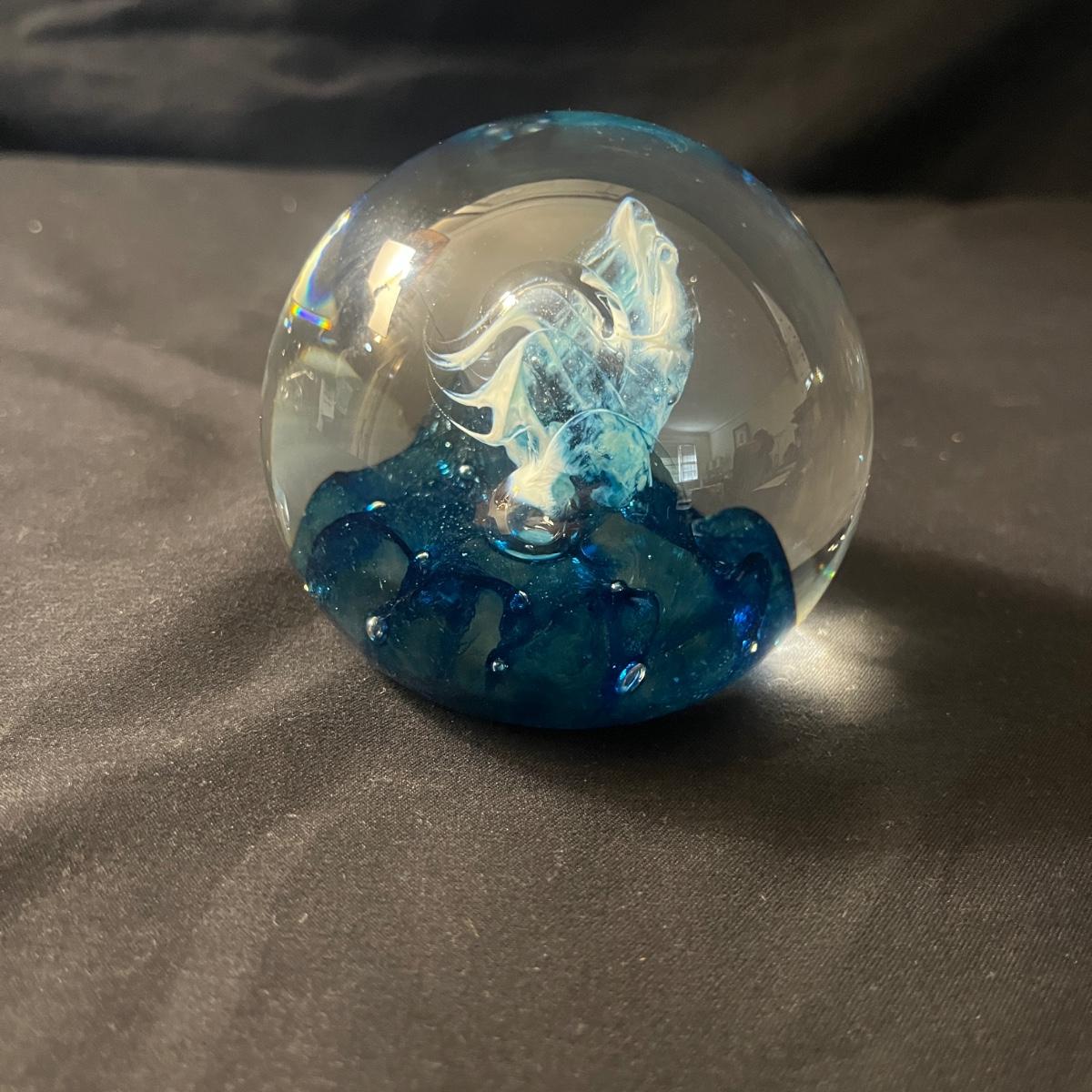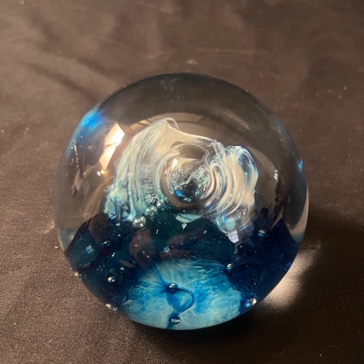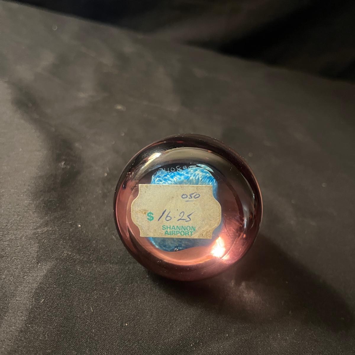 Lot includes three glass paperweights with two having numbers etched on the bottom, see pictures. Largest piece measures 3”D x 2.5”H. One is marked 'Caithness Quicksilver'. Note that the owl has a small blue mark on it shown in pic.