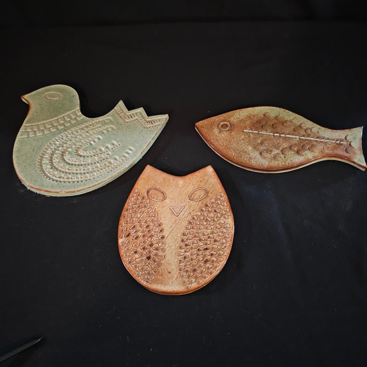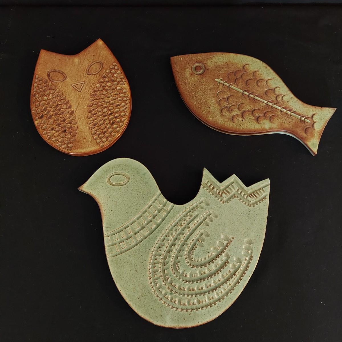 A trio of fun animal shapes in trivet form. All three items have carved relief sections to enhance the design. Large bird is 9.5" x 8"H, fish is 9" x 5"H and owl is 5.25" x 6.5"H. All approximately 3/8" thick. See photos for details. Shipping available.