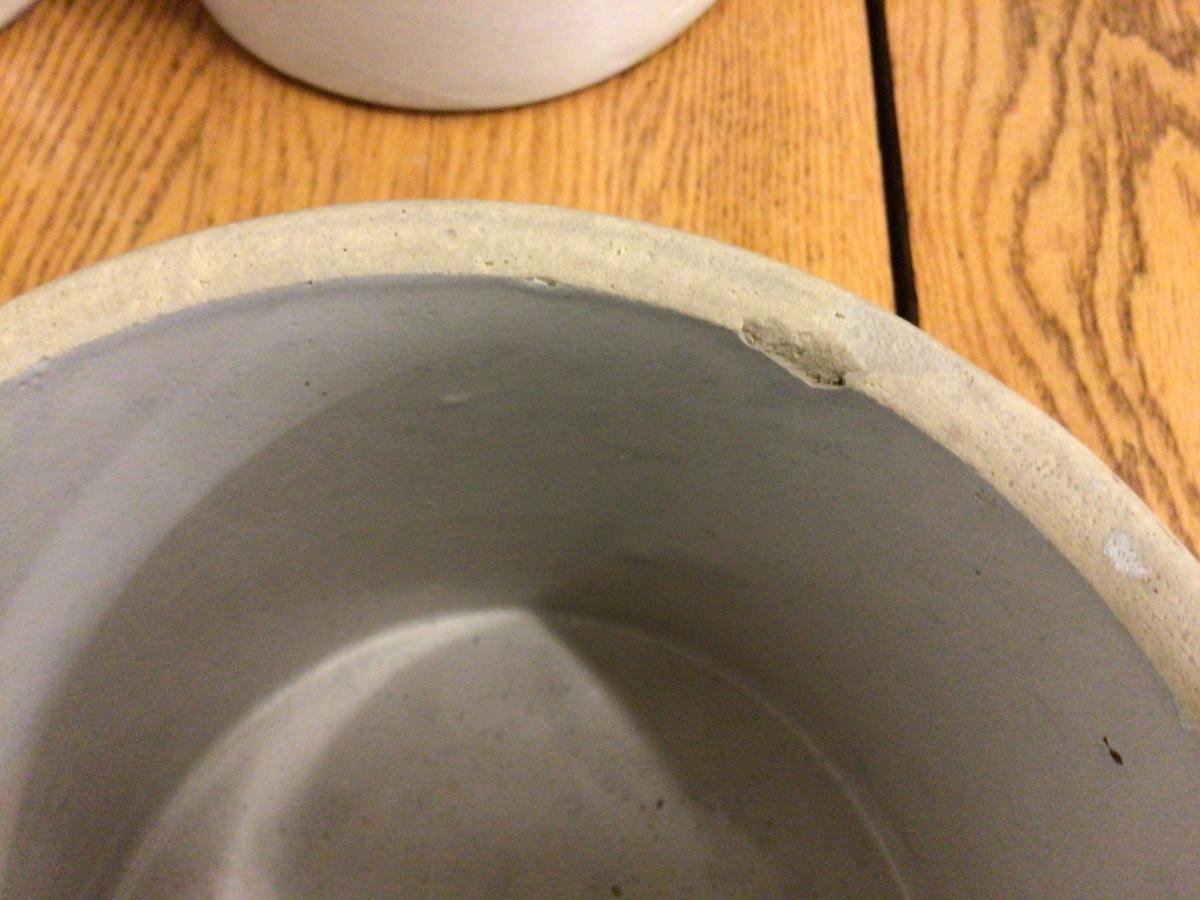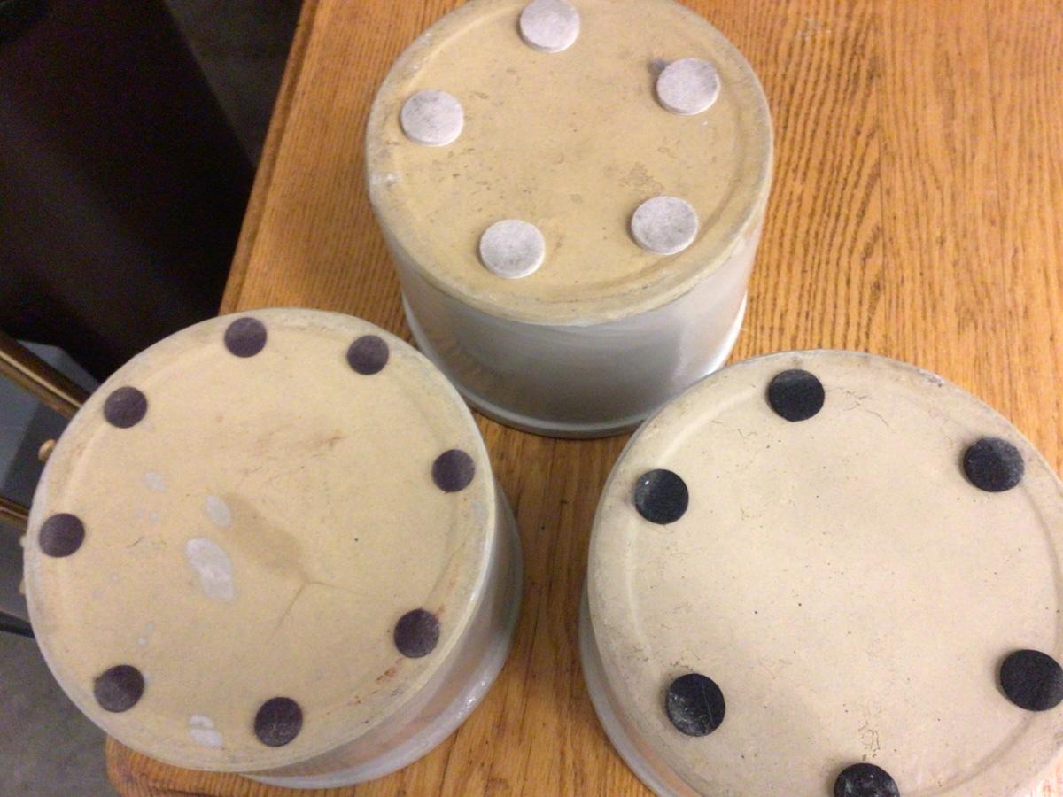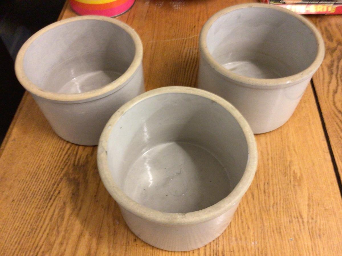 These are three gray crocks. No makers mark, two in great condition one has a few small chips.