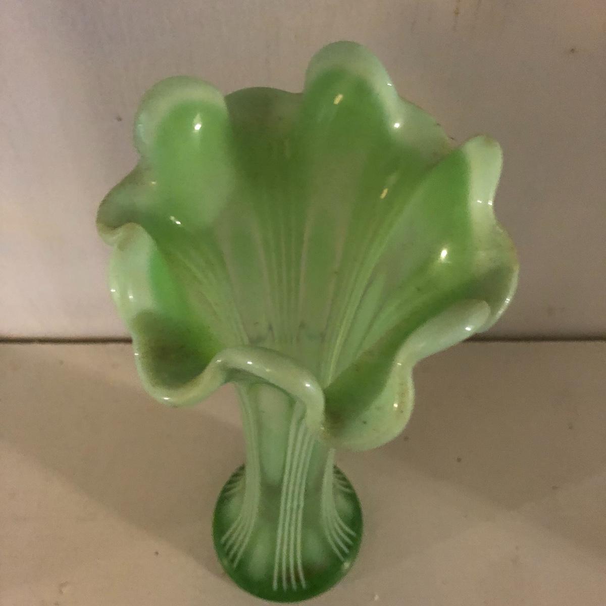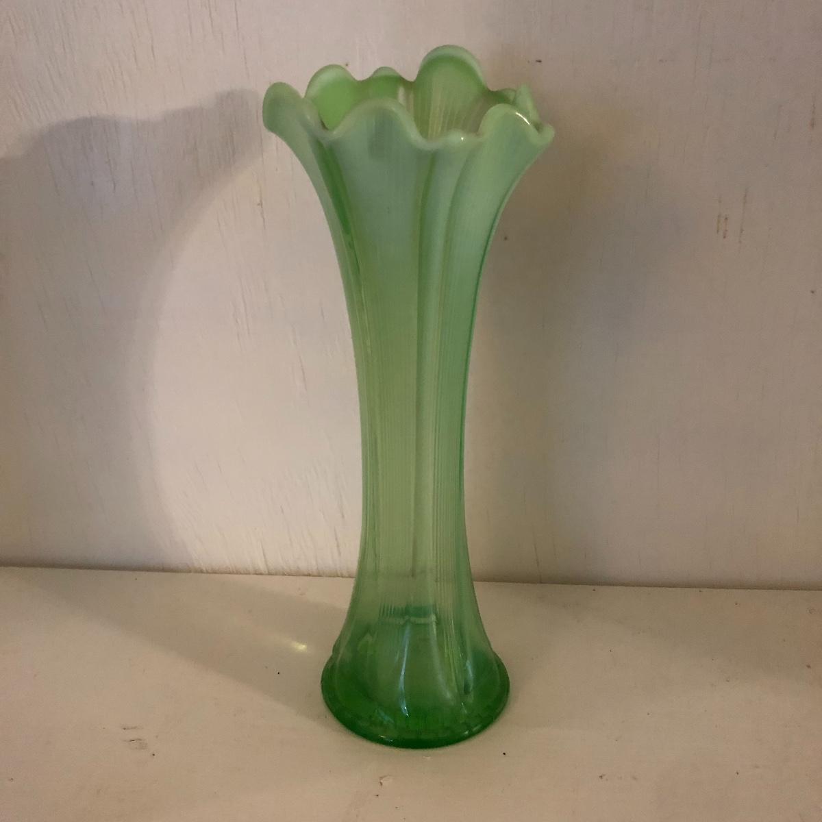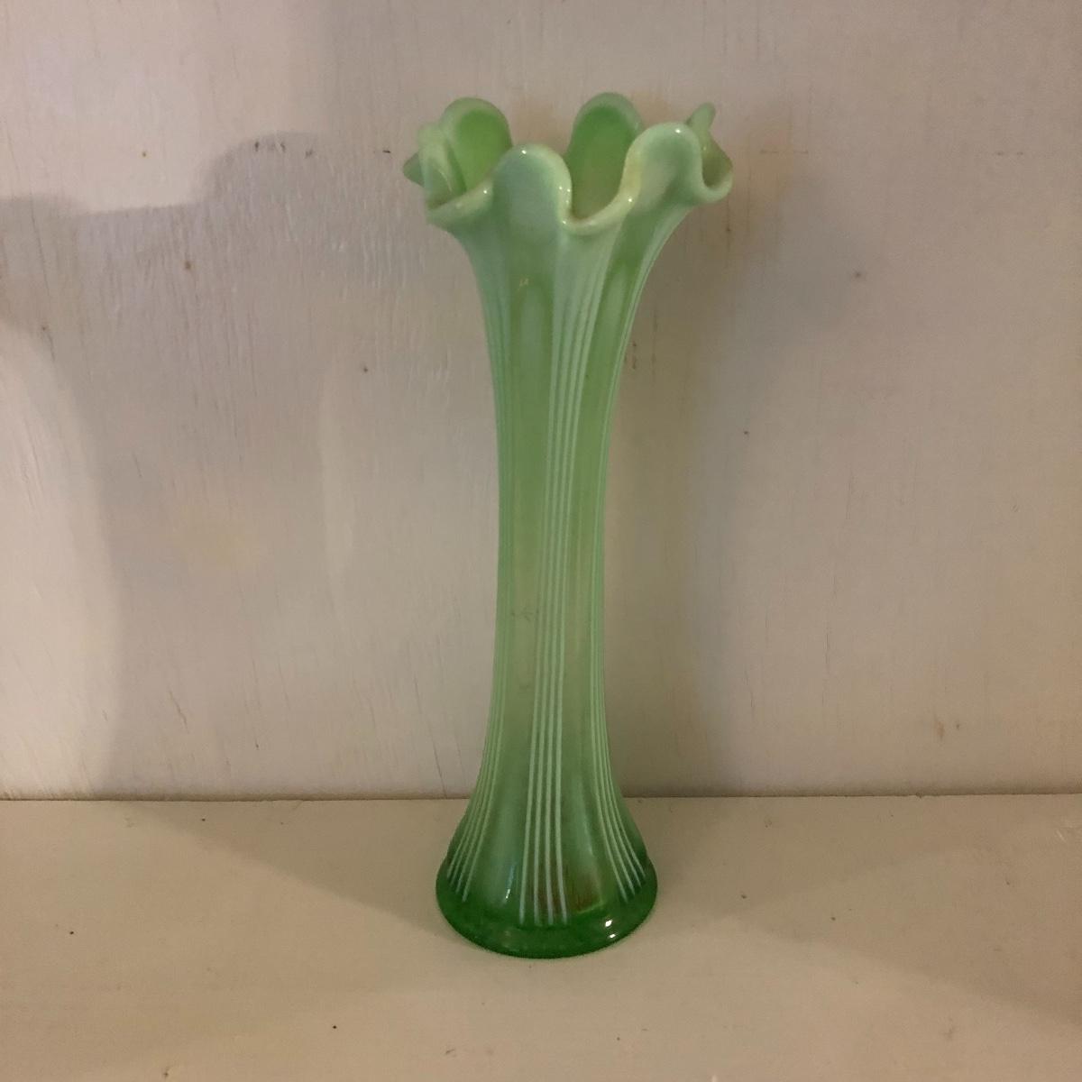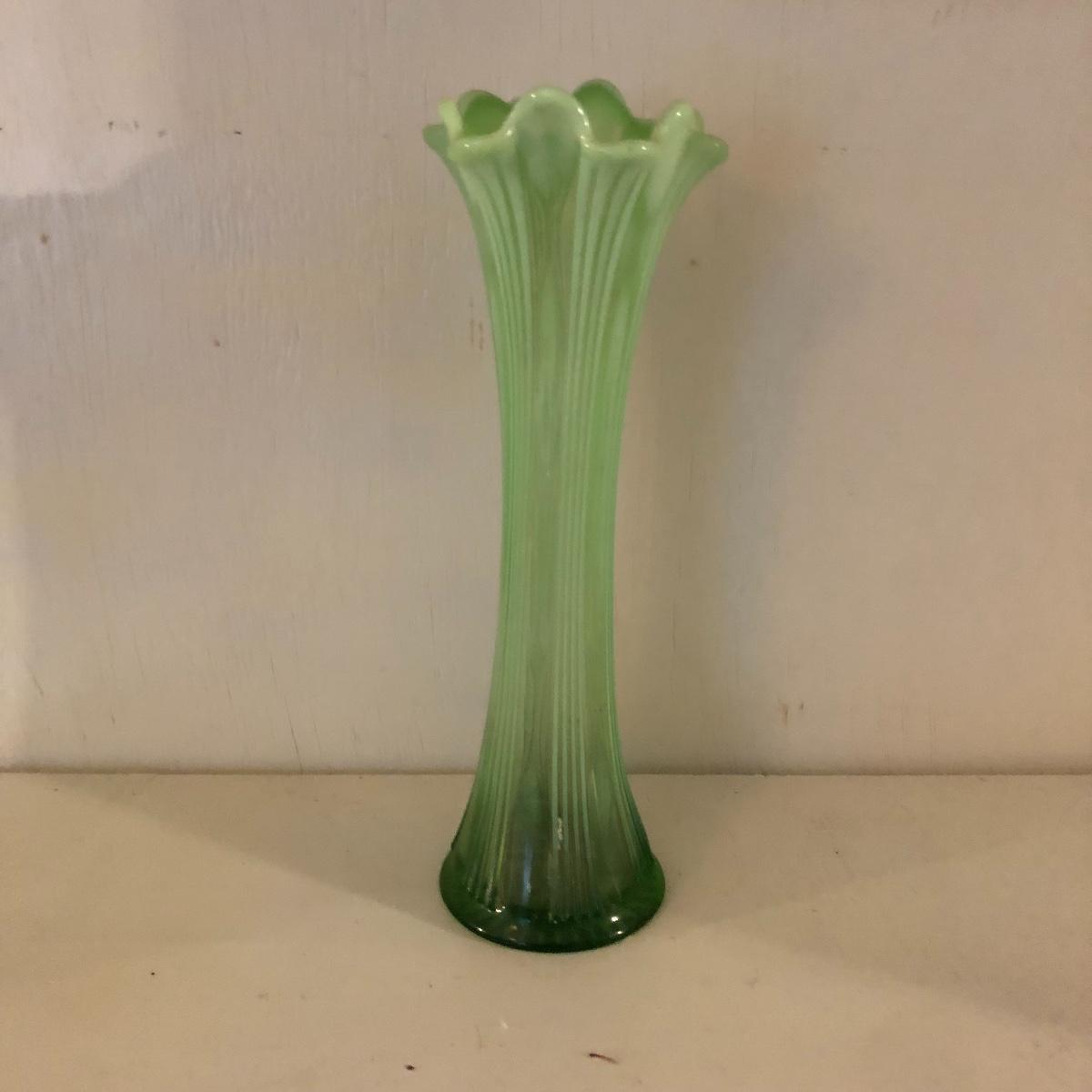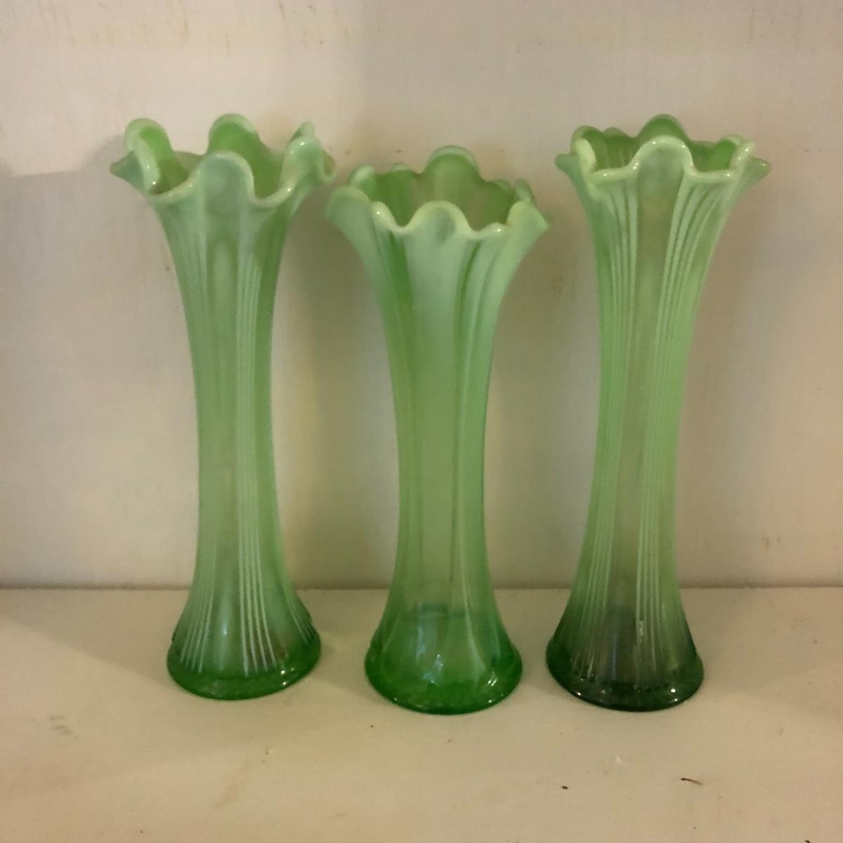 Three very similar green glass vases with slight variations in the Stripes that make up their pattern. Tallest vase measures 4”D x 12” tall. Shipping Available