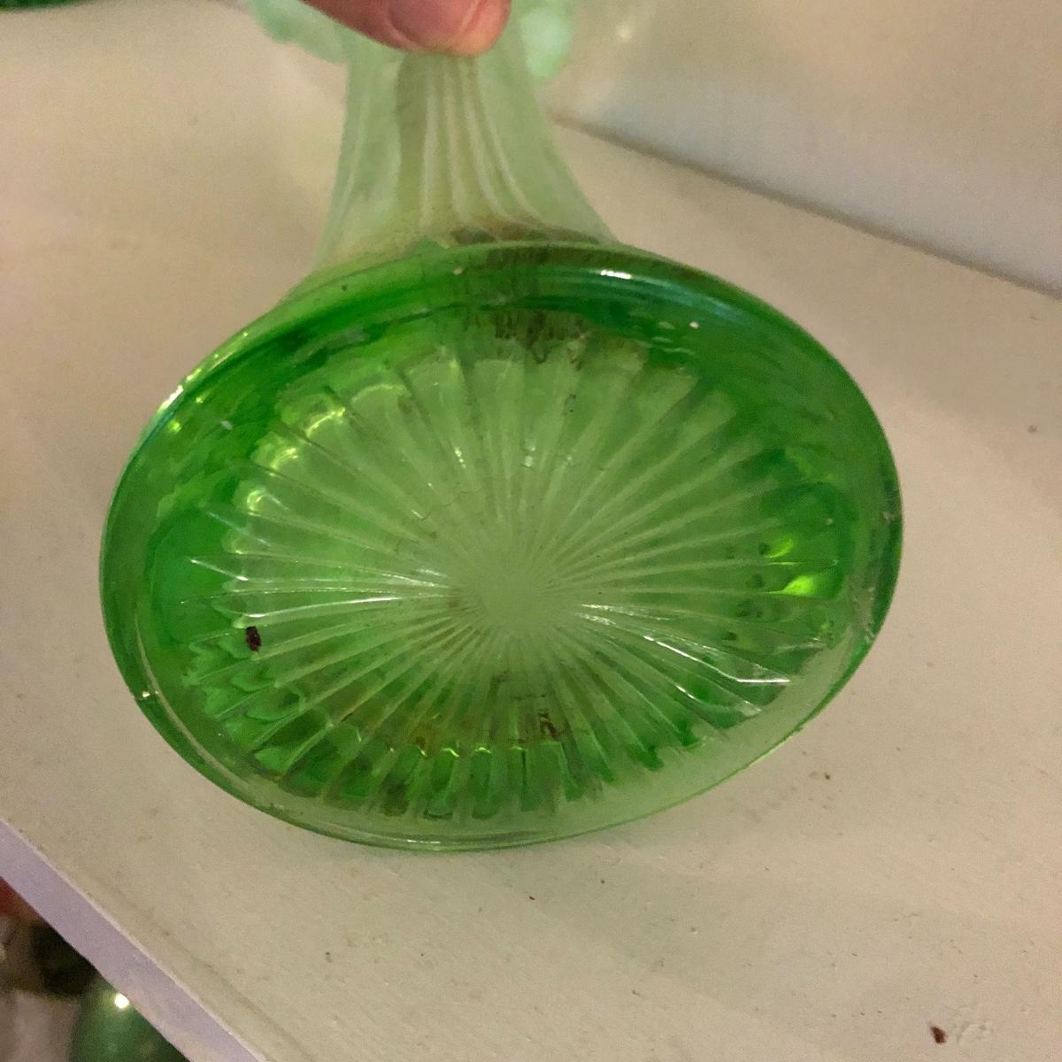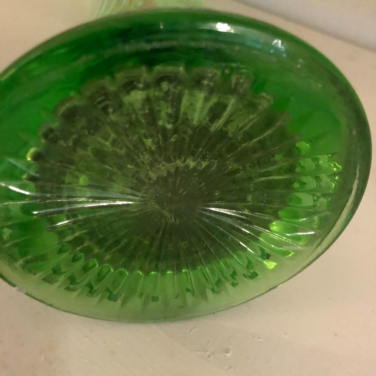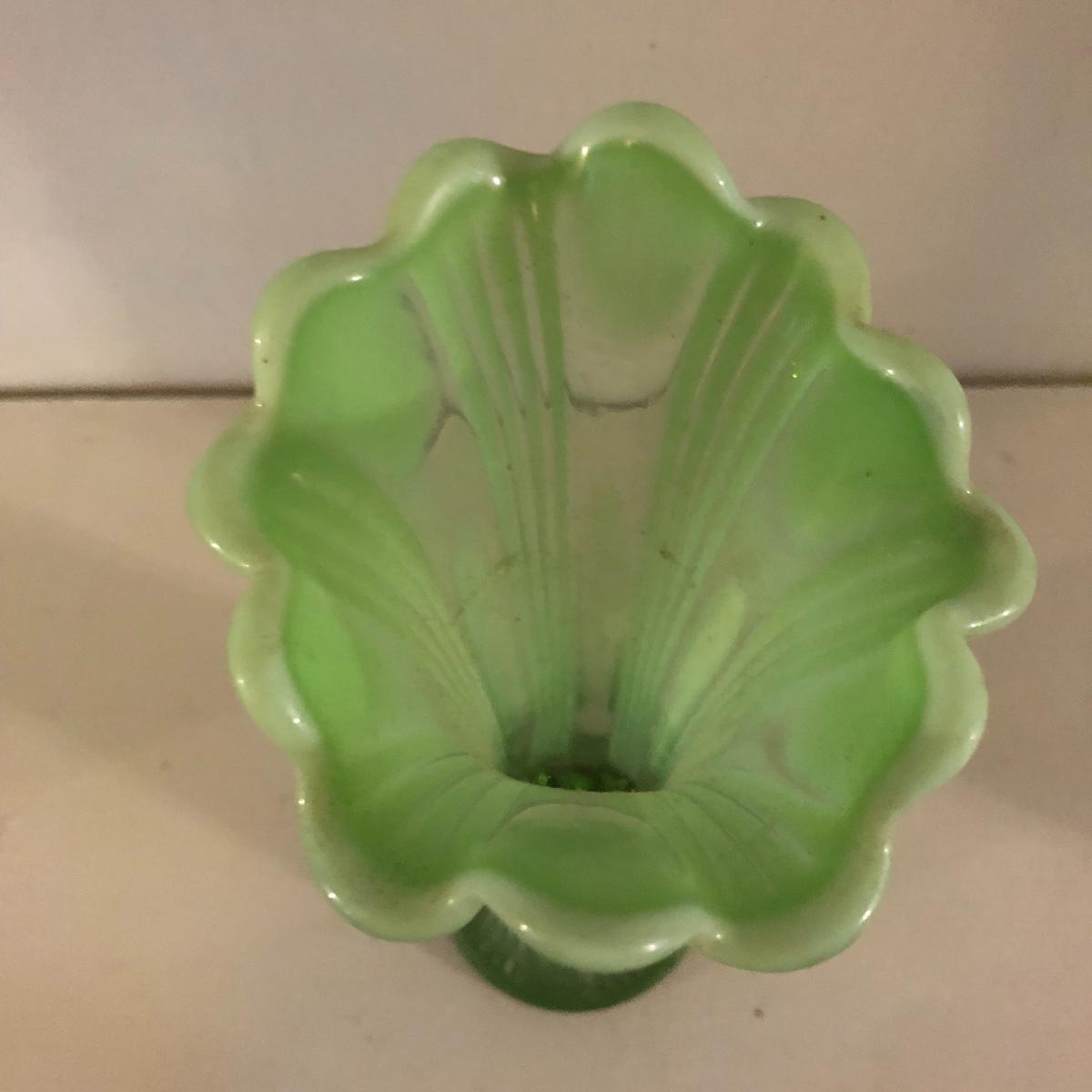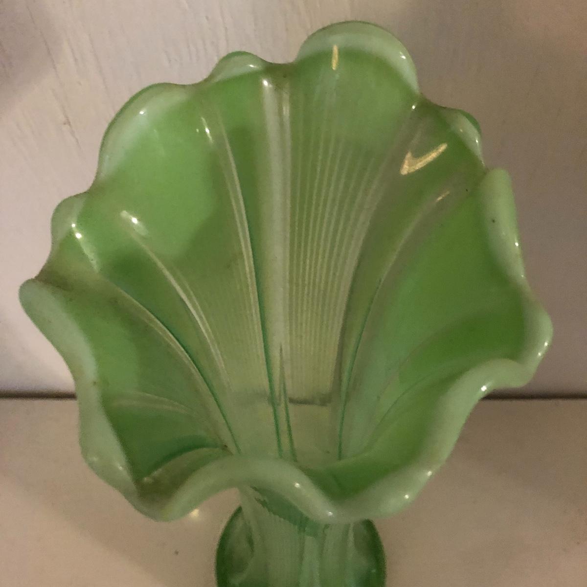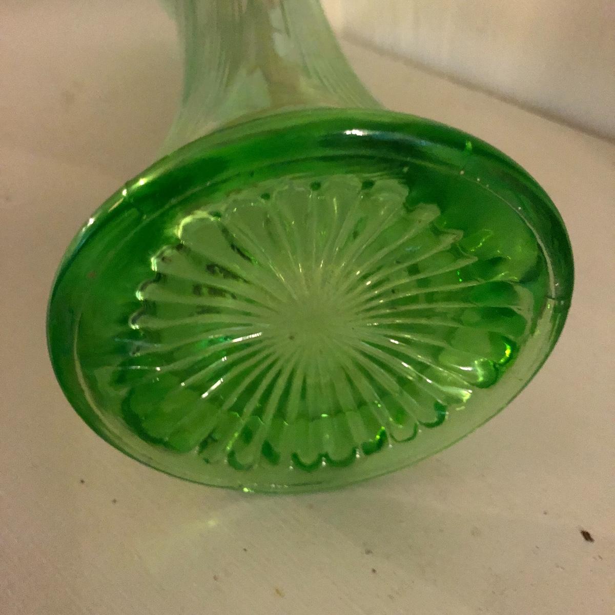 Three very similar green glass vases with slight variations in the Stripes that make up their pattern. Tallest vase measures 4”D x 12” tall. Shipping Available