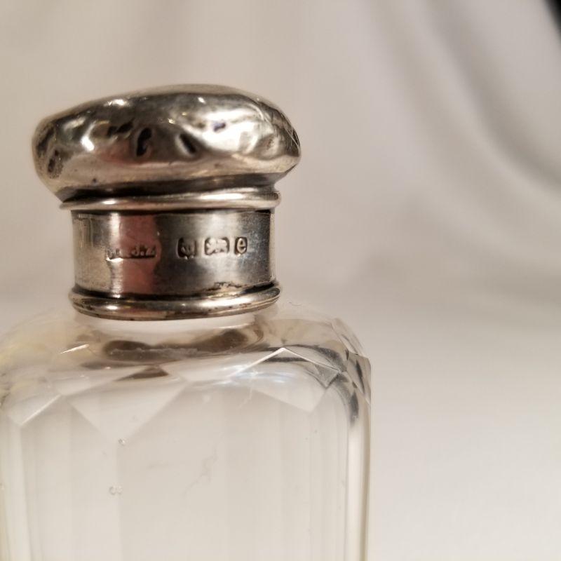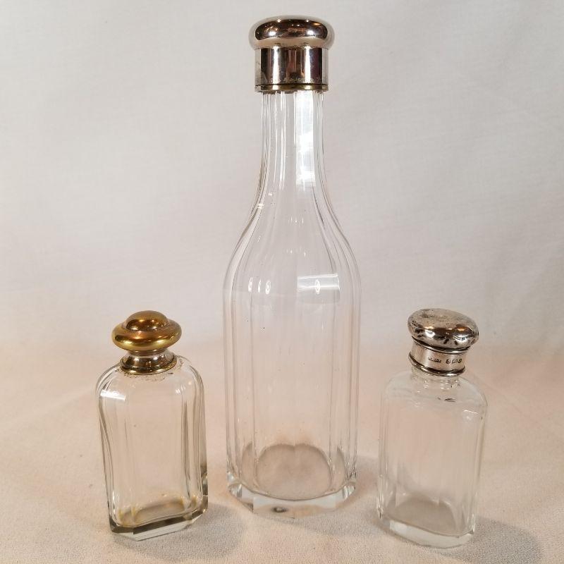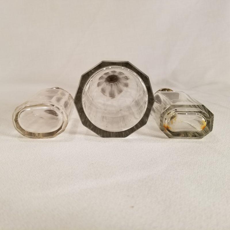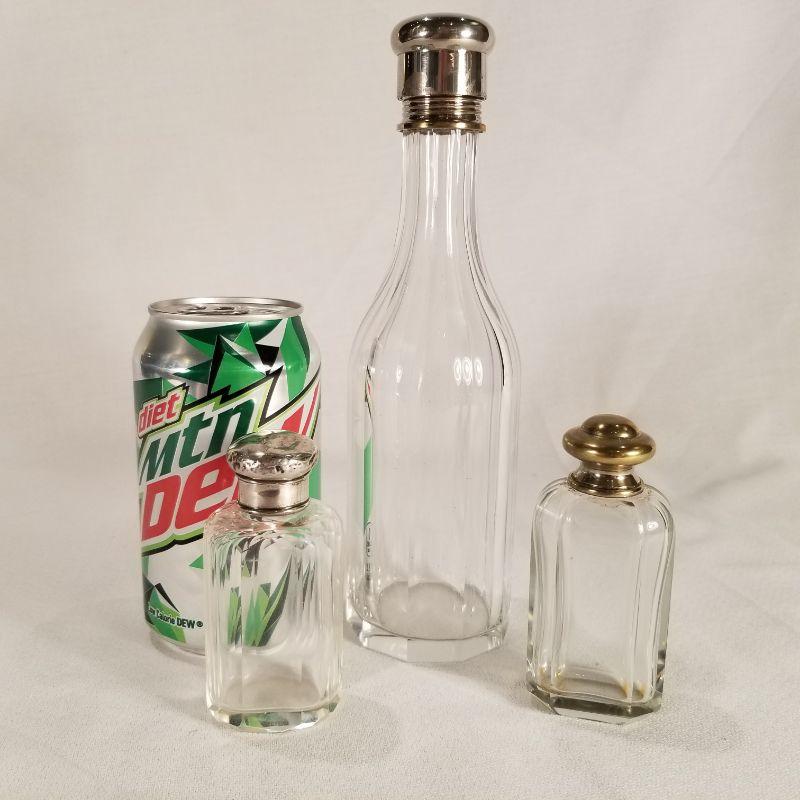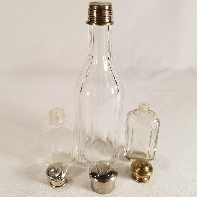 Three handsome ground glass bottles. This vintage glass weighs heavy with very minor wear consistent with age. Two have tops that are most likely sterling silver but are unmarked and have not been tested - each has a few dents. The third top is brass. All tops are of the screw-on variety. Excellent for so many uses.