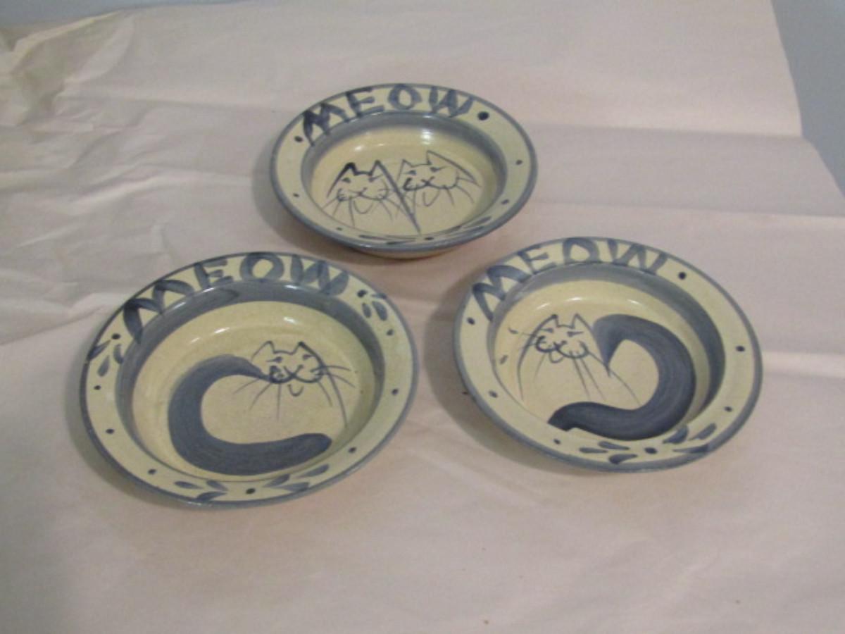 Three Handmade and Signed Pottery Cat Water and Food Bowls (E)