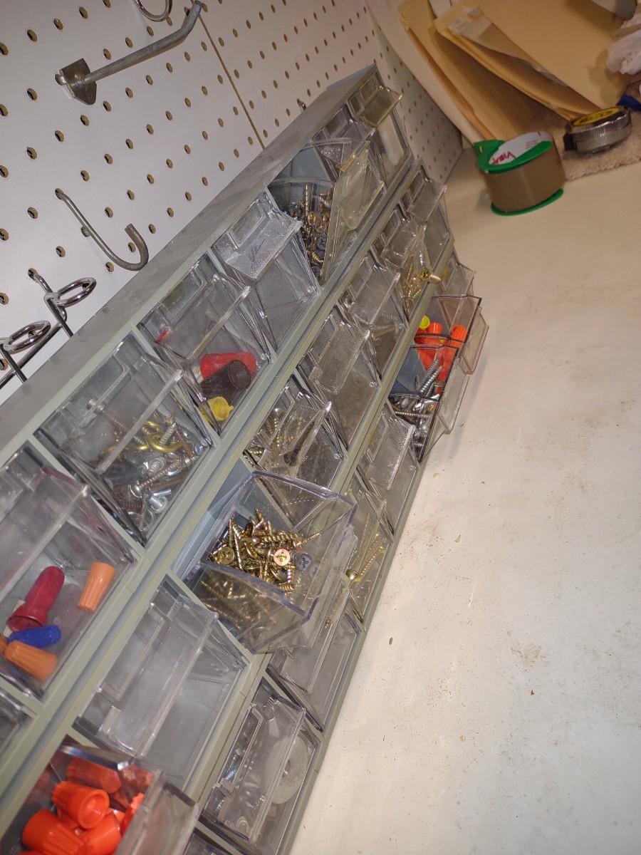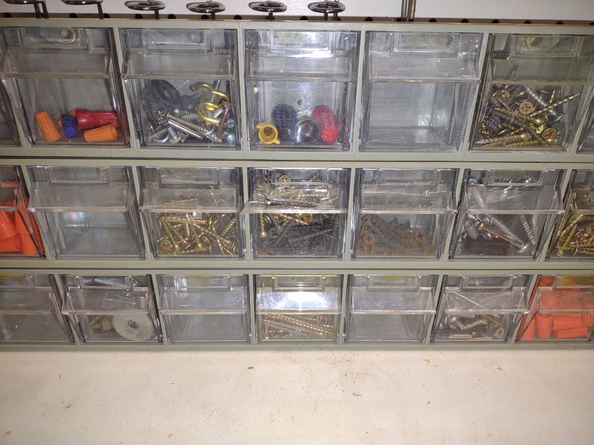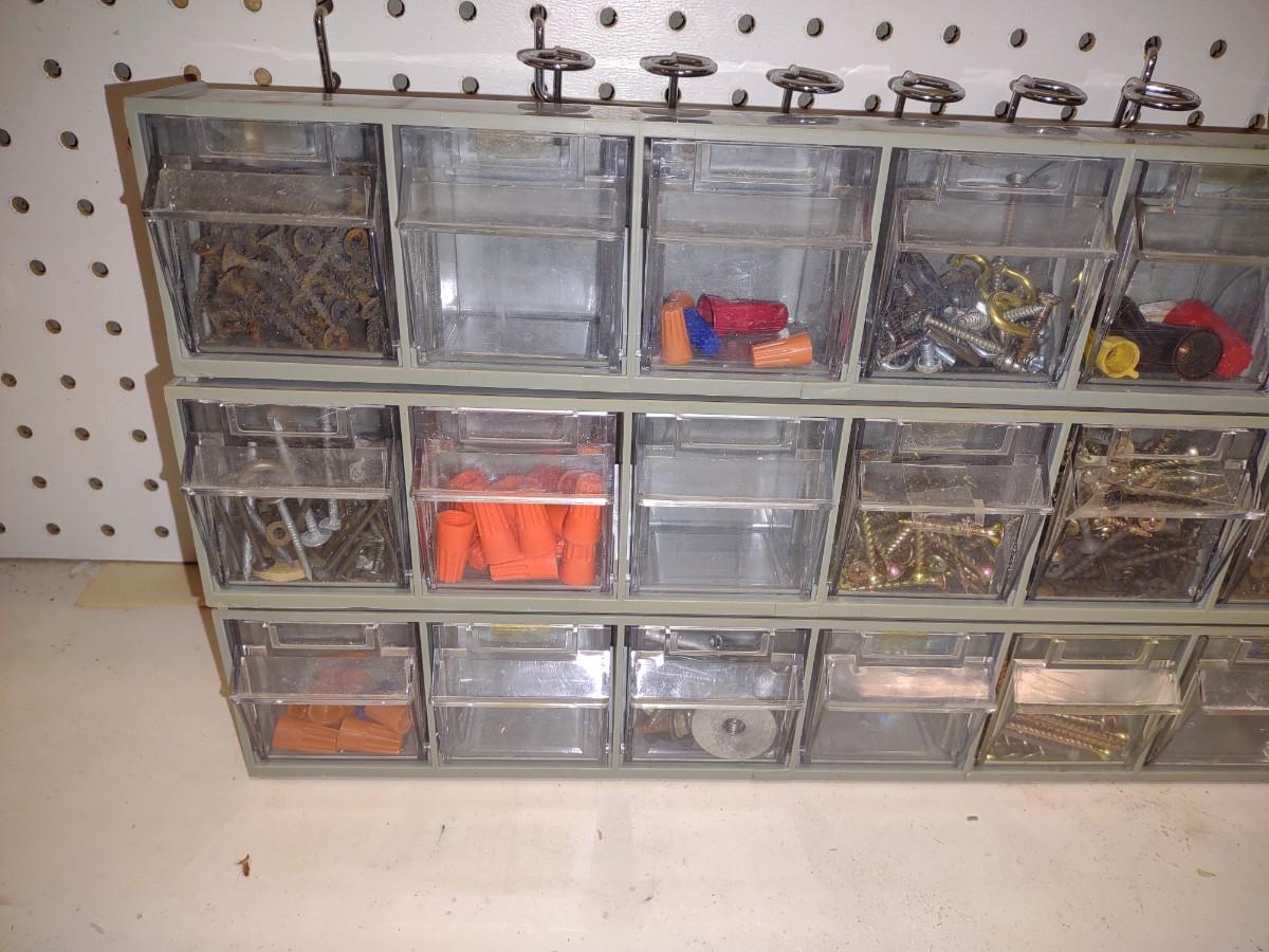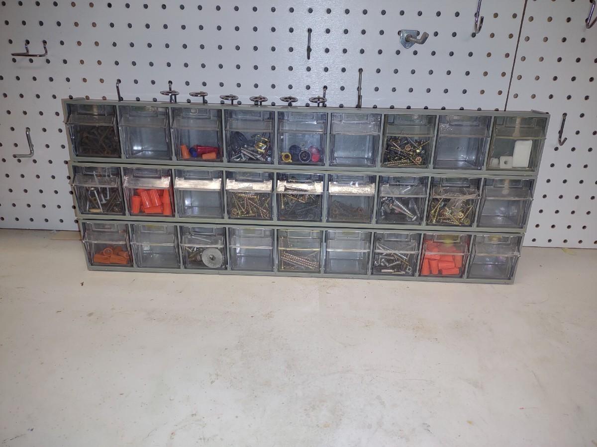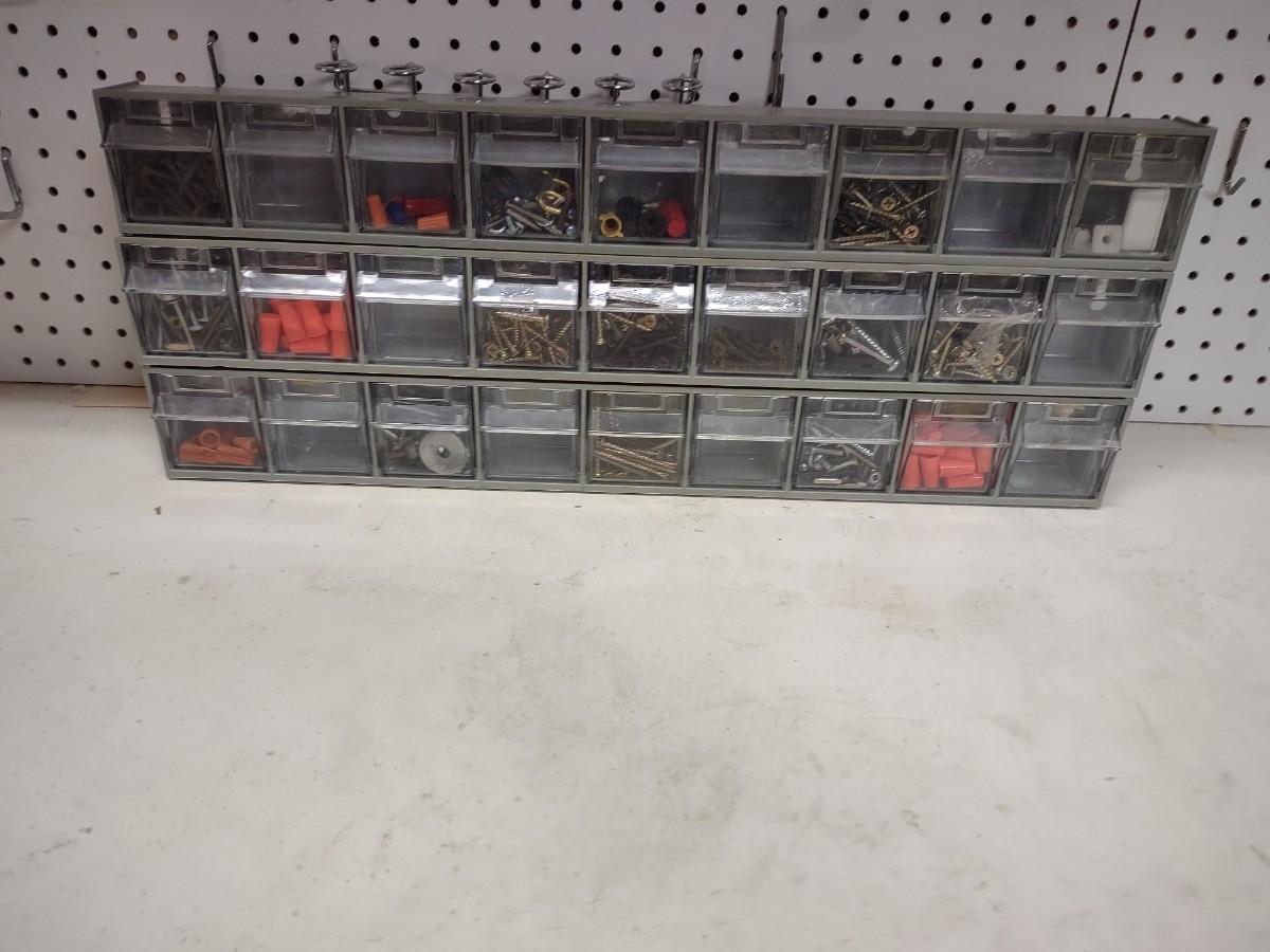 3 WALL HUNG OR STAND ALONE HARDWARE STORAGE ORGANIZERS WITH HARDWARE