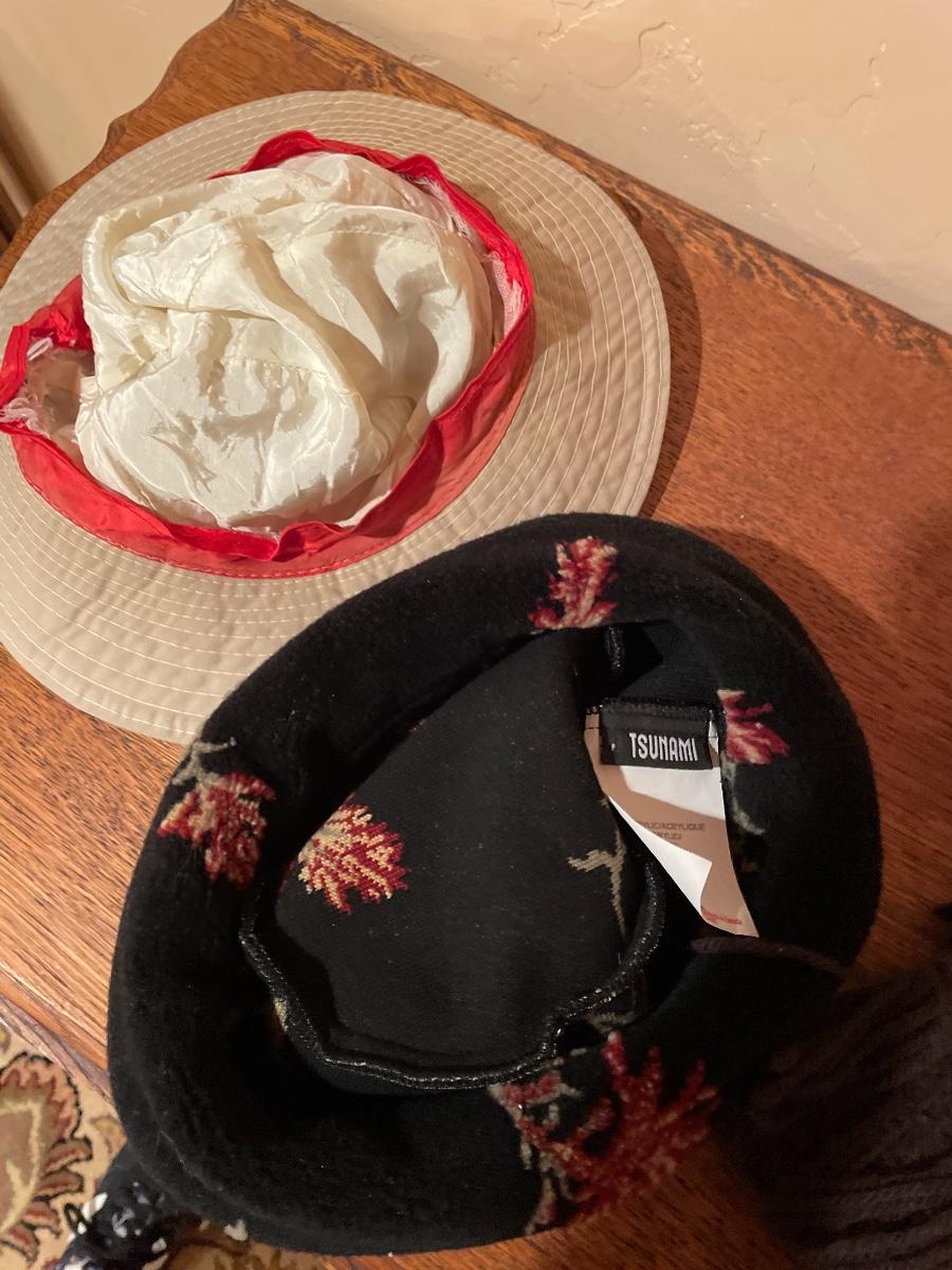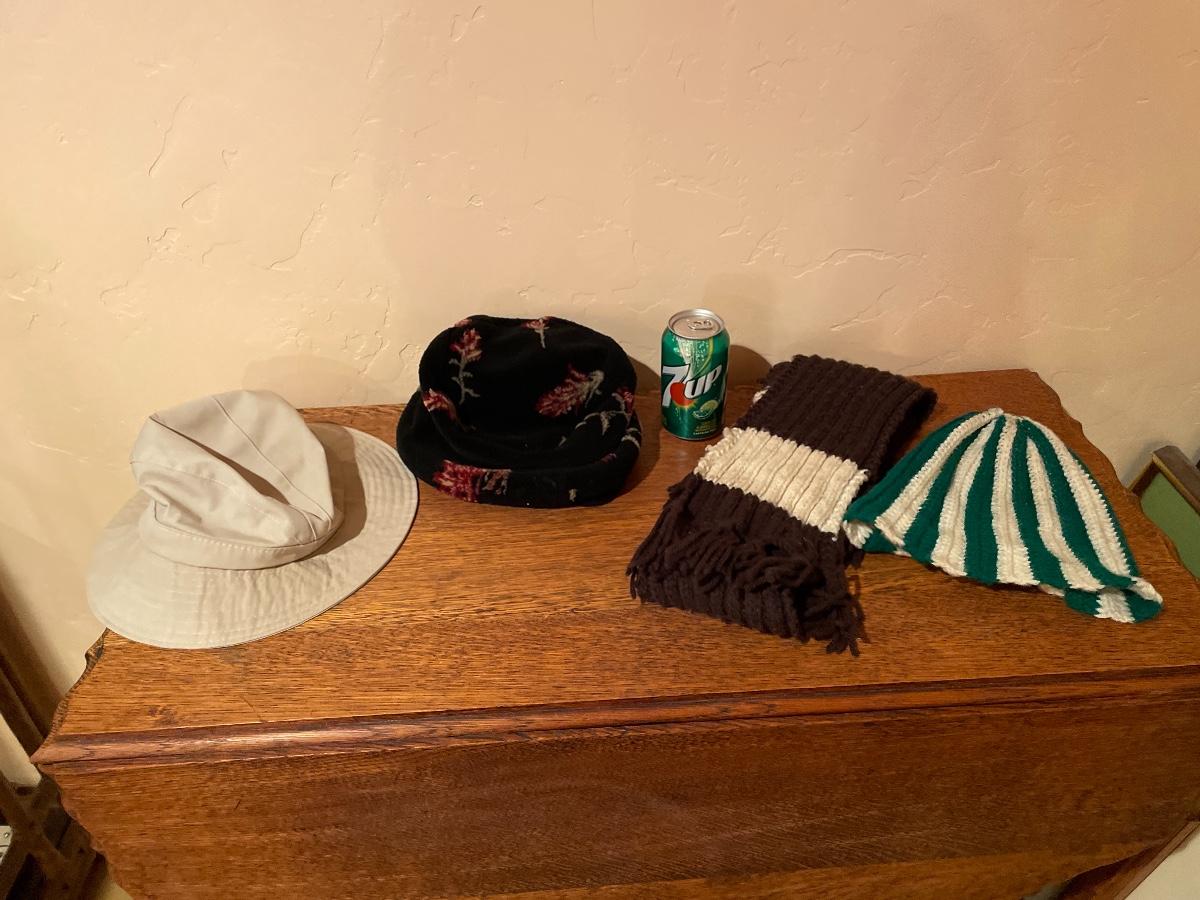 #348 Three Hats & A Scarf Hand Knit, Fleece, Bucket