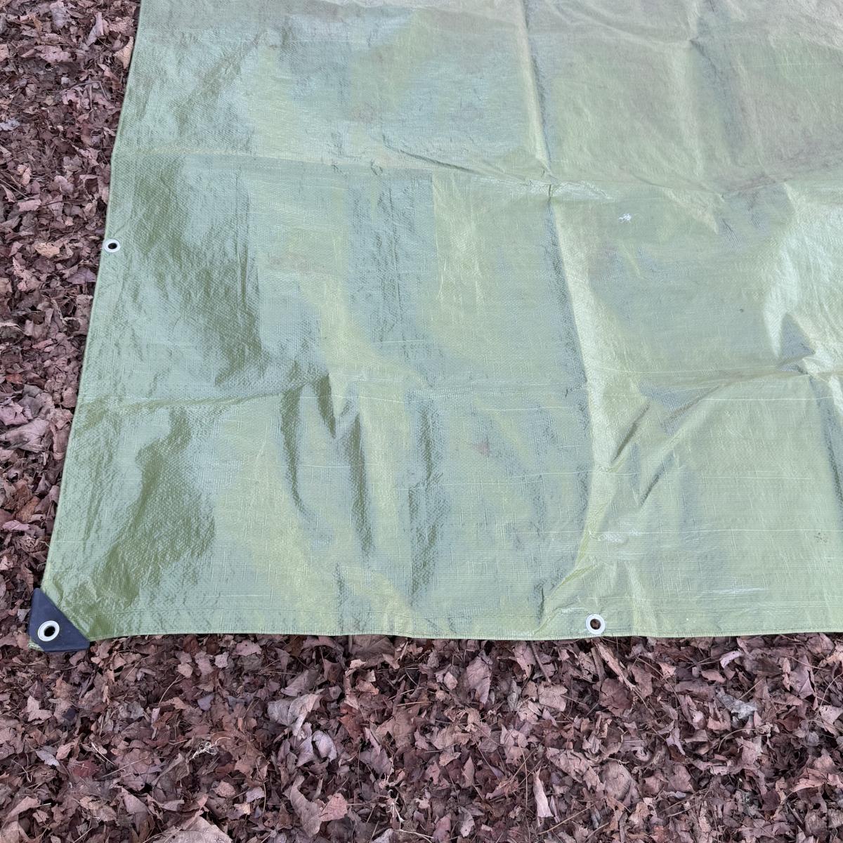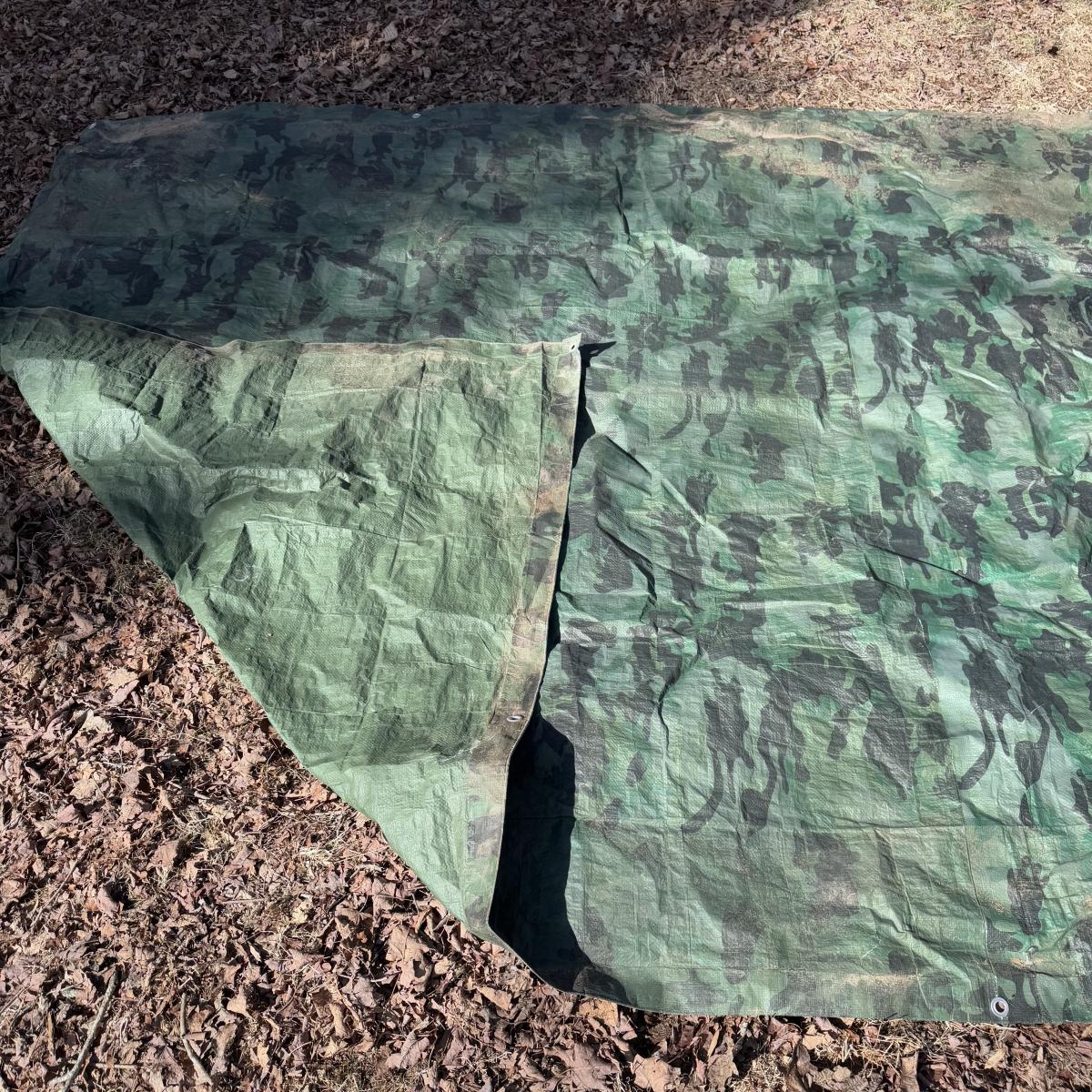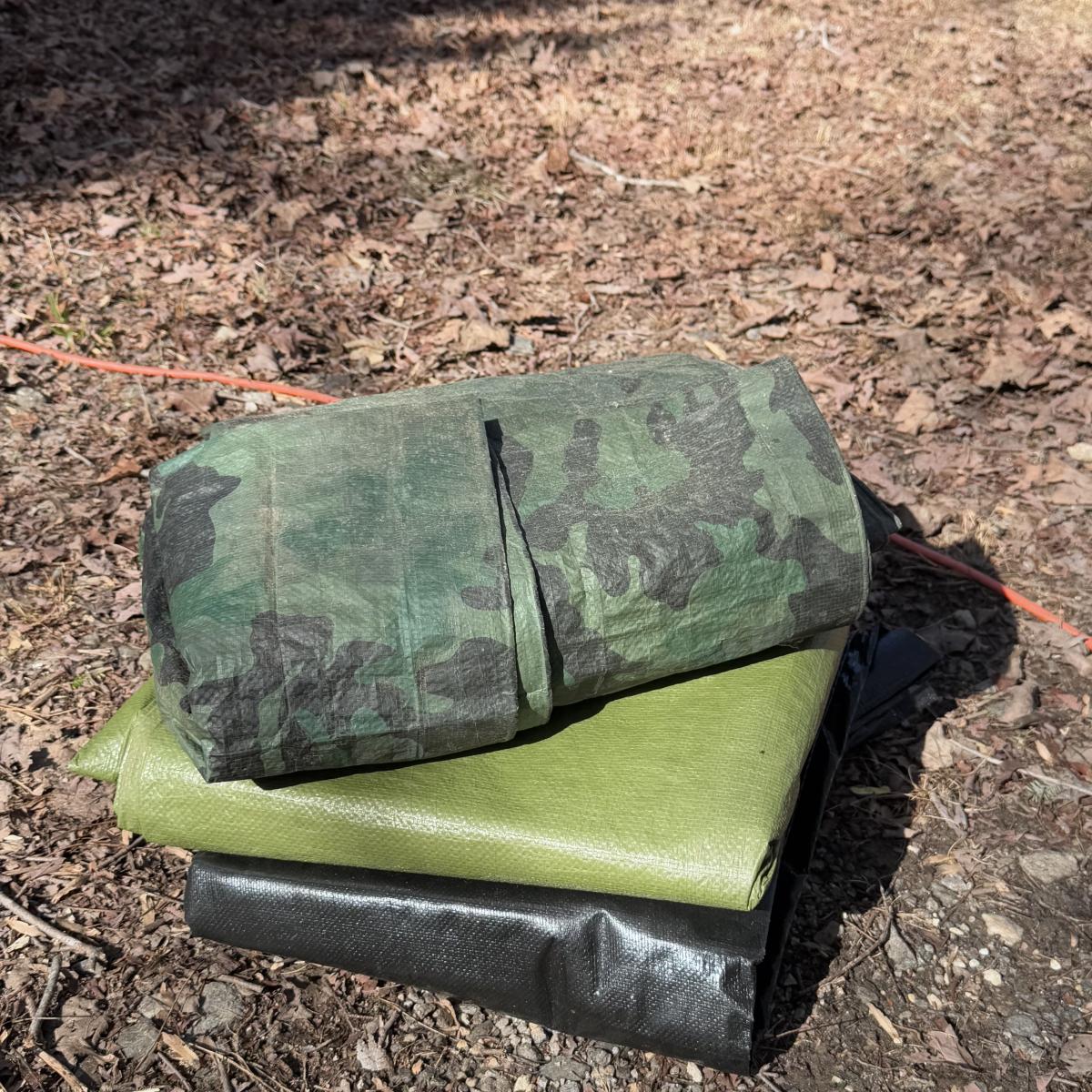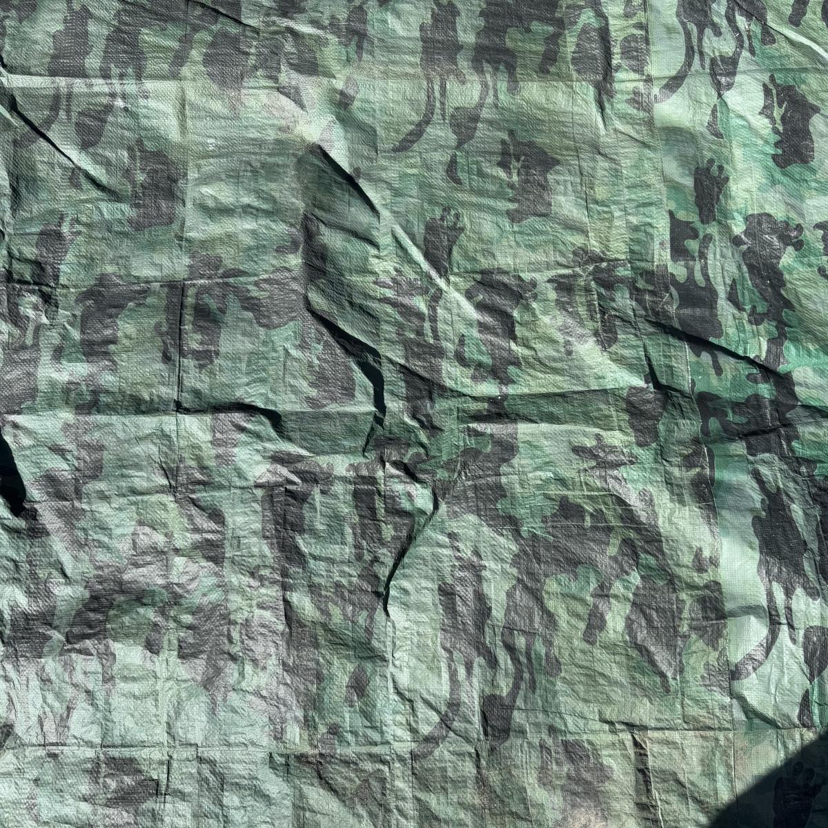 Lot includes three sturdy tarps in camo, green, and black. The camo tarp is a bit dirty, but can easily be cleaned. The camo tarp measures 109” x 87.5”H. Green one measures 160” x 115”H. Black one measures 189” x 144.5”H.