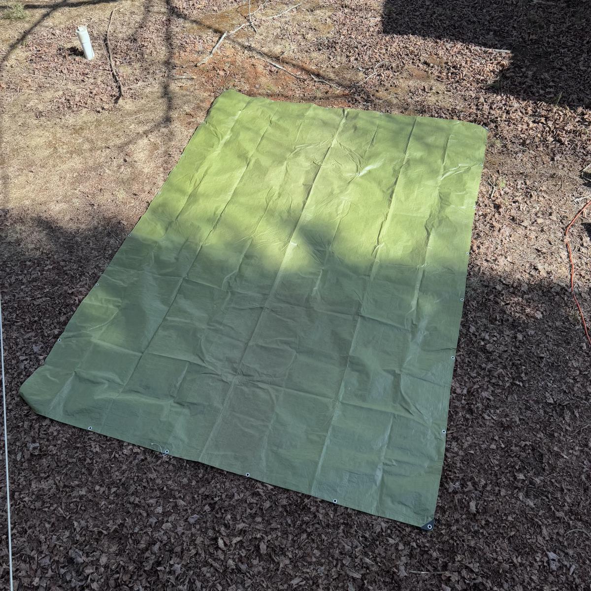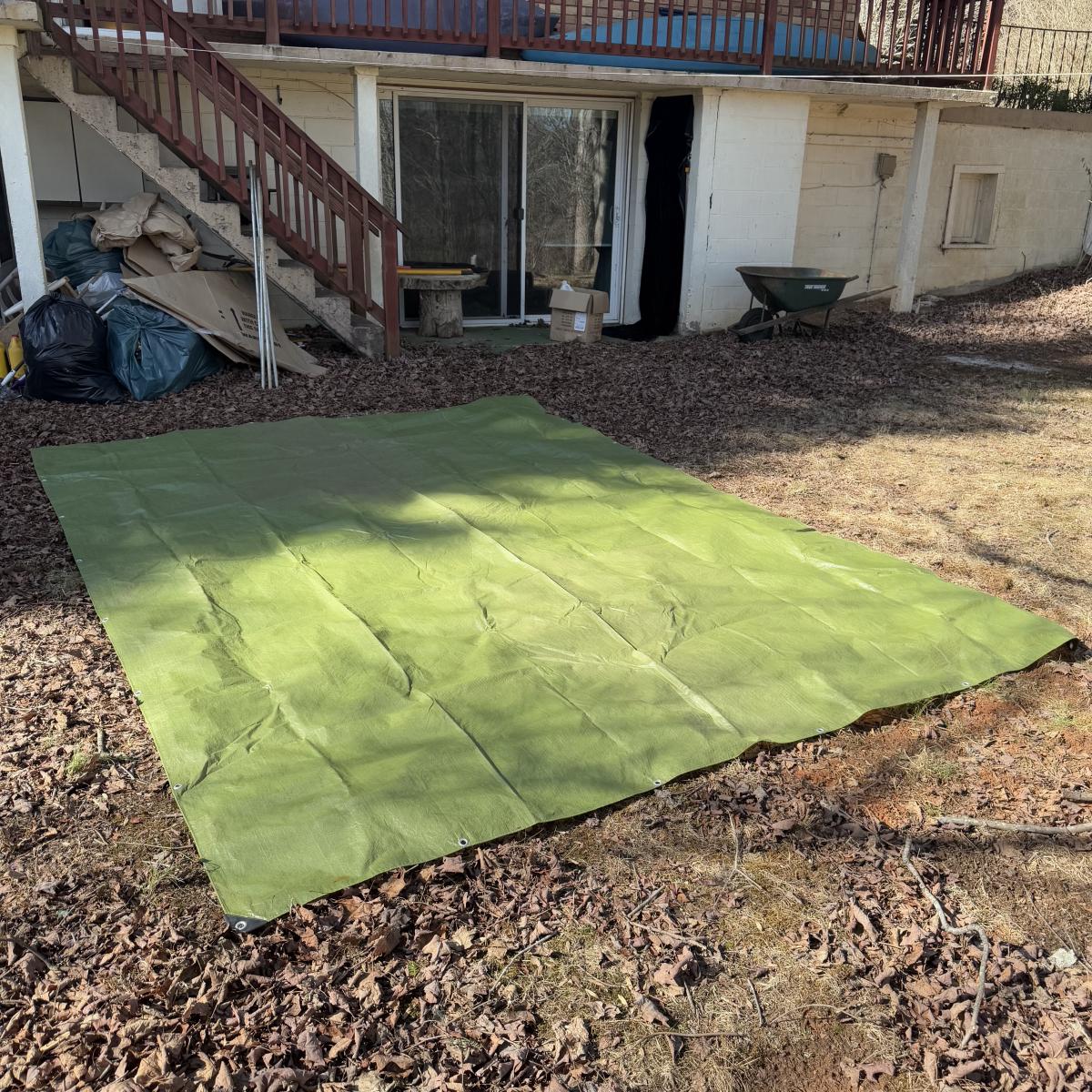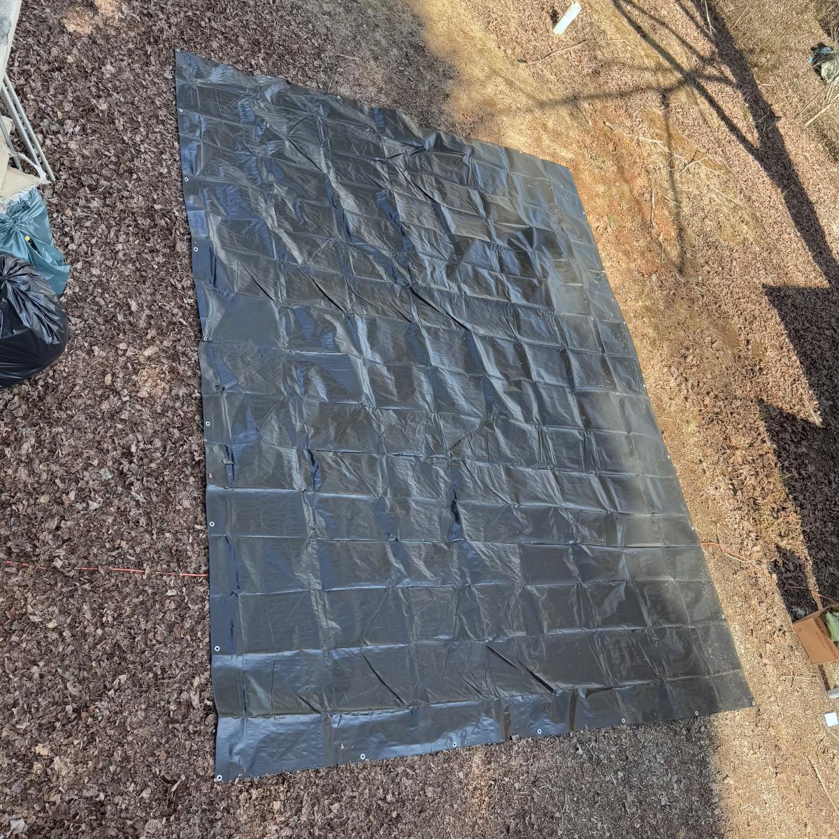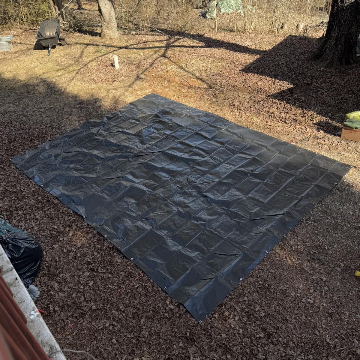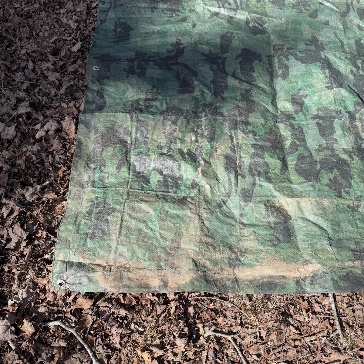 Lot includes three sturdy tarps in camo, green, and black. The camo tarp is a bit dirty, but can easily be cleaned. The camo tarp measures 109” x 87.5”H. Green one measures 160” x 115”H. Black one measures 189” x 144.5”H.