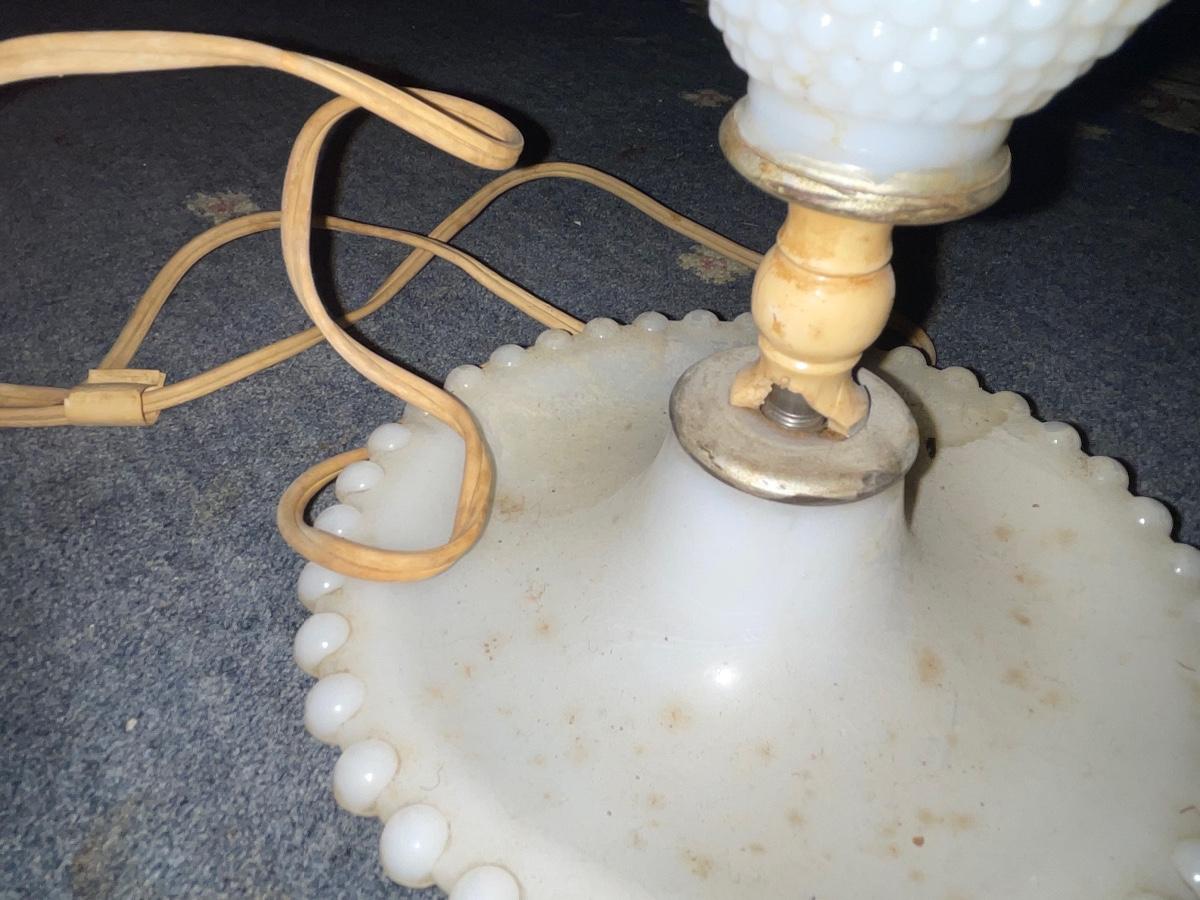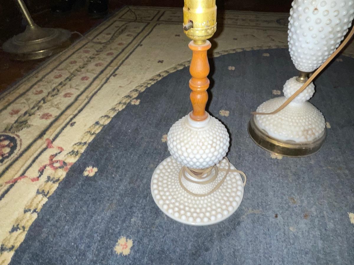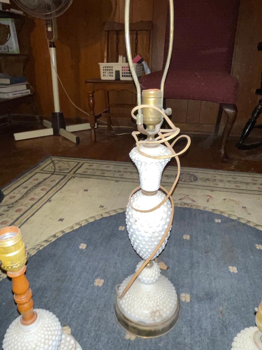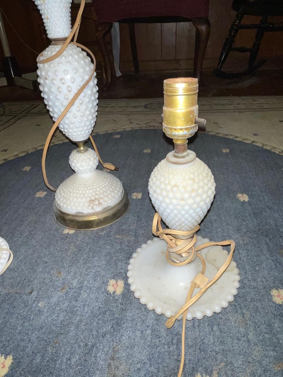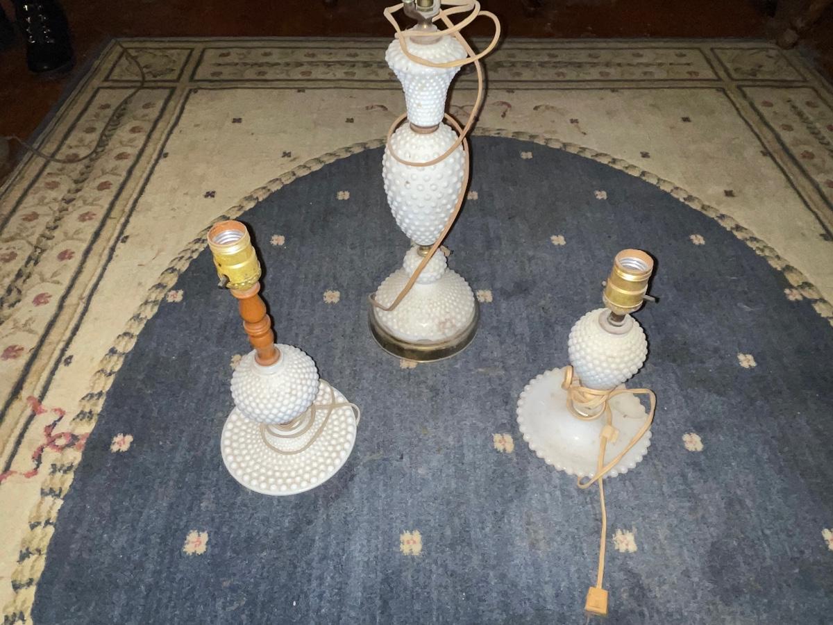 Three hobnail milk glass table lamps