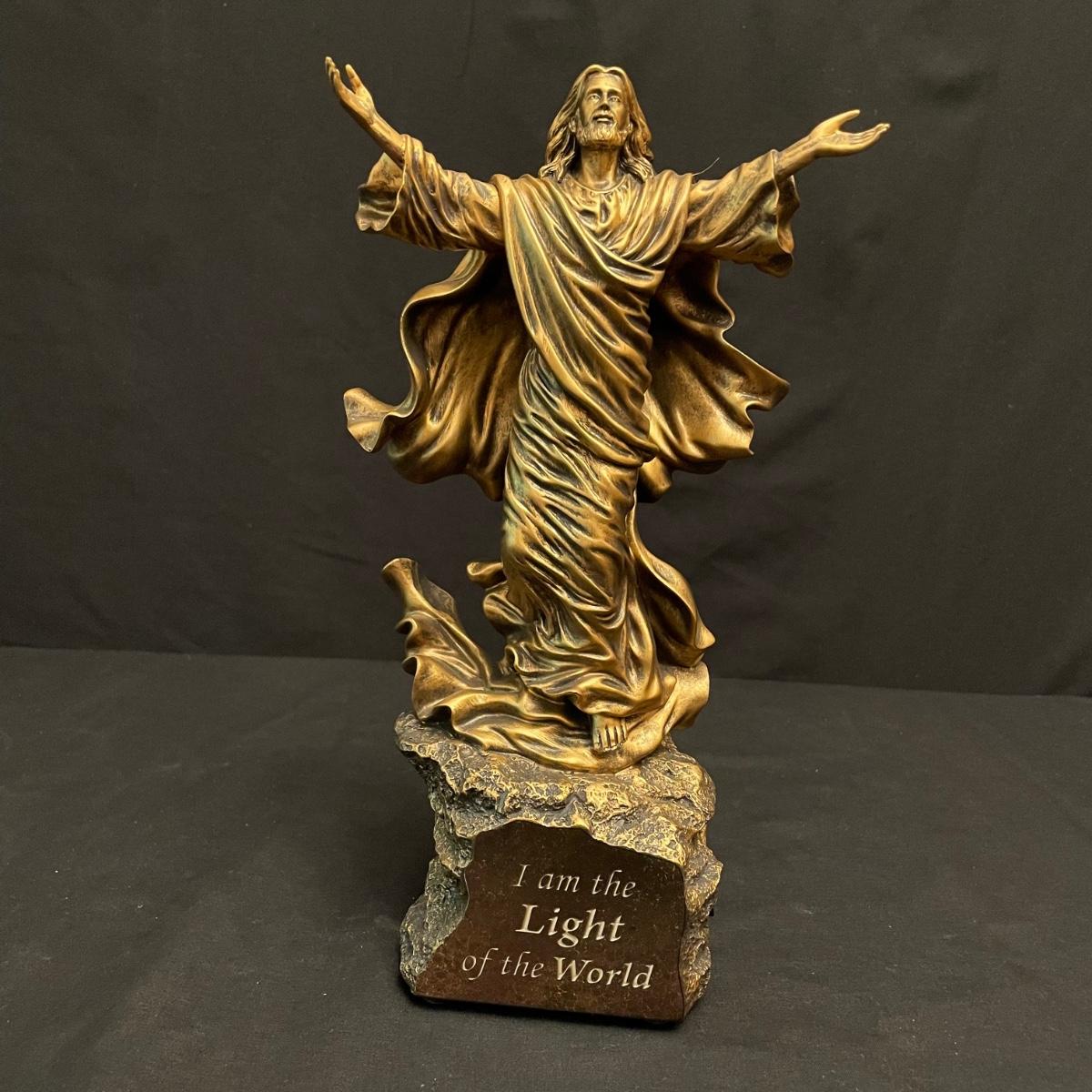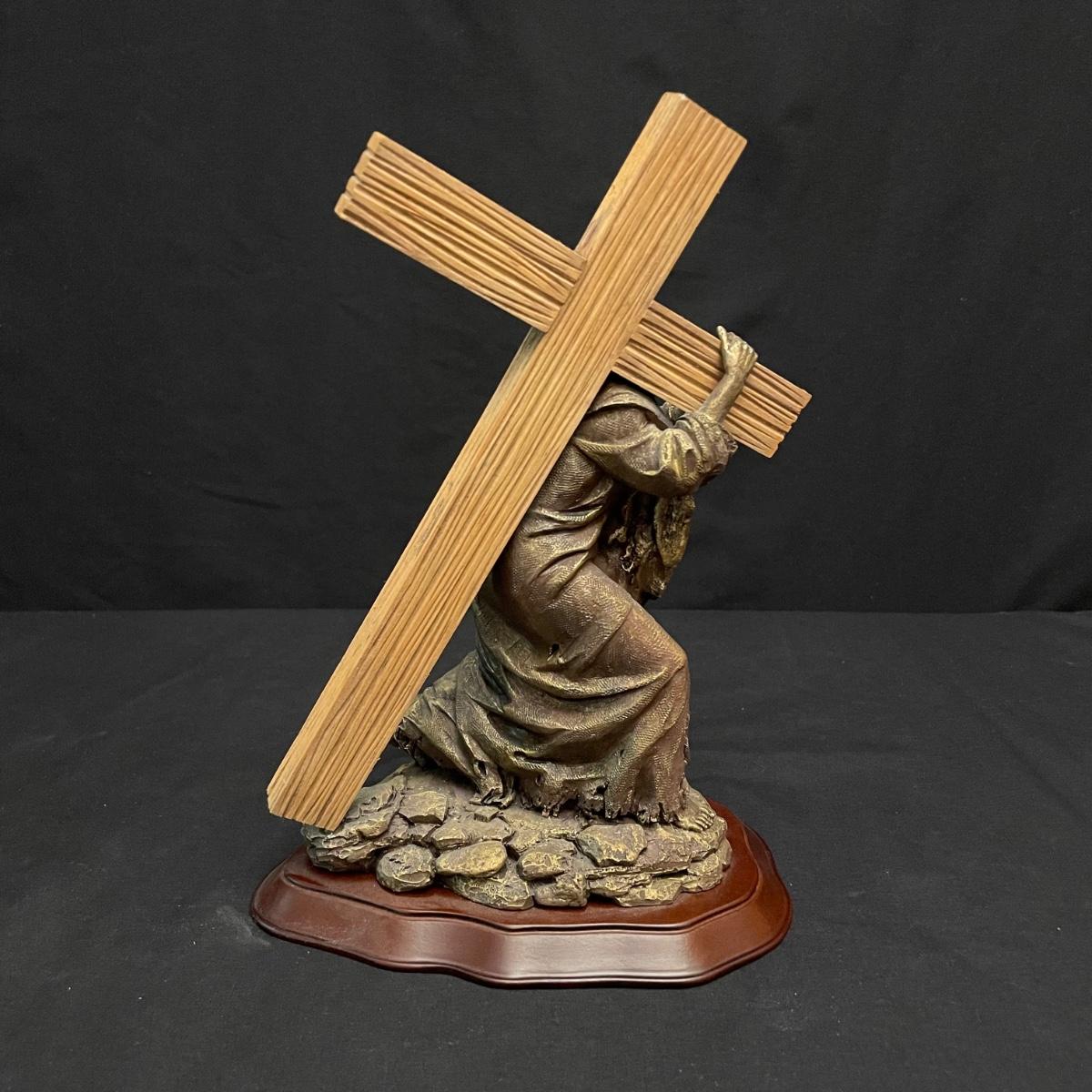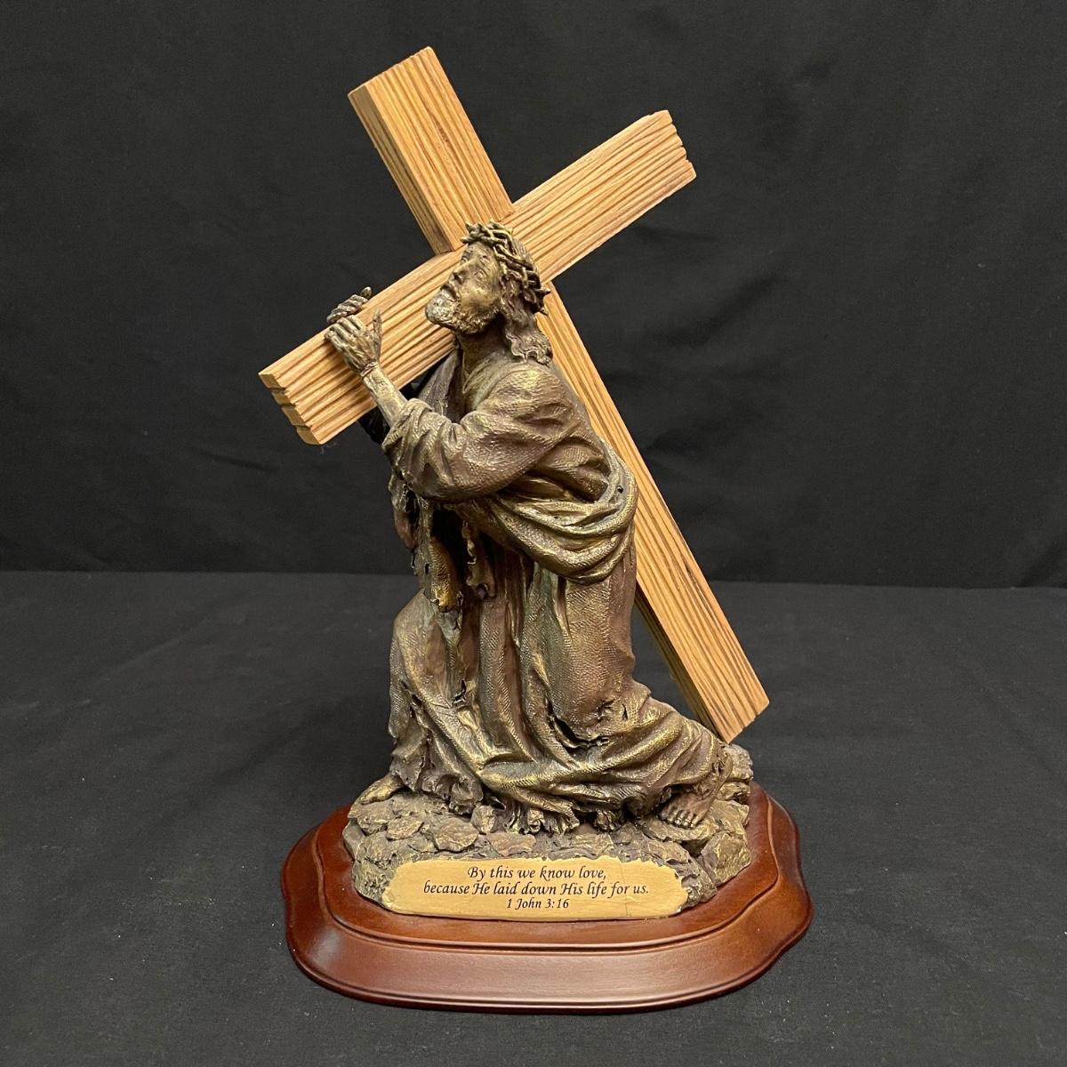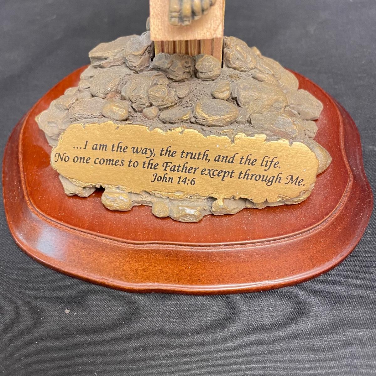 Two Danbury Mint Jesus with the cross statuettes. Both 'No Greater Love' and 'The Way, The Truth, and The Life' figures by Danbury Mint have Bible verses on a plaque. Their crosses and bases are wooden. Jesus on the cross ('The Way, The Truth, & The Life') appears to be metal. Jesus carrying the cross ('No Greater Love') seems to be a heavy and sturdy resin. Lastly, the light-up 'The Light of the World' is a cold-cast bronze figure, it is lightweight. This statuette turned on with two AAA batteries when tested. 'The Way, The Truth, & The Life' is the tallest at 7” x 5” x 12.5”H. See images. Shipping available.