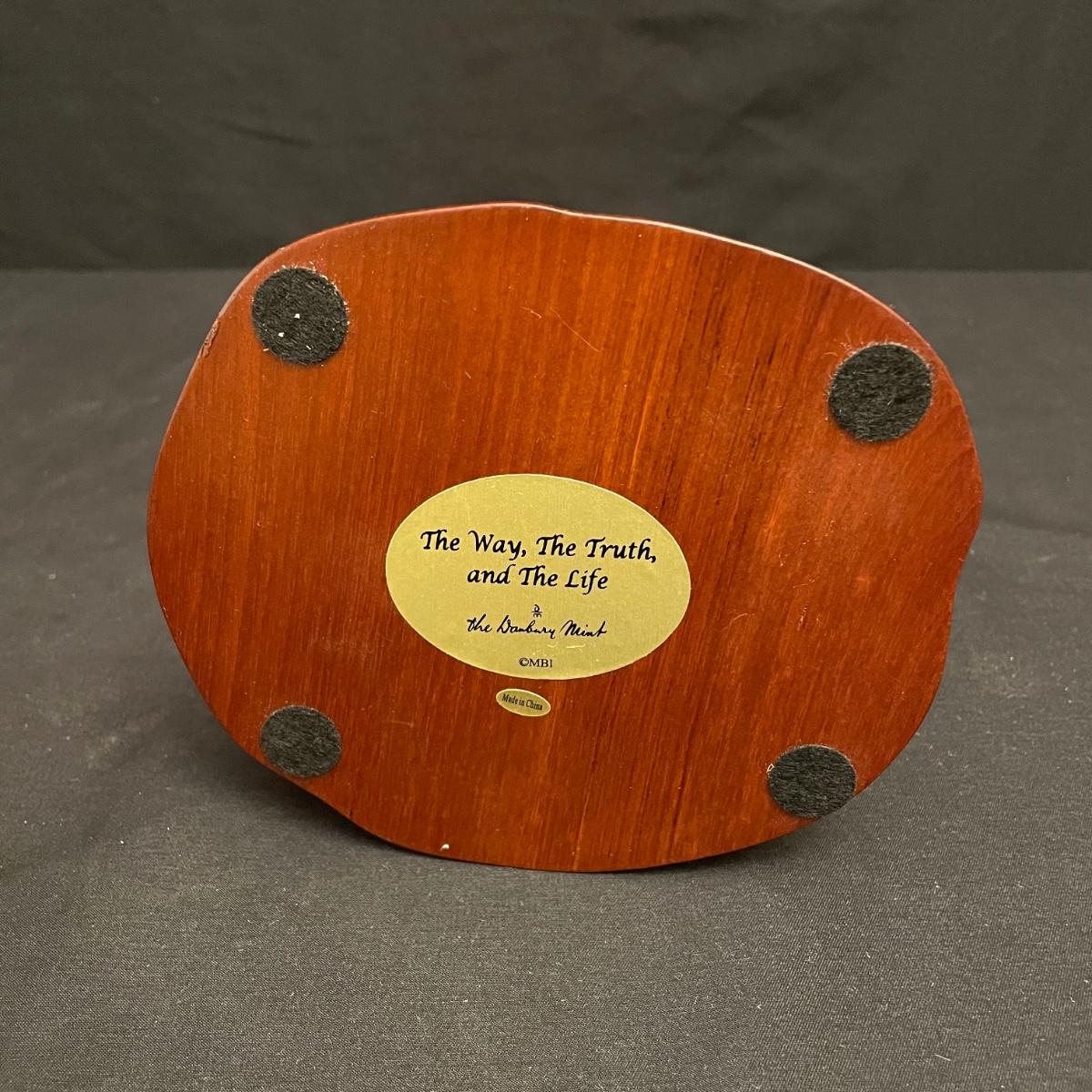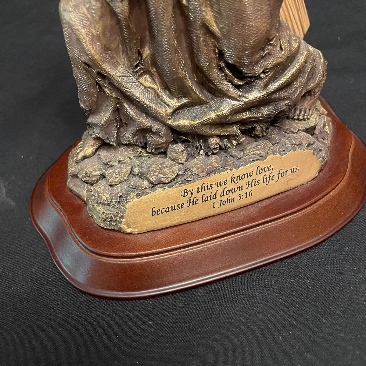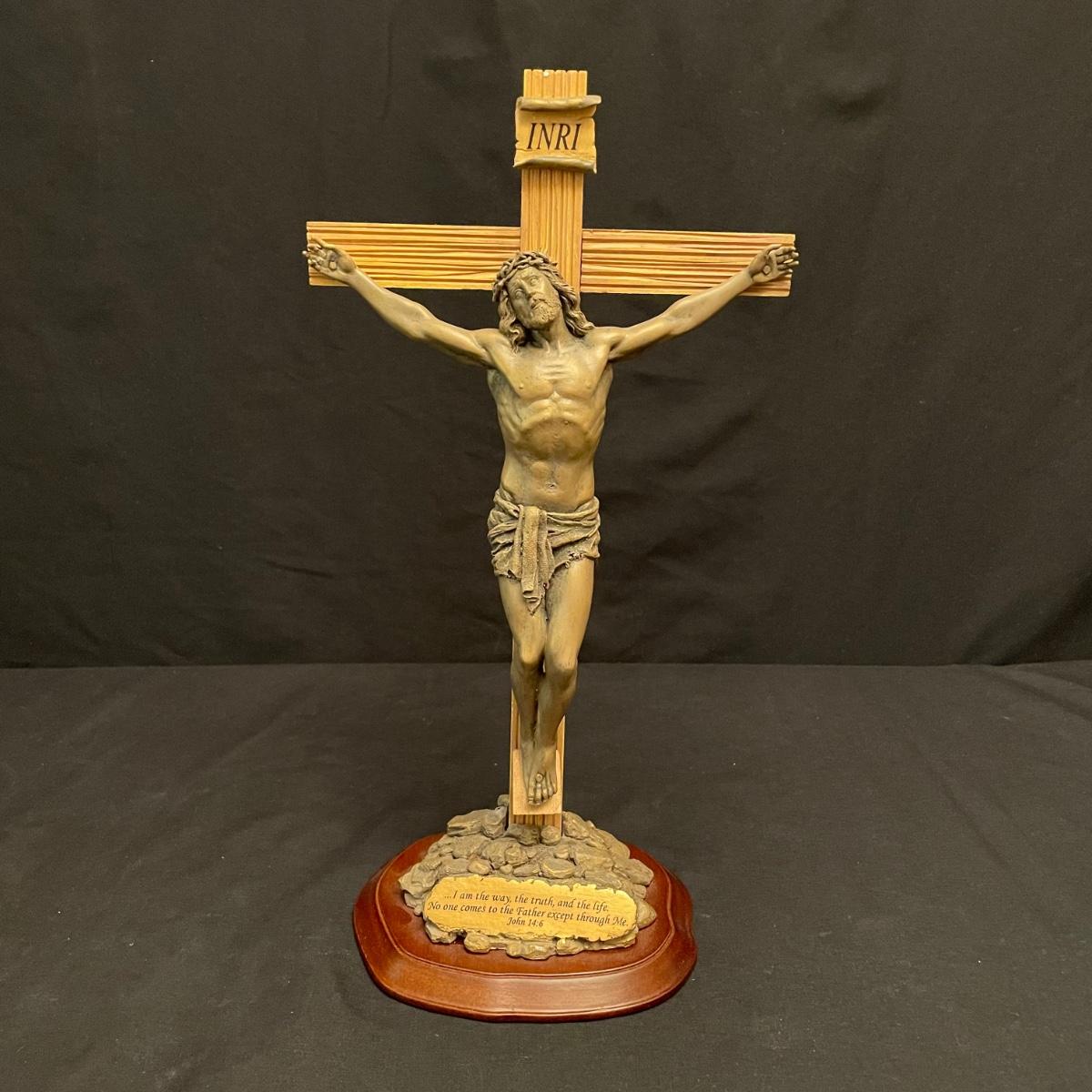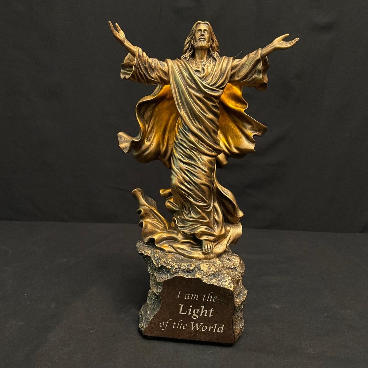 Two Danbury Mint Jesus with the cross statuettes. Both 'No Greater Love' and 'The Way, The Truth, and The Life' figures by Danbury Mint have Bible verses on a plaque. Their crosses and bases are wooden. Jesus on the cross ('The Way, The Truth, & The Life') appears to be metal. Jesus carrying the cross ('No Greater Love') seems to be a heavy and sturdy resin. Lastly, the light-up 'The Light of the World' is a cold-cast bronze figure, it is lightweight. This statuette turned on with two AAA batteries when tested. 'The Way, The Truth, & The Life' is the tallest at 7” x 5” x 12.5”H. See images. Shipping available.