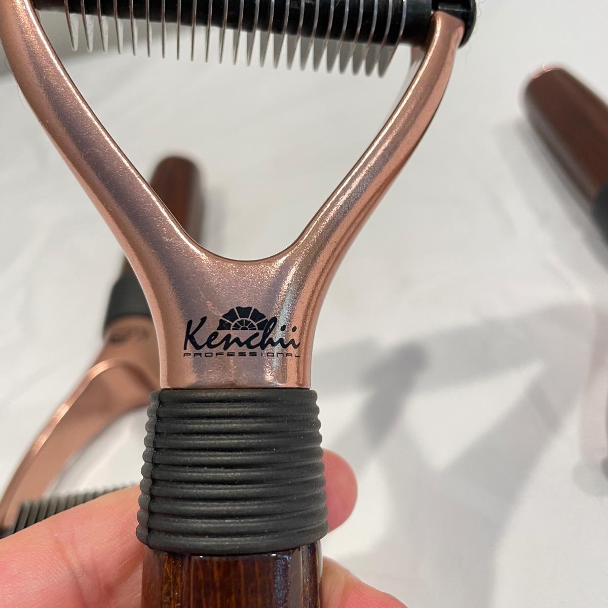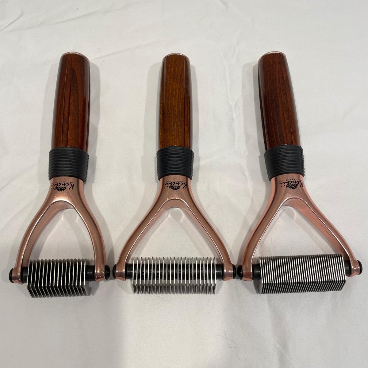 Three Kenchii Professional luxury dog and cat rakes. Lot includes one each: 16, 23, 40 tooth rakes. Some hair is still present in the combs. See images. Shipping available.