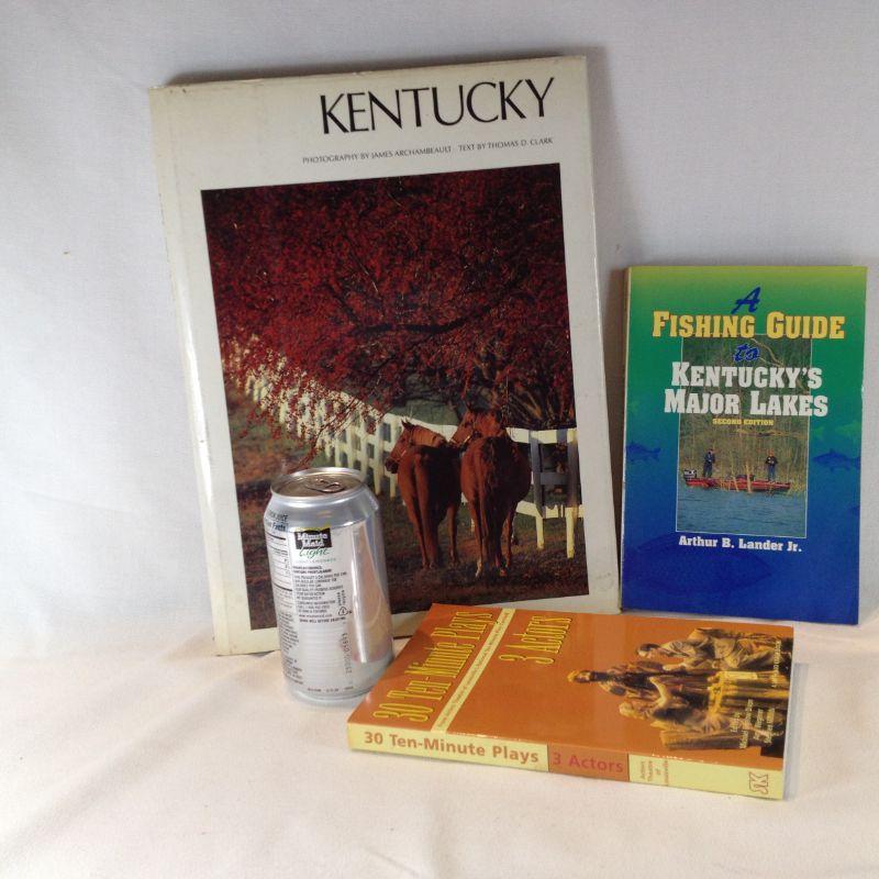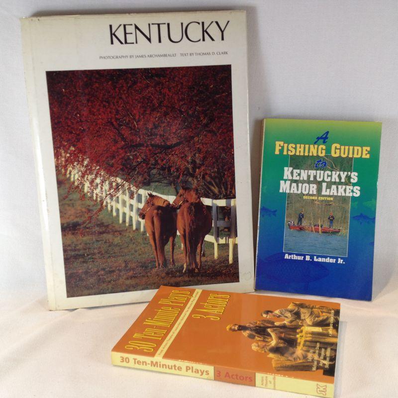 This lot is for three Kentucky interest books. The first is a large coffee table book that is autographed by the Photographer - James Archambeault. It has 160 pages with wonderful colored photos. The second book is "Fishing Guide - Kentucky's Major Lakes" by Arthur B Larider, JR. Soft cover, 280 pages. The third book is a very unusual book "30 Ten-Minute Plays - from Actors Theatre of Louisville's National Ten-Minute Play Contest" Softcover, 271 pages. All are in very good condition.