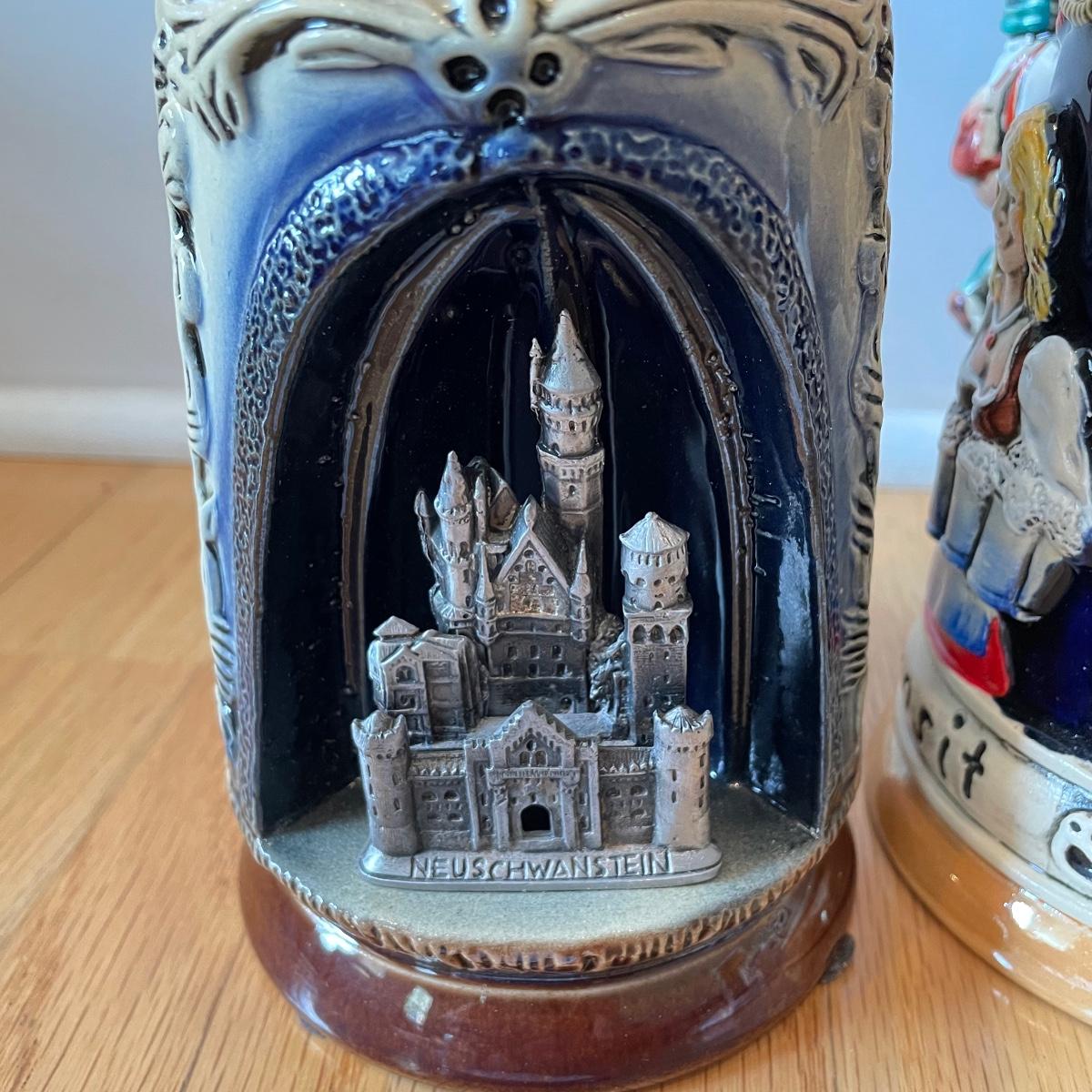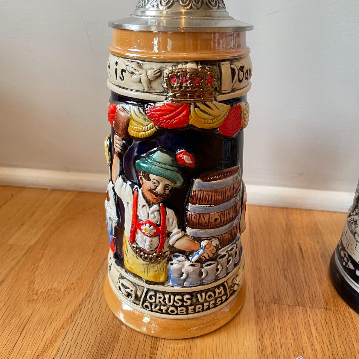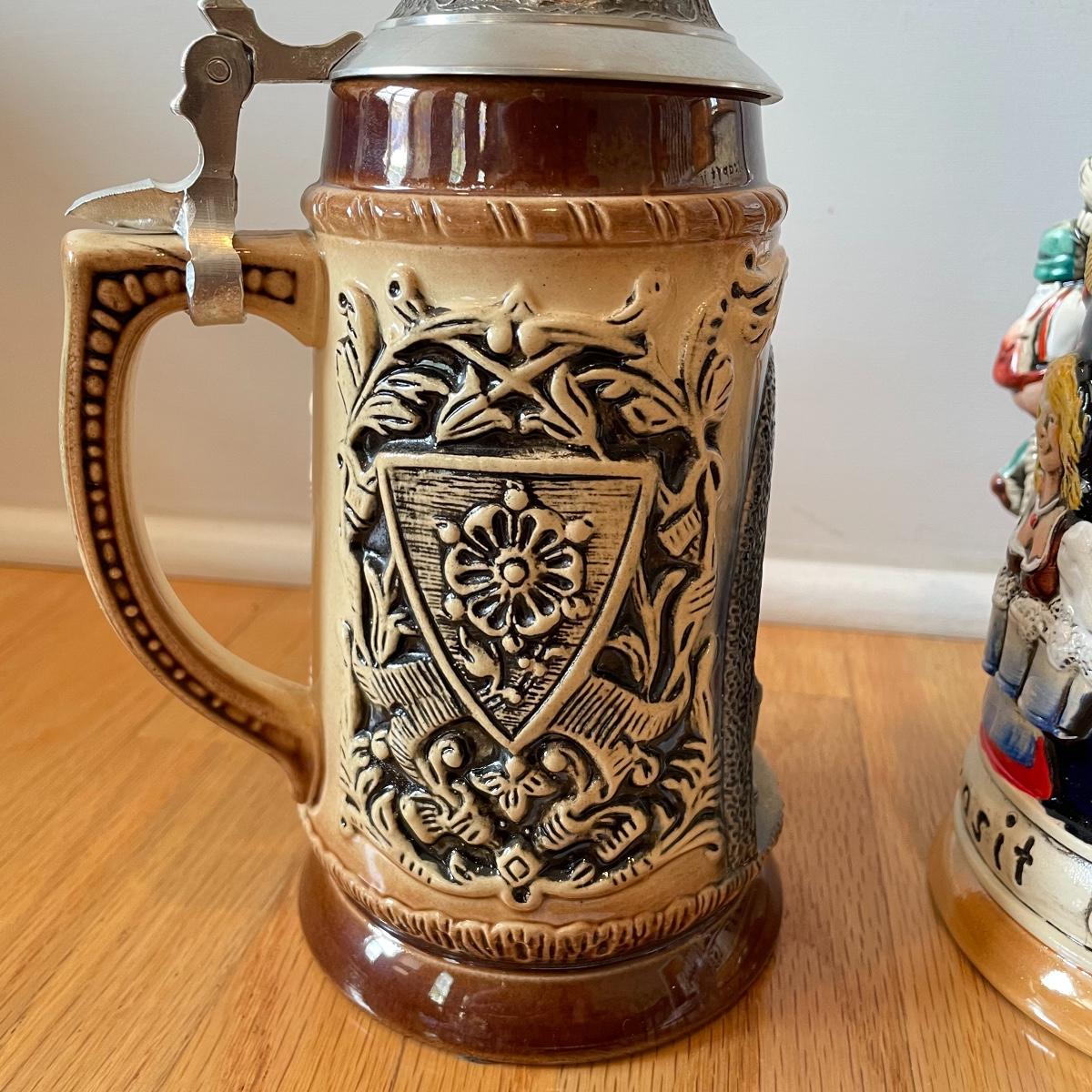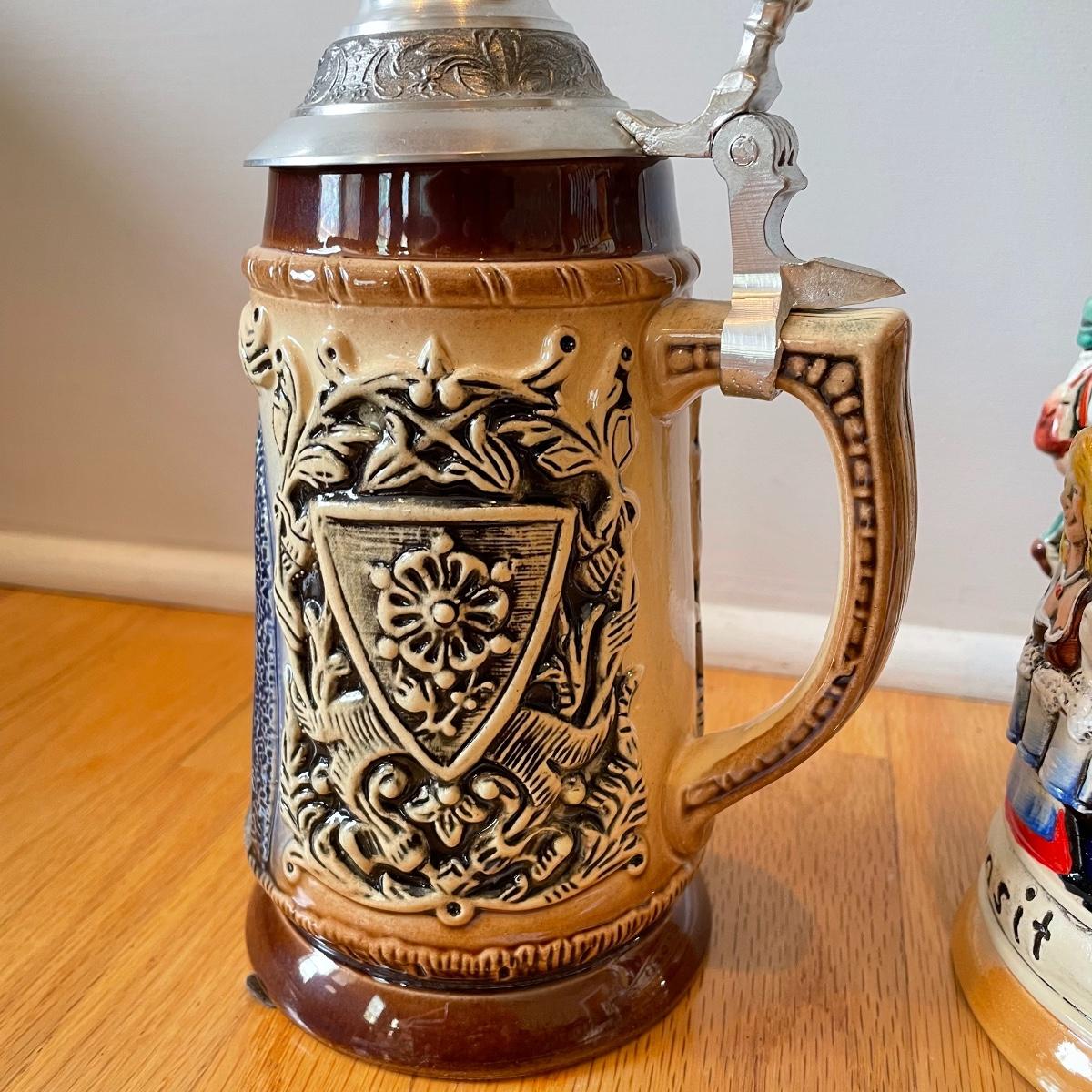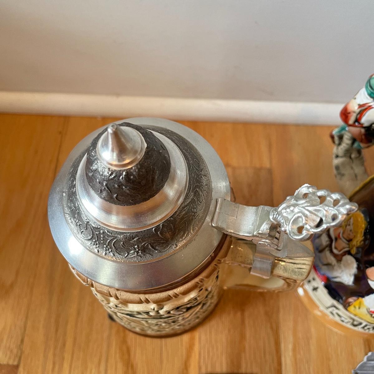 Three detailed and numbered steins by King. The Turmeinblick Tower Look Into is 13” tall. The other two Steins and mug are around 9” tall. Shipping available.