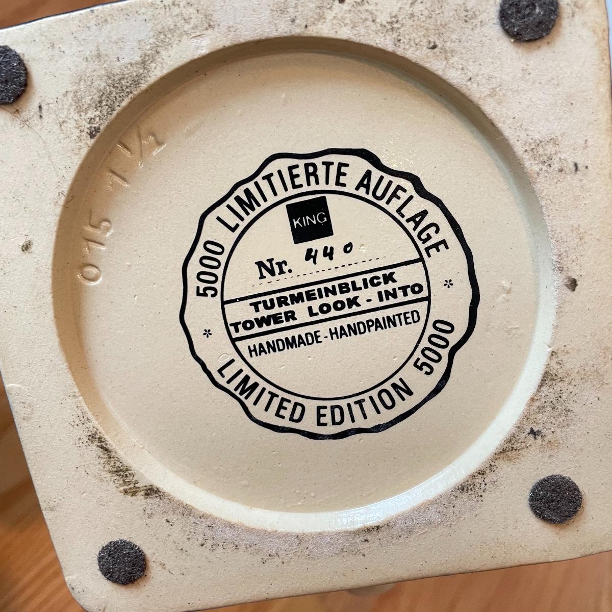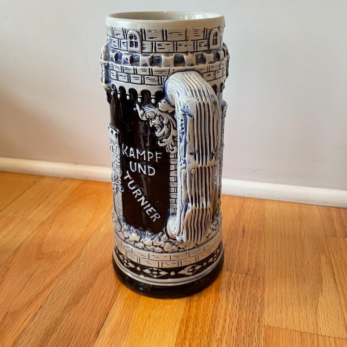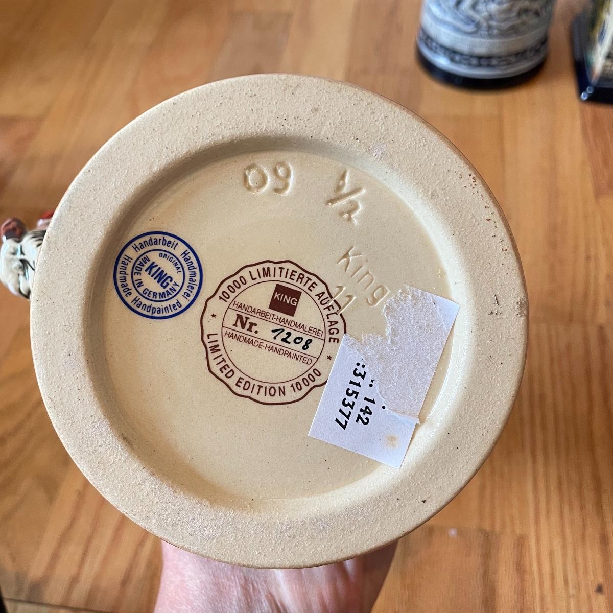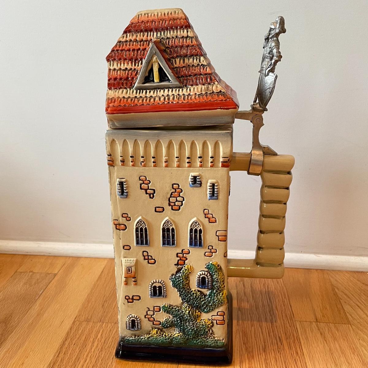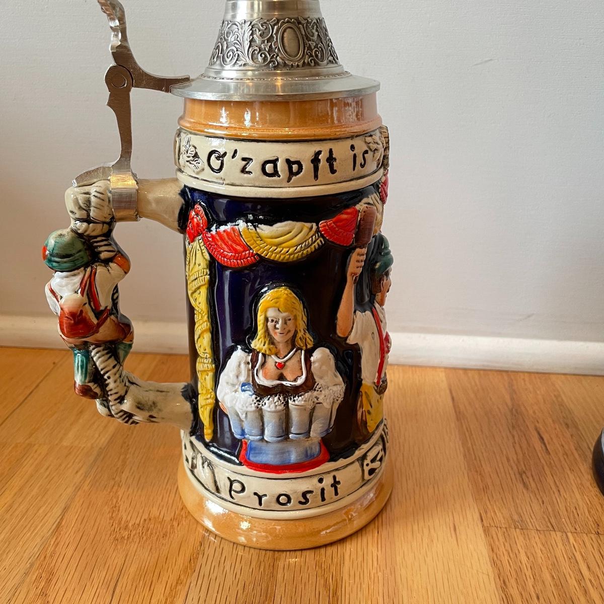 Three detailed and numbered steins by King. The Turmeinblick Tower Look Into is 13” tall. The other two Steins and mug are around 9” tall. Shipping available.