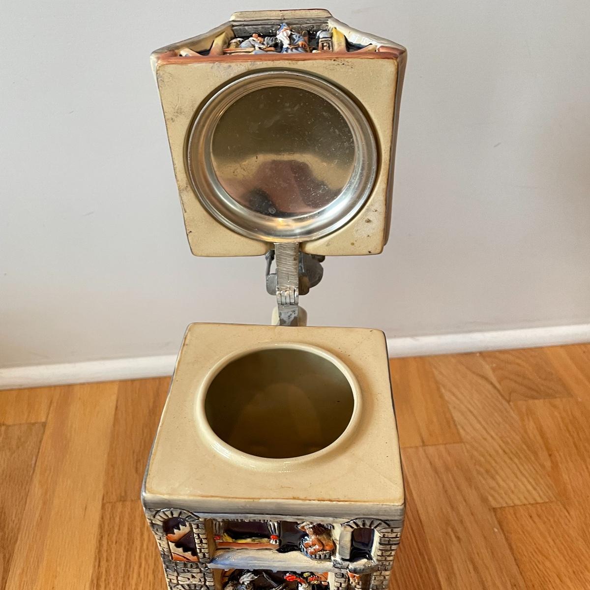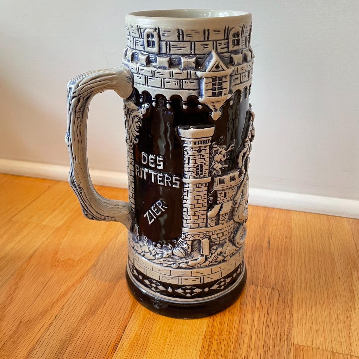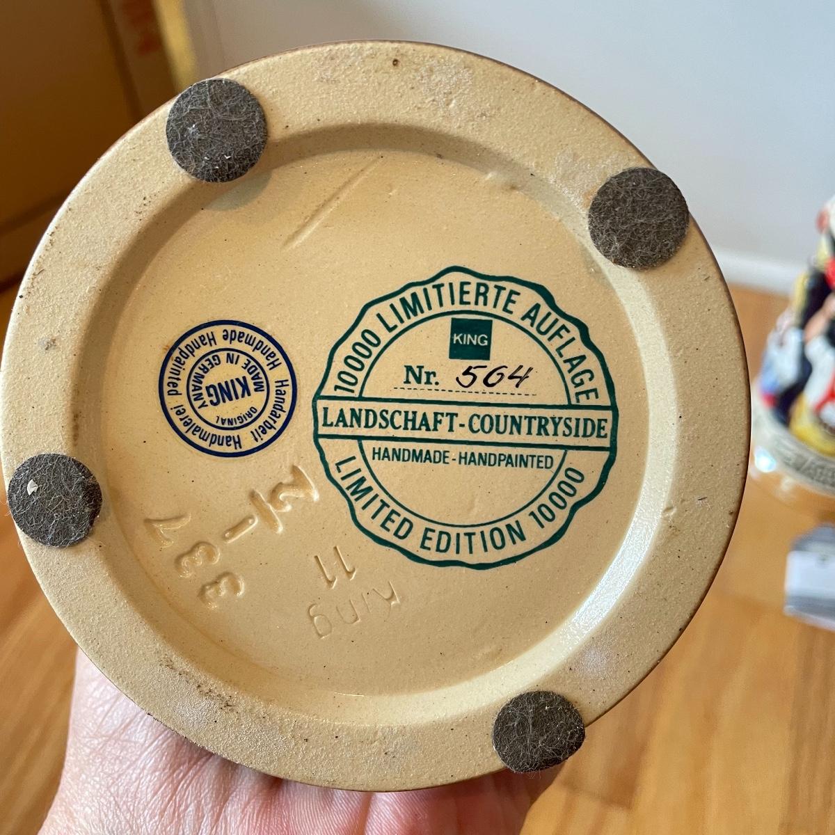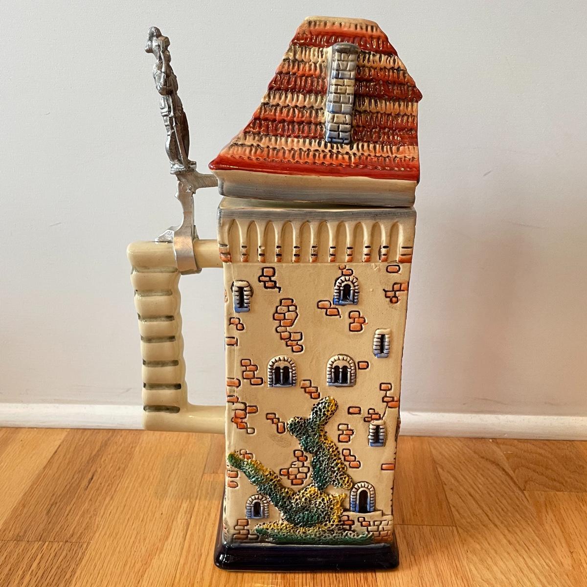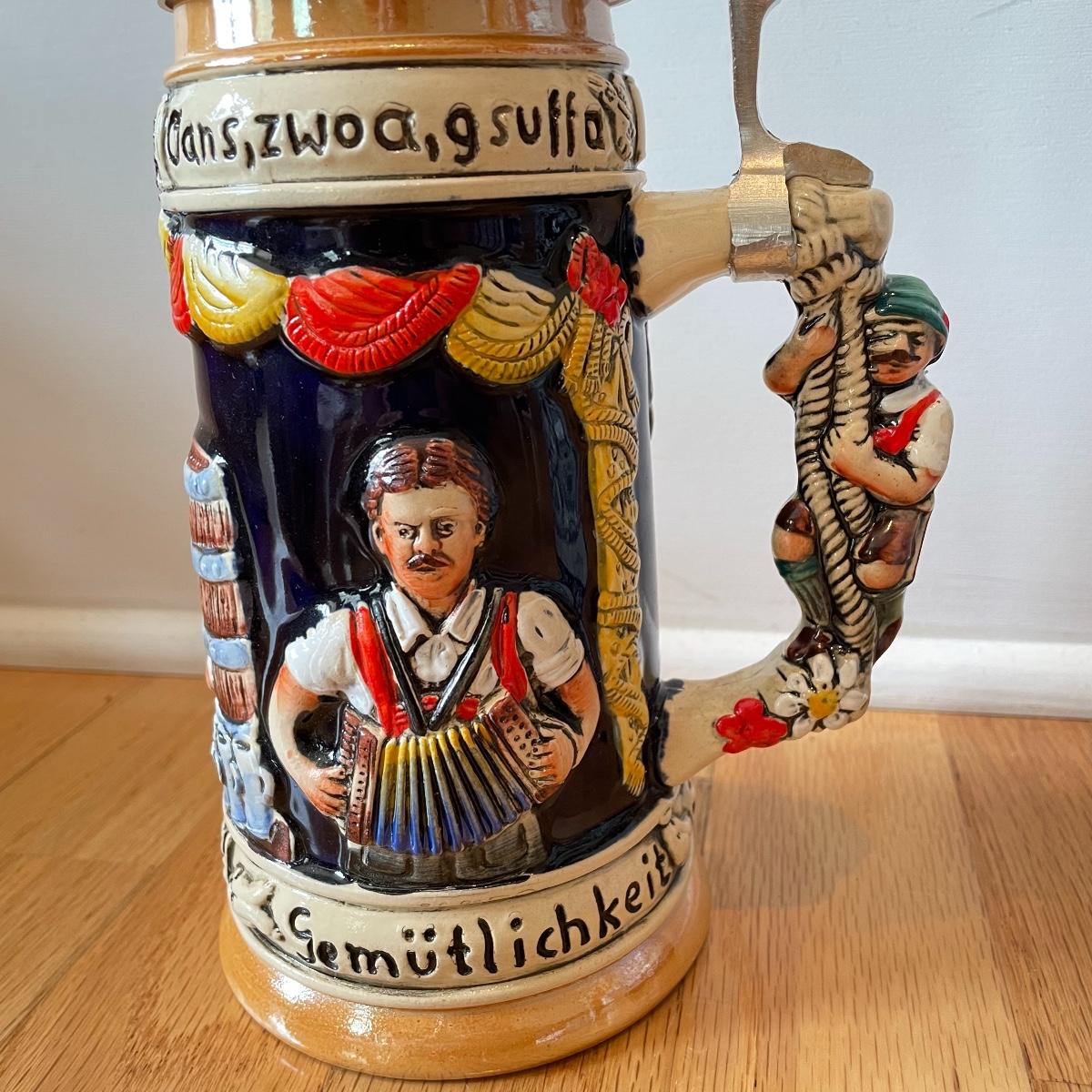 Three detailed and numbered steins by King. The Turmeinblick Tower Look Into is 13” tall. The other two Steins and mug are around 9” tall. Shipping available.