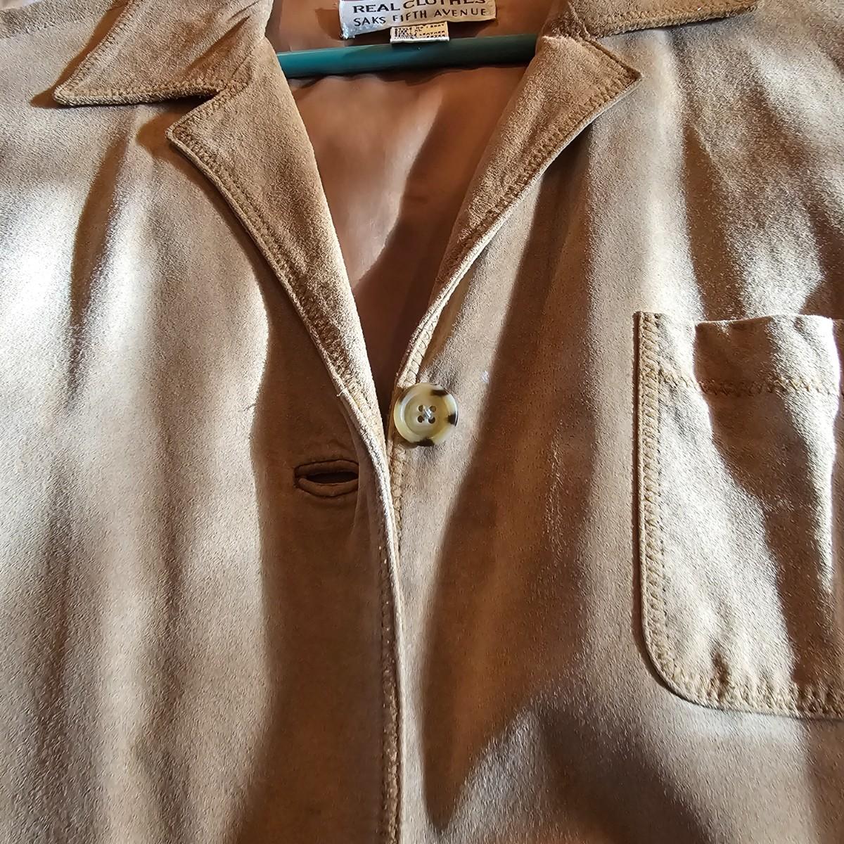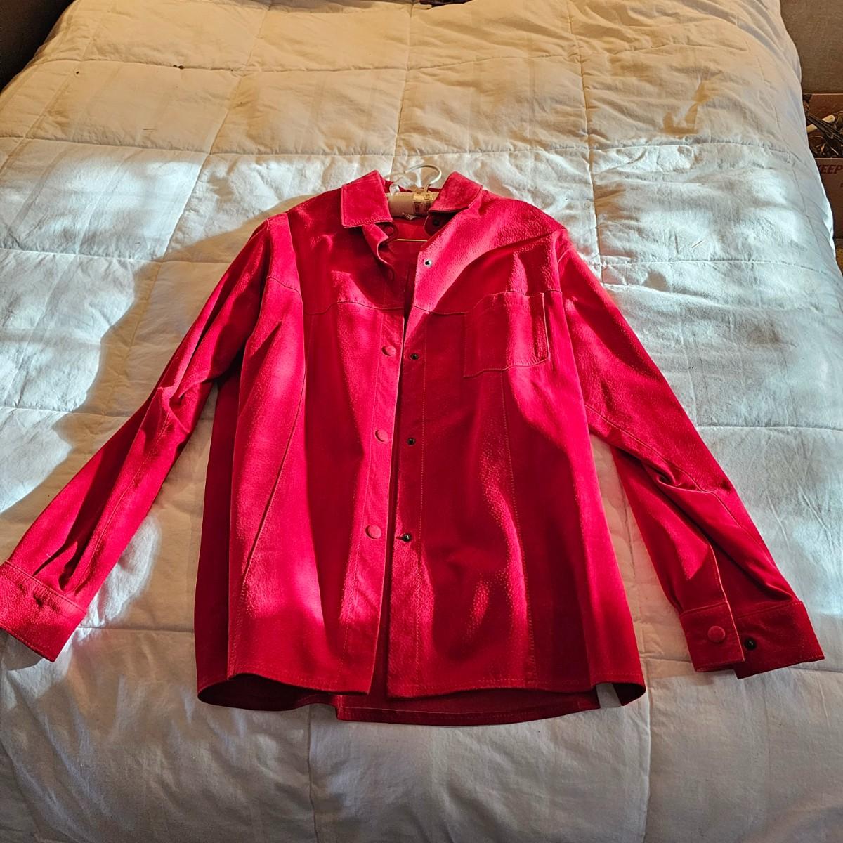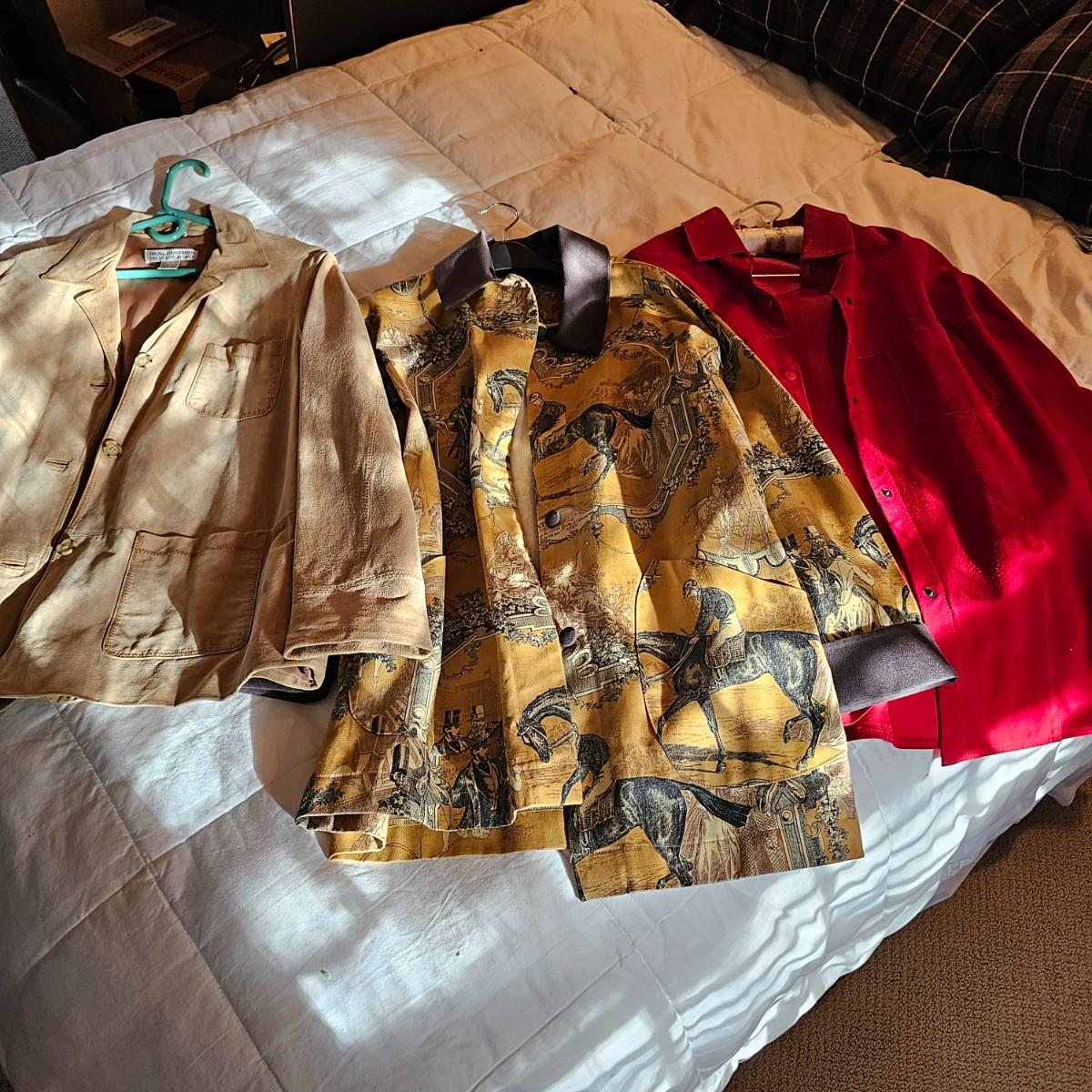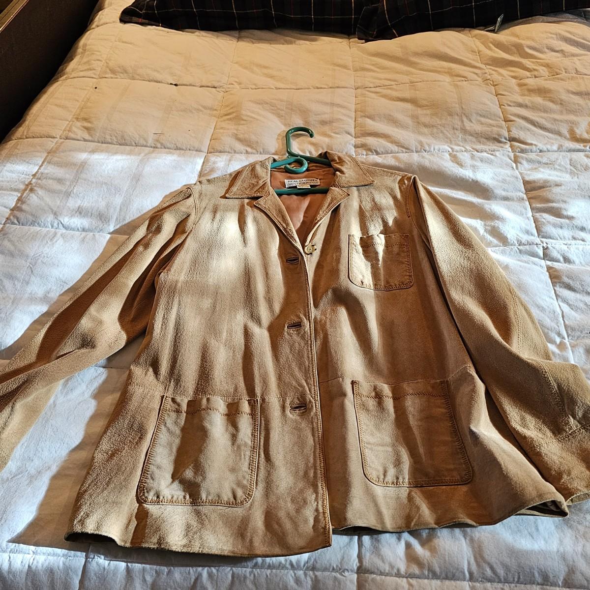 A trio of ladies fine fashion jackets in leather, suede and broadcloth. Camel color item is all leather with polyester lining, size L, by Saks Fifth Ave. Deep red item is by Rossi & Caruso, size L, is suede. Patterned jacket is by Susan McDuffie, is cloth with suede collar and cuffs. See photos for details. Shipping available.