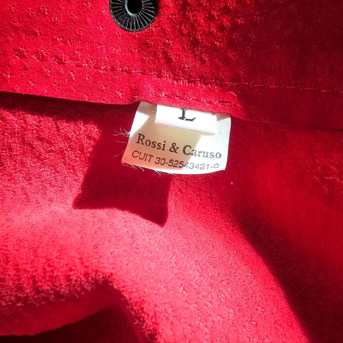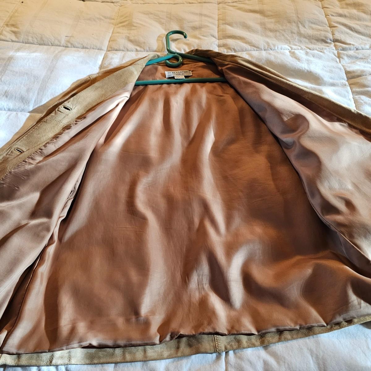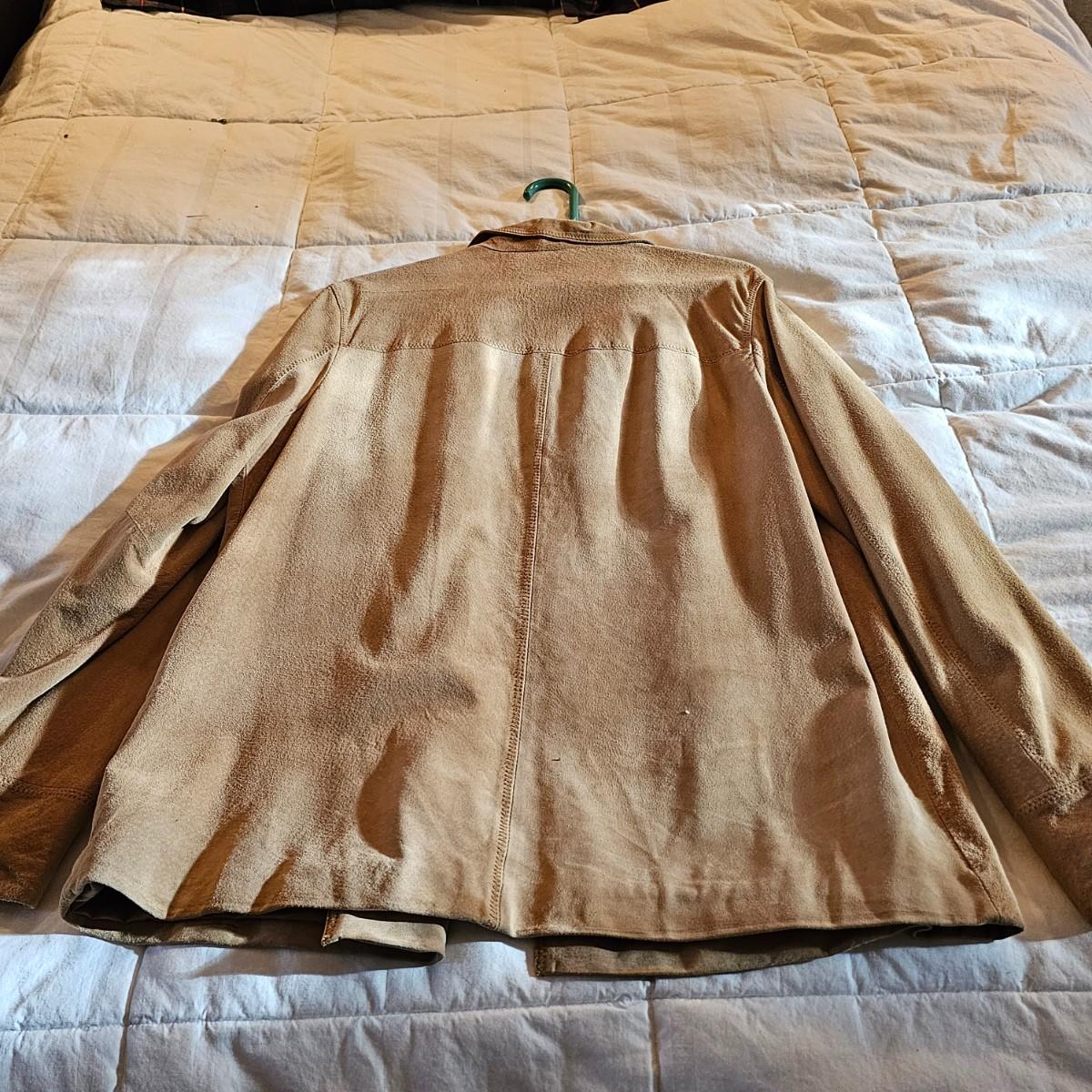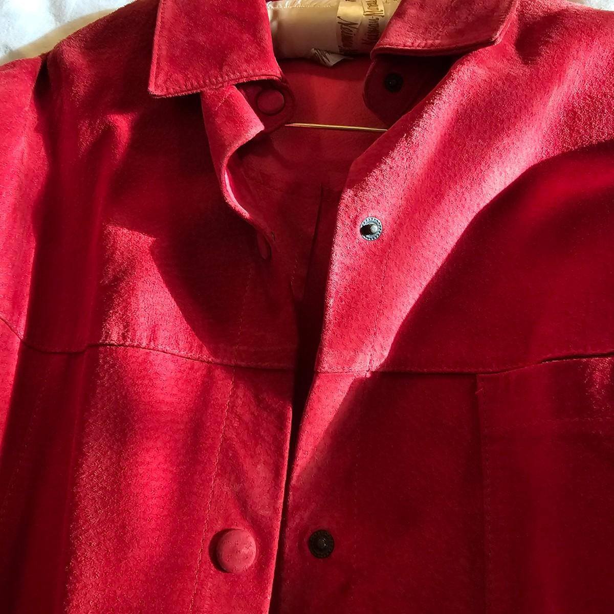A trio of ladies fine fashion jackets in leather, suede and broadcloth. Camel color item is all leather with polyester lining, size L, by Saks Fifth Ave. Deep red item is by Rossi & Caruso, size L, is suede. Patterned jacket is by Susan McDuffie, is cloth with suede collar and cuffs. See photos for details. Shipping available.